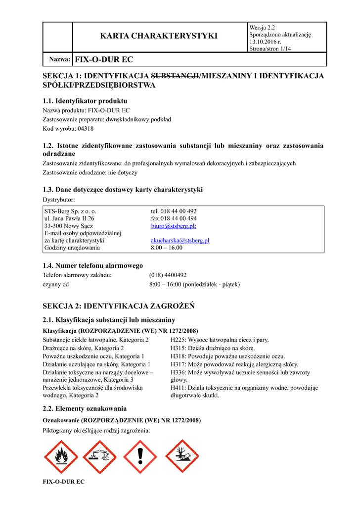 KARTA CHARAKTERYSTYKI Nazwa: Wersja 2.2 Sporządzono aktualizację 13.10.2016 r. Strona/stron 1/14 FIX-O-DUR EC SEKCJA 1: IDENTYFIKACJA SUBSTANCJI/MIESZANINY I IDENTYFIKACJA SPÓŁKI/PRZEDSIĘBIORSTWA 1.1. Identyfikator produktu Nazwa produktu: FIX-O-DUR EC Zastosowanie preparatu: dwuskładnikowy podkład Kod wyrobu: 04318 1.2. Istotne zidentyfikowane zastosowania substancji lub mieszaniny oraz zastosowania odradzane Zastosowanie zidentyfikowane: do profesjonalnych wymalowań dekoracyjnych i zabezpieczających Zastosowanie odradzane: nie dotyczy 1.3. Dane dotyczące dostawcy karty charakterystyki Dystrybutor: STS-Berg Sp. z o. o. ul. Jana Pawła II 26 33-300 Nowy Sącz E-mail osoby odpowiedzialnej za kartę charakterystyki Godziny urzędowania tel. 018 44 00 492 fax.018 44 00 494 [email protected]; [email protected] 8.00 – 16.00 1.4. Numer telefonu alarmowego Telefon alarmowy zakładu: czynny od (018) 4400492 8:00 – 16:00 (poniedziałek - piątek) SEKCJA 2: IDENTYFIKACJA ZAGROŻEŃ 2.1. Klasyfikacja substancji lub mieszaniny Klasyfikacja (ROZPORZĄDZENIE (WE) NR 1272/2008) Substancje ciekłe łatwopalne, Kategoria 2 H225: Wysoce łatwopalna ciecz i pary. Drażniące na skórę, Kategoria 2 H315: Działa drażniąco na skórę. Poważne uszkodzenie oczu, Kategoria 1 H318: Powoduje poważne uszkodzenie oczu. Działanie uczulające na skórę, Kategoria 1 H317: Może powodować reakcję alergiczną skóry. Działanie toksyczne na narządy docelowe – H336: Może wywoływać uczucie senności lub zawroty narażenie jednorazowe, Kategoria 3 głowy. Przewlekła toksyczność dla środowiska H411: Działa toksycznie na organizmy wodne, powodując wodnego, Kategoria 2 długotrwałe skutki. 2.2. Elementy oznakowania Oznakowanie (ROZPORZĄDZENIE (WE) NR 1272/2008) Piktogramy określające rodzaj zagrożenia: FIX-O-DUR EC Wersja 2.2 Sporządzono aktualizację 13.10.2016 r. Strona/stron 2/14 KARTA CHARAKTERYSTYKI Nazwa: FIX-O-DUR EC Hasło ostrzegawcze: NIEBEZPIECZEŃSTWO Zwroty wskazujące rodzaj zagrożenia: H225 Wysoce łatwopalna ciecz i pary. H315 Działa drażniąco na skórę. H317 Może powodować reakcję alergiczną skóry. H318 Powoduje poważne uszkodzenie oczu. H336 Może wywoływać uczucie senności lub zawroty głowy. H411 Działa toksycznie na organizmy wodne, powodując długotrwałe skutki. Zwroty wskazujące środki ostrożności: Zapobieganie: P210 Przechowywać z dala od źródeł ciepła, gorących powierzchni, źródeł iskrzenia, otwartego ognia i innych źródeł zapłonu. Nie palić. P233 Przechowywać pojemnik szczelnie zamknięty. P261 Unikać wdychania par. Reagowanie: P305 + P351 + P338 + P310 W PRZYPADKU DOSTANIA SIĘ DO OCZU: Ostrożnie płukać wodą przez kilka minut. Wyjąć soczewki kontaktowe, jeżeli są i można je łatwo usunąć. Nadal płukać. Natychmiast skontaktować się z OŚRODKIEM ZATRUĆ lub lekarzem. P362 + P364 Zanieczyszczoną odzież zdjąć i wyprać przed ponownym użyciem. P370 + P378 W przypadku pożaru: Użyć suchy piasek, suche proszki gaśnicze lub pianę alkoholoodporną do gaszenia. Niebezpieczne składniki muszą być wymienione na etykiecie: Nr CAS 123-86-4 Octan n-butylu Nr CAS 78-83-1 2-metylopropan-1-ol Nr CAS 25068-38-6 Produkt reakcji bisfenolu A z epichlorohydryną; Żywica epoksydowa (średnia masa cząsteczkowa 700–1100) SEKCJA 3: SKŁAD/ INFORMACJA O SKŁADNIKACH 3.2. Mieszaniny Typ związku: Ciekła zabarwiona dyspersja. Składniki stwarzające zagrożenie Nazwa substancji Nr CAS Nr WE Nr Rejestracji Dimetylobenzen – mieszanina izomerów 1330-20-7 215-535-7 01-2119488216-32 601-022-00-9 Flam. Liq. 3; H226 Acute Tox. 4; H332 Acute Tox. 4; H312 Skin Irrit. 2; H315 Bis[otrofosforan(V)] tricynku 7779-90-0 231-944-3 01-2119485044-40 030-011-00-6 Aquatic Acute 1; H400 Aquatic Chronic 1; H410 >= 2,5 - < 5 2-metylopropan-1-ol 78-83-1 201-148-0 01-2119484609-23 603-108-00-1 Flam. Liq. 3; H226 STOT SE 3; H335; H336 Skin Irrit. 2; H315 Eye dam. 1; H318 >=1-<5 603-074-00-8 Skin Irrit. 2; H315 Eye Irrit. 2; H319 Skin Sens. 1; H317 Produkt reakcji 25068-38-6 bisfenolu A z epichlorohydryną; Żywica epoksydowa nd* (średnia masa cząsteczkowa 700–1100) FIX-O-DUR EC Nr Indeksowy Klasyfikacja (Rozporządzenie 1272/2008) Stężenie % (C.) >=5-<10 >= 1 - < 5 Wersja 2.2 Sporządzono aktualizację 13.10.2016 r. Strona/stron 3/14 KARTA CHARAKTERYSTYKI Nazwa: FIX-O-DUR EC Polimer mocznikowoformaldehydowy 1metoksypropan-2-ol 68002-18-6 nd* Butan-1-ol 71-36-3 200-751-6 01-2119484630-38 Fenol - Aquatic Chronic 4; H413 >= 1 - < 5 603-004-00-6 Flam. Liq. 3; H226 Acute Tox. 4; H302 Skin Irrit. 2; H315 Eye Dam. 1; H318 STOT SE 3; H336 STOT SE 3; H335 >= 1 - < 5 108-95-2 203-632-7 01-2119471329-32 604-001-00-2 Acute Tox. 3; H301 Acute Tox. 3; H331 Acute Tox. 3; H311 Skin Corr. 1B; H314 Muta. 2; H341 STOT RE 2; H373 Aquatic Chronic 2; H411 Formaldehyd 50-00-0 200-001-8 01-2119488953-20 605-001-00-5 Flam. Liq. 3; H226 Acute Tox. 3; H301 Acute Tox. 3; H331 Acute Tox. 3; H311 Skin Corr. 1B; H314 Skin Sens. 1; H317 Muta. 2; H341 Carc. 1B; H350 <0,1 Octan n-butylu 123-86-4 204-658-1 01-2119485493-29 607-025-00-1 EUH066 Flam. Liq. 3; H226 STOT SE 3; H336 >= 25 - < 30 Etanol 64-17-5 200-578-6 01-2119457610-43 603-002-00-5 Flam. Liq.2; H225 >=20-<25 Dwutlenek tytanu 13463-67-7 236-675-5 01-2119489379-17 - - >=5-<10 Talk (krzemian magnzezu uwodniony) 14807-96-6 238-877-9 nd* - - >= 1 - < 5 >= 0,1 - < 1 *numer rejestracji będzie dostępny po zarejestrowaniu danej substancji przez jej producenta Pełny tekst symboli (H) znajduje się w sekcji 16. SEKCJA 4: ŚRODKI PIERWSZEJ POMOC 4.1. Opis środków pierwszej pomocy Porady ogólne: W przypadku utrzymujących się objawów lub jakichkolwiek wątpliwości zasięgnąć porady medycznej. Nieprzytomnej osobie nigdy nie podawać nic doustnie. W przypadku wdychania: Wynieść na świeże powietrze. Zapewnić poszkodowanemu ciepło i spokój. W przypadku nieregularnego lub zatrzymanego oddechu zastosować sztucz