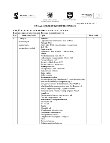 Załącznik nr 1 do SWIZ WYKAZ SPRZĘTU KOMPUTEROWEGO CZĘŚĆ I – PUBLICZNA SZKOŁA PODSTAWOWA NR 1 Laptop z oprogramowaniem do zajęć logopedycznych L.p. Nazwa artykułu Opis 1 Laptop o minimalnych parametrach wymienionych obok Procesor Częstotliwość taktowania: min. 2.1GHz Pamięć RAM Ilość: min. 4 GB z możliwością rozszerzenia do 8 GB Dysk twardy Pojemność: min. 320 GB (7200 obr/min) Ekran Przekątna (cale): min. 15.6 " Maksymalna rozdzielczość: 1366 x 768 Format obrazu: 16:9 Rodzaj podświetlenia: LED Rodzaj matrycy: błyszcząca Karta graficzna Ilość pamięci: min. 1024 MB Typ pamięci: własna Dane ogólne Kolor: czarny System operacyjny System operacyjny: Windows® 7 Home Premium 64bit lub równoważny współpracujący z oprogramowaniem EduSensus LOGOPEDIA. Multimedialne oprogramowanie do diagnozy i terapii logopedycznej z wyposażeniem pomocniczym.” firmy Young Digital Planet Interfejsy Zintegrowana kamera internetowa: tak Czytnik kart pamięci: tak Komunikacja bezprzewodowa Bluetooth: tak Wi-Fi: tak Audio Głośniki: tak Wbudowany mikrofon: tak Dodatkowe informacje Zintegrowana kamera Urządzenia wskazujące Touchpad Mysz Torba na laptopa Dokumentacja techniczna Ilość sztuk 1 CZĘŚĆ II - PUBLICZNA SZKOŁA PODSTAWOWA NR 1 Drukarka do prowadzenia zajęć logopedycznych: L.p. Nazwa artykułu Opis 1 Drukarka o minimalnych parametrach wymienionych obok FormatA4 prędkość druku w czerni16 str/min prędkość druku w kolorze12 str/min Rozdzielczość druku: Mono: Up to 600 dpi Color: Up to 4800 x 1200 dpi Druk Photo: tak Interfejs: USB Podajnik papieru: 60 kartek Odbiornik papieru: 25 kartek Druk dwustronny: ręczny Gwarancja: min.12 miesięcy CZĘŚĆ III - PUBLICZNA SZKOŁA PODSTAWOWA NR 2 Wizualizer do zajęć matematycznych: L.p. Nazwa artykułu Opis 1 Wizualizer o minimalnych parametrach wymienionych obok Przetwornik 1/4" C-MOS, Rozdzielczość efetywna przetwornika 1,600 (H) x 1,200 (V), Szybkość przetwornika 15 klatek / sec., Obiektyw F3.0, f=3.39 mm, Maksymalny obszar skanowania 340 x 255 mm, Minimalny obszar skanowania 50 x 40 mm, Zoom cyfrowy 6x, Wyjście RGB Mini D-Sub 15 -pin, Wyjście Composite - Chinch, Wejście RGB Mini D-Sub 15 -pin, USB 2.0 Typ B, CZĘŚĆ IV – PUBLICZNA SZKOŁA PODSTAWOWA NR 3 Laptop z oprogramowaniem do zajęć logopedycznych L.p. Nazwa artykułu Opis 1 Laptop o minimalnych parametrach wymienionych obok Procesor Częstotliwość taktowania: min. 2.1GHz Pamięć RAM Ilość: min. 4 GB z możliwością rozszerzenia do 8 GB Dysk twardy Pojemność: min. 320 GB (7200 obr/min) Ekran Przekątna (cale): min. 15.6 " Maksymalna rozdzielczość: 1366 x 768 Format obrazu: 16:9 Rodzaj podświetlenia: LED Rodzaj matrycy: błyszcząca Karta graficzna Ilość pamięci: min. 1024 MB Typ pamięci: własna Ilość sztuk 1 Ilość sztuk 1 Ilość sztuk 1 Dane ogólne Kolor: czarny System operacyjny System operacyjny: Windows® 7 Home Premium 64bit lub równoważny współpracujący z oprogramowaniem EduSensus LOGOPEDIA. Multimedialne oprogramowanie do diagnozy i terapii logopedycznej z wyposażeniem pomocniczym.” firmy Young Digital Planet Interfejsy Zintegrowana kamera internetowa: tak Czytnik kart pamięci: tak Komunikacja bezprzewodowa Bluetooth: tak Wi-Fi: tak Audio Głośniki: tak Wbudowany mikrofon: tak Dodatkowe informacje Zintegrowana kamera Urządzenia wskazujące Touchpad Mysz Torba na laptopa Dokumentacja techniczna CZĘŚĆ V – PUBLICZNA SZKOŁA PODSTAWOWA NR 4 Laptop z oprogramowaniem do zajęć specjalistycznych dla dzieci z trudnościami w czytaniu i pisaniu: L.p. Nazwa artykułu Ilość sztuk Opis 1 Laptop o minimalnych parametrach wymienionych obok Procesor Częstotliwość taktowania: min. 2.1GHz Pamięć RAM Ilość: min. 4 GB z możliwością rozszerzenia do 8 GB Dysk twardy Pojemność: min. 320 GB (7200 obr/min) Ekran Przekątna (cale): min. 15.6 " Maksymalna rozdzielczość: 1366 x 768 Format obrazu: 16:9 Rodzaj podświetlenia: LED Rodzaj matrycy: błyszcząca Karta graficzna Ilość pamięci: min. 1024 MB Typ pamięci: własna Dane ogólne Kolor: czarny System operacyjny System operacyjny: Windows® 7 Home Premium 64bit lub równoważny współpracujący z oprogramowaniem: „EduSensus DYSLEKSJA. Multimedialne oprogramowanie wspomagające profilaktykę oraz terapię pedagogiczną trudności w czytaniu i pisaniu” firmy Young Digital Planet 1 Interfejsy Zintegrowana kamera internetowa: tak Czytnik kart pamięci: tak Komunikacja bezprzewodowa Bluetooth: tak Wi-Fi: tak Audio Głośniki: tak Wbudowany mikrofon: tak Dodatkowe informacje Zintegrowana kamera Urządzenia wskazujące Touchpad Mysz Torba na laptopa Dokumentacja techniczna CZĘŚĆ VI – PUBLICZNA SZKOŁA PODSTAWOWA NR 6 Laptop z oprogramowaniem do kółka matematycznego L.p. Nazwa artykułu Opis 1 Laptop o minimalnych parametrach wymienionych obok Procesor Częstotliwość taktowania: min. 2.1GHz Pamięć RAM Ilość: min. 4 GB z możliwością rozszerzenia do 8 GB Dysk twardy Pojemność: min. 320 GB (7200 obr/min) Ekran Przekątna (cale): min. 15.6 " Maksymalna rozdzielczość: 1366 x 768 Format obrazu: 16:9 Rodzaj podświetlenia: LED Rodzaj matrycy: błyszcząca Karta graficzna Ilość pamięci: min. 1024 MB Typ pamięci: własna Dane ogólne Kolor: czarny System operacyjny System operacyjny: Windows® 7 Home Premium 64bit lub równoważny współpracujący z oprogramowaniem EduSensus Matematyka – terapia pedagogiczna. MatŚwiat – program do diagnozy i terapii specyficznych trudności w nauce matematyki Young Digital Planet Interfejsy Zintegrowana kamera internetowa: tak Czytnik kart pamięci: tak Komunikacja bezprzewodowa Bluetooth: tak Wi-Fi: tak Audio Głośniki: tak Wbudowany mikrofon: tak Dodatkowe informacje Ilość sztuk 1 Zintegrowana kamera Urządzenia wskazujące Touchpad Mysz Torba na laptopa Dokumentacja techniczna