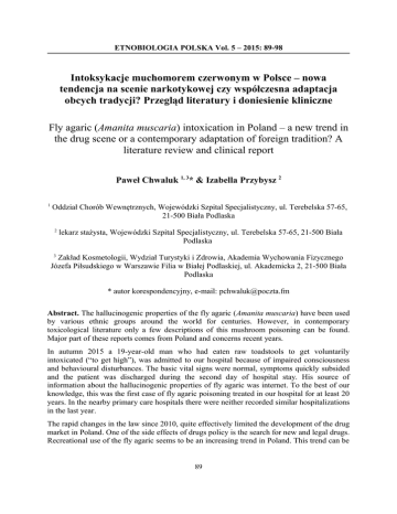 ETNOBIOLOGIA POLSKA Vol. 5 – 2015: 89-98 Intoksykacje muchomorem czerwonym w Polsce – nowa tendencja na scenie narkotykowej czy współczesna adaptacja obcych tradycji? Przegląd literatury i doniesienie kliniczne Fly agaric (Amanita muscaria) intoxication in Poland – a new trend in the drug scene or a contemporary adaptation of foreign tradition? A literature review and clinical report Paweł Chwaluk 1, 3* & Izabella Przybysz 2 1 Oddział Chorób Wewnętrznych, Wojewódzki Szpital Specjalistyczny, ul. Terebelska 57-65, 21-500 Biała Podlaska 2 lekarz stażysta, Wojewódzki Szpital Specjalistyczny, ul. Terebelska 57-65, 21-500 Biała Podlaska 3 Zakład Kosmetologii, Wydział Turystyki i Zdrowia, Akademia Wychowania Fizycznego Józefa Piłsudskiego w Warszawie Filia w Białej Podlaskiej, ul. Akademicka 2, 21-500 Biała Podlaska * autor korespondencyjny, e-mail: [email protected] Abstract. The hallucinogenic properties of the fly agaric (Amanita muscaria) have been used by various ethnic groups around the world for centuries. However, in contemporary toxicological literature only a few descriptions of this mushroom poisoning can be found. Major part of these reports comes from Poland and concerns recent years. In autumn 2015 a 19-year-old man who had eaten raw toadstools to get voluntarily intoxicated (“to get high”), was admitted to our hospital because of impaired consciousness and behavioural disturbances. The basic vital signs were normal, symptoms quickly subsided and the patient was discharged during the second day of hospital stay. His source of information about the hallucinogenic properties of fly agaric was internet. To the best of our knowledge, this was the first case of fly agaric poisoning treated in our hospital for at least 20 years. In the nearby primary care hospitals there were neither recorded similar hospitalizations in the last year. The rapid changes in the law since 2010, quite effectively limited the development of the drug market in Poland. One of the side effects of drugs policy is the search for new and legal drugs. Recreational use of the fly agaric seems to be an increasing trend in Poland. This trend can be 89 enhanced by Polish mycophilia, as well as the popularization of foreign tradition of using toadstools on Polish internet forums. Key words: Amanita muscaria poisoning, mycophilia, drug scene in Poland Wstęp Muchomor czerwony (Amanita muscaria (L.) Lam.) to kosmopolityczny grzyb, którego rodzimym środowiskiem są lasy strefy klimatu umiarkowanego półkuli północnej. W wielu krajach, w tym i w Polsce, należy do najłatwiej rozpoznawanych gatunków grzybów wielkoowocnikowych, a jego obraz w naszym kontekście kulturowym uzyskał ikoniczny charakter – z jednej strony symbolizuje cały świat grzybów, z drugiej zaś jest znakiem kojarzonym z trucizną (Łuczaj 2011). Nazwa muchomorów w wielu językach (np. w rosyjskim – muchomor, w angielskim fly agaric, w niemieckim Fliegenpilz, we francuskim amanite tue-mouche, we włoskim moscario), odzwierciedla ludową praktykę stosowania wyciągów z tych grzybów do zwalczania, a właściwie odurzania much domowych (Härkönen 1998, Michelot & Melendez-Howell 2003). Różne narody, przede wszystkim zamieszkujące tereny Syberii, od wieków wykorzystywały, i w pewnym zakresie nadal wykorzystują, w rozmaitych celach odurzające właściwości muchomora (Härkönen 1998, Biziulevicius & Vaitkuviene 2007, Crocq 2007). Grzyb ten jest niekiedy uznawany za najstarszy nośnik substancji halucynogennych, używany nawet 10000 lat temu (Guzman 2001, Maciejczyk & Kafarski 2013). W drugiej połowie ubiegłego wieku R. G. Wasson (1968) utożsamił starożytny halucynogenny napój Soma opisany w Wedach, świętych księgach hinduizmu, z sokiem wyciskanym z muchomora czerwonego. Hipoteza ta, wielokrotnie poddawana w wątpliwość lub potwierdzana, do dziś intryguje badaczy reprezentujących różne dyscypliny naukowe od antropologii po biochemię (Feeney 2010). Ludowe zastosowania muchomorów nie zawsze mają związek z ich działaniem psychoaktywnym. Przed kilkoma laty pojawiło się doniesienie o żywej wciąż wśród wschodnich Słowian – Rosjan, Białorusinów i Ukraińców, praktyce miejscowego stosowania nalewki spirytusowej z muchomora czerwonego w przypadkach urazów, ukąszeń owadów i chorób reumatycznych. Przypuszcza się, że preparat ten ma skuteczne działanie przeciwzapalne (Biziulevicius & Vaitkuviene 2007). Choć celowe spożywanie muchomora czerwonego w celu odurzenia się zostało wyczerpująco opisane w aspekcie etnomykologicznym, to współczesna literatura toksykologiczna zawiera tylko pojedyncze opisy takich przypadków (Hohn & Schoenemann 2000, Satora et al. 2005a, Brvar et al. 2006, Łukasik-Głębocka et al. 2011). Wśród lekarzy w Polsce, może za wyjątkiem wąskiej grupy toksykologów, problem ten wydaje się mało znany nie tylko z powodu skąpej obecności w piśmiennictwie, ale przede wszystkim ze względu na rzadkość jego występowania w codziennej praktyce. Sezonowe zatrucia grzybami dziko rosnącymi są w naszym kraju dość powszechne. Ponieważ jednak śmiertelne zagrożenie wiąże się niemal wyłącznie ze spożyciem muchomora zielonawego (Amanita phalloides (Vaill. ex Fr.) Link), diagnostyka jest skupiona na wykluczeniu zatrucia tym gatunkiem, inne niejako lekceważąc. Jeden z autorów tego artykułu (PCh) w ponad dwudziestoletniej pracy w dużym wielospecjalistycznym szpitalu po raz pierwszy spotkał osobę zatrutą muchomorem czerwonym, przyjmowanym w celach rekreacyjnych. Również wzmianki z Polski o 90 podobnych przypadkach dotyczą głównie ostatnich lat. Być może jest to sygnał nowego trendu na scenie narkotykowej. W pracy przedstawiono doniesienie kliniczne dotyczące zatrucia muchomorem czerwonym spożywanym w celu odurzenia się, jak również wspomniano o sondażu telefonicznym dotyczącym podobnych przypadków w sąsiednich szpitalach środk