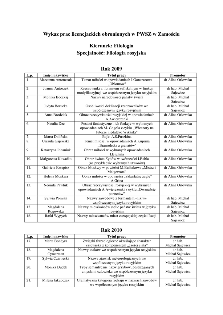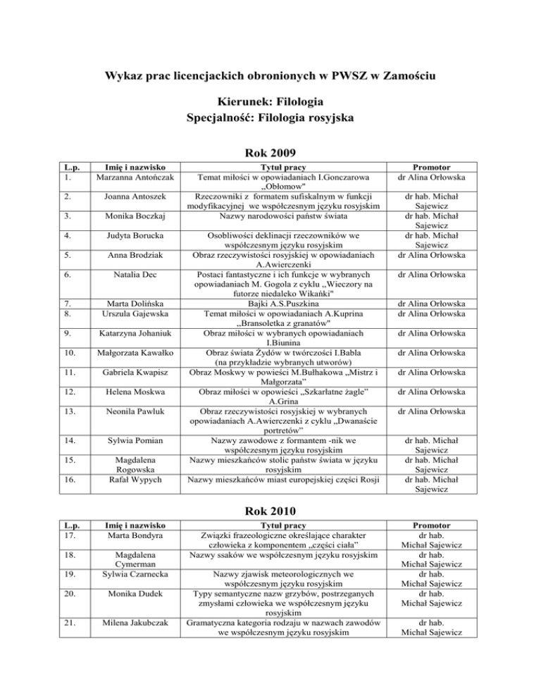 Wykaz prac licencjackich obronionych w PWSZ w Zamościu Kierunek: Filologia Specjalność: Filologia rosyjska Rok 2009 L.p. 1. Imię i nazwisko Marzanna Antończak 2. Joanna Antoszek 3. Monika Boczkaj 4. Judyta Borucka 5. Anna Brodziak 6. Natalia Dec 7. 8. Marta Dolińska Urszula Gajewska 9. Katarzyna Johaniuk 10. Małgorzata Kawałko 11. Gabriela Kwapisz 12. Helena Moskwa 13. Neonila Pawluk 14. Sylwia Pomian 15. Magdalena Rogowska Rafał Wypych 16. Tytuł pracy Temat miłości w opowiadaniach I.Gonczarowa ,,Obłomow" Rzeczowniki z formatem sufiskalnym w funkcji modyfikacyjnej we współczesnym języku rosyjskim Nazwy narodowości państw świata Osobliwości deklinacji rzeczowników we współczesnym języku rosyjskim Obraz rzeczywistości rosyjskiej w opowiadaniach A.Awierczenki Postaci fantastyczne i ich funkcje w wybranych opowiadaniach M. Gogola z cyklu ,,Wieczory na futorze niedaleko Wikańki" Bajki A.S.Puszkina Temat miłości w opowiadaniach A.Kuprina ,,Bransoletka z granatów" Obraz miłości w wybranych opowiadaniach I.Biunina Obraz świata śydów w twórczości I.Babla (na przykładzie wybranych utworów) Obraz Moskwy w powieści M.Bułhakowa „Mistrz i Małgorzata” Obraz miłości w opowieści „Szkarłatne Ŝagle” A.Grina Obraz rzeczywistości rosyjskiej w wybranych opowiadaniach A.Awierczenki z cyklu „Dwanaście portretów” Nazwy zawodowe z formantem -nik we współczesnym języku rosyjskim Nazwy mieszkańców stolic państw świata w języku rosyjskim Nazwy mieszkańców miast europejskiej części Rosji Promotor dr Alina Orłowska dr hab. Michał Sajewicz dr hab. Michał Sajewicz dr hab. Michał Sajewicz dr Alina Orłowska dr Alina Orłowska dr Alina Orłowska dr Alina Orłowska dr Alina Orłowska dr Alina Orłowska dr Alina Orłowska dr Alina Orłowska dr Alina Orłowska dr hab. Michał Sajewicz dr hab. Michał Sajewicz dr hab. Michał Sajewicz Rok 2010 L.p. 17. Imię i nazwisko Marta Bondyra 18. 19. Magdalena Cymerman Sylwia Czarnecka 20. Monika Dudek 21. Milena Jakubczak Tytuł pracy Związki frazeologiczne określające charakter człowieka z komponentem „części ciała” Nazwy ssaków we współczesnym języku rosyjskim Nazwy zjawisk meteorologicznych we współczesnym języku rosyjskim Typy semantyczne nazw grzybów, postrzeganych zmysłami człowieka we współczesnym języku rosyjskim Gramatyczna kategoria rodzaju w nazwach zawodów we współczesnym języku rosyjskim Promotor dr hab. Michał Sajewicz dr hab. Michał Sajewicz dr hab. Michał Sajewicz dr hab. Michał Sajewicz dr hab. Michał Sajewicz 22. Justyna Janeczko Nazwy ptaków we współczesnym języku rosyjskim 23. Aleksandr Jeromin 24. Beata Kuma 25. Justyna Matwiej 26. Marta Pastuszek 27. Beata Plebanek 28. Katarzyna Przybył 29. Małgorzata Sikorska 30. Mariola Strycharz 31. Diana Zwolan śycie oficerów w powieści A. Puszkina „Córka kapitana” ,,Nowi Ruscy'' w prozie Darii Doncowej na przykładzie wybranych utworów Obraz szczęścia rodzinnego w powieści Lwa Tołstoja „Szczęście rodzinne” Obraz kobiety szlachcianki w „Opowieściach świętej pamięci Iwana Pietrowicza Biełkina” Obraz bohatera w wybranych opowiadaniach Wsiewołoda Garszyna Nazwy nosicieli cech, motywowane przymiotnikami określającymi wygląd zewnętrzny i osobowość człowieka Frazeologizmy z komponentem „zwierze” określające negatywne cechy charakteru człowieka we współczesnym języku rosyjskim Nazwy grzybów ze względu na ich barwę we współczesnym języku rosyjskim Gramatyczna kategoria rodzaju w nazwach istot Ŝywych we współczesnym języku rosyjskim dr hab. Michał Sajewicz dr Alina Orłowska dr Alina Orłowska dr Alina Orłowska dr Alina Orłowska dr Alina Orłowska dr hab. Michał Sajewicz dr hab. Michał Sajewicz dr hab. Michał Sajewicz dr hab. Michał Sajewicz Rok 2011 L.p. 32. Imię i nazwisko Michał Bryk 33. Katarzyna Chmiel 34. Aleksandra CzyŜ 35. Agata Harasim 36. Ewa Rębisz 37. Łukasz Sierpiński 38. Iwona Sobstyl 39. Joanna Stasiak 40. Wioleta Ziemian Tytuł pracy Sposoby wyraŜania przydawek w utworze literackim Darii Doncowej „Manikiur dla nieboszczyka” Metaforyczne nazwy osób we współczesnym języku rosyjskim Obraz świata pozagrobowego i jego funkcje w opowiadaniach W. Odojewskiego „śywy trup” i F. Dostojewskiego „Babok” Nazwy zawodów z formantem -czik, -szczik we współczesnym języku rosyjskim Obrazy chłopów w poemacie Mikołaja Niekrasowa „Komu na Rusi dobrze się dzieje” Sposoby wyraŜania okoliczników w wybranych utworach Darii Doncowej „Zjawa w adidasach” Formy hipokorystyczne najbardziej popularnych męskich imion rosyjskich Motyw miłości w „Wieczorach na chutorze niedaleko Dikańki” Mikołaja Gogola (na przykładzie wybranych utworów) Opowieści obyczajowe 2 płowy XVII wieku. Problematyka. Obrazy bohaterów Promotor dr hab. Michał Sajewicz dr hab. Michał Sajewicz dr Alina Orłowska dr hab. Michał Sajewicz dr Alina Orłowska dr hab. Michał Sajewicz dr hab. Michał Sajewicz dr Alina Orłowska dr Alina Orłowska Rok 2012 L.p. 41. Imię i nazwisko Magdalena Burda 42. Patrycja Celej 43. Małgorzata Koczwara Barbara Kutek 44. Tytuł pracy Nazwy grzybów tworzących symbiozę z drzewami i innymi roślinami we współczesnym języku rosyjskim Dama modna i kokietka w opowieściach Aleksandra Puszkina z cyklu „Opowieści świętej pamięci Iwana Pietrowicza Biełkina” Sufiksalne formy hipokorystyczne najbardziej popularnych Ŝeńskich imion rosyjskich Nazwy zawodów z formantami -nik, -lnik we współczesnym języku rosyjskim Promotor dr hab. Michał Sajewicz dr Alina Orłowska dr hab. Michał Sajewicz dr hab. Michał Sajewicz 45. Dorota Maciuk 46. Anastasja Nikonczuk 47. Svetlana Pozdnyakova Antoni Reguła Urszula Strokina Tatiana Toropowska 48. 49. 50. 51. Anastazja Wachowska Nazwy zawodów z formantami -scik, -cik we współczesnym języku rosyjskim Formy hipokorystyczne najbardziej popularnych Ŝeńskich imion rosyjsk