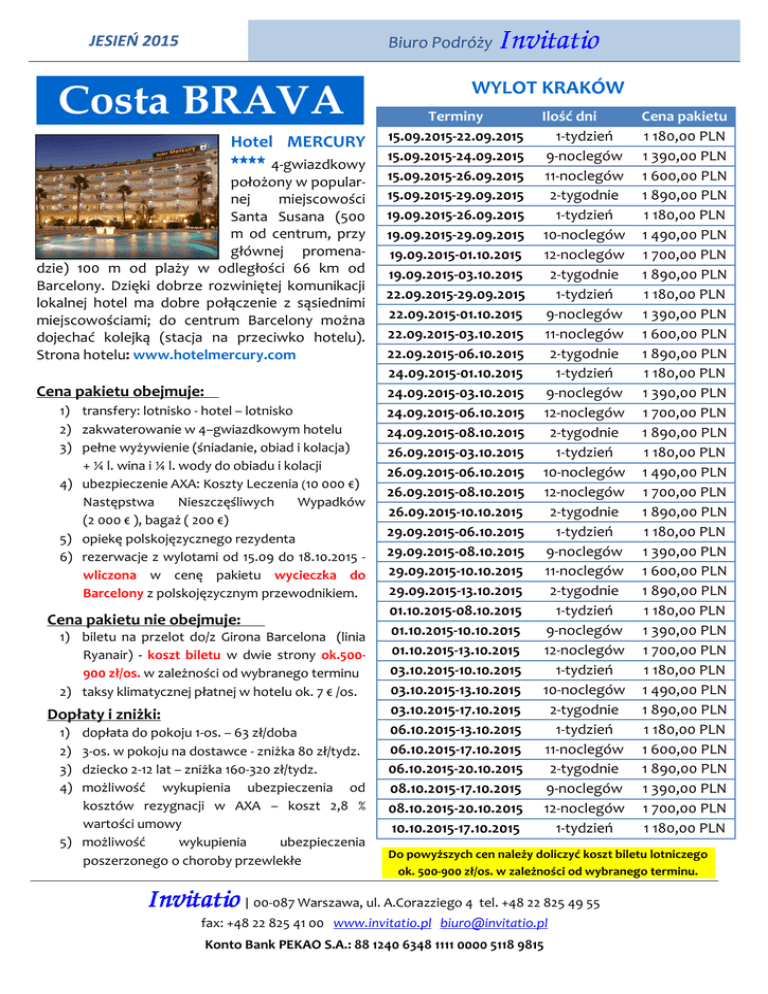 JESIEŃ 2015 Biuro Podróży . Costa BRAVA . Hotel MERCURY **** 4-gwiazdkowy położony w popularnej miejscowości Santa Susana (500 m od centrum, przy głównej promenadzie) 100 m od plaży w odległości 66 km od Barcelony. Dzięki dobrze rozwiniętej komunikacji lokalnej hotel ma dobre połączenie z sąsiednimi miejscowościami; do centrum Barcelony można dojechać kolejką (stacja na przeciwko hotelu). Strona hotelu: www.hotelmercury.com Cena pakietu obejmuje: 1) transfery: lotnisko - hotel – lotnisko 2) zakwaterowanie w 4–gwiazdkowym hotelu 3) pełne wyżywienie (śniadanie, obiad i kolacja) + ¼ l. wina i ¼ l. wody do obiadu i kolacji 4) ubezpieczenie AXA: Koszty Leczenia (10 000 €) Następstwa Nieszczęśliwych Wypadków (2 000 € ), bagaż ( 200 €) 5) opiekę polskojęzycznego rezydenta 6) rezerwacje z wylotami od 15.09 do 18.10.2015 wliczona w cenę pakietu wycieczka do Barcelony z polskojęzycznym przewodnikiem. Cena pakietu nie obejmuje: 1) biletu na przelot do/z Girona Barcelona (linia Ryanair) - koszt biletu w dwie strony ok.500900 zł/os. w zależności od wybranego terminu 2) taksy klimatycznej płatnej w hotelu ok. 7 € /os. Dopłaty i zniżki: 1) 2) 3) 4) dopłata do pokoju 1-os. – 63 zł/doba 3-os. w pokoju na dostawce - zniżka 80 zł/tydz. dziecko 2-12 lat – zniżka 160-320 zł/tydz. możliwość wykupienia ubezpieczenia od kosztów rezygnacji w AXA – koszt 2,8 % wartości umowy 5) możliwość wykupienia ubezpieczenia poszerzonego o choroby przewlekłe WYLOT KRAKÓW Terminy 15.09.2015-22.09.2015 15.09.2015-24.09.2015 15.09.2015-26.09.2015 15.09.2015-29.09.2015 19.09.2015-26.09.2015 19.09.2015-29.09.2015 19.09.2015-01.10.2015 19.09.2015-03.10.2015 22.09.2015-29.09.2015 22.09.2015-01.10.2015 22.09.2015-03.10.2015 22.09.2015-06.10.2015 24.09.2015-01.10.2015 24.09.2015-03.10.2015 24.09.2015-06.10.2015 24.09.2015-08.10.2015 26.09.2015-03.10.2015 26.09.2015-06.10.2015 26.09.2015-08.10.2015 26.09.2015-10.10.2015 29.09.2015-06.10.2015 29.09.2015-08.10.2015 29.09.2015-10.10.2015 29.09.2015-13.10.2015 01.10.2015-08.10.2015 01.10.2015-10.10.2015 01.10.2015-13.10.2015 03.10.2015-10.10.2015 03.10.2015-13.10.2015 03.10.2015-17.10.2015 06.10.2015-13.10.2015 06.10.2015-17.10.2015 06.10.2015-20.10.2015 08.10.2015-17.10.2015 08.10.2015-20.10.2015 10.10.2015-17.10.2015 Ilość dni 1-tydzień 9-noclegów 11-noclegów 2-tygodnie 1-tydzień 10-noclegów 12-noclegów 2-tygodnie 1-tydzień 9-noclegów 11-noclegów 2-tygodnie 1-tydzień 9-noclegów 12-noclegów 2-tygodnie 1-tydzień 10-noclegów 12-noclegów 2-tygodnie 1-tydzień 9-noclegów 11-noclegów 2-tygodnie 1-tydzień 9-noclegów 12-noclegów 1-tydzień 10-noclegów 2-tygodnie 1-tydzień 11-noclegów 2-tygodnie 9-noclegów 12-noclegów 1-tydzień Cena pakietu 1 180,00 PLN 1 390,00 PLN 1 600,00 PLN 1 890,00 PLN 1 180,00 PLN 1 490,00 PLN 1 700,00 PLN 1 890,00 PLN 1 180,00 PLN 1 390,00 PLN 1 600,00 PLN 1 890,00 PLN 1 180,00 PLN 1 390,00 PLN 1 700,00 PLN 1 890,00 PLN 1 180,00 PLN 1 490,00 PLN 1 700,00 PLN 1 890,00 PLN 1 180,00 PLN 1 390,00 PLN 1 600,00 PLN 1 890,00 PLN 1 180,00 PLN 1 390,00 PLN 1 700,00 PLN 1 180,00 PLN 1 490,00 PLN 1 890,00 PLN 1 180,00 PLN 1 600,00 PLN 1 890,00 PLN 1 390,00 PLN 1 700,00 PLN 1 180,00 PLN Do powyższych cen należy doliczyć koszt biletu lotniczego ok. 500-900 zł/os. w zależności od wybranego terminu. | 00-087 Warszawa, ul. A.Corazziego 4 tel. +48 22 825 49 55 fax: +48 22 825 41 00 www.invitatio.pl [email protected] Konto Bank PEKAO S.A.: 88 1240 6348 1111 0000 5118 9815 JESIEŃ 2015 Biuro Podróży . Costa BRAVA . Hotel MERCURY **** 4-gwiazdkowy położony w popularnej miejscowości Santa Susana (500 m od centrum, przy głównej promenadzie) 100 m od plaży w odległości 66 km od Barcelony. Dzięki dobrze rozwiniętej komunikacji lokalnej hotel ma dobre połączenie z sąsiednimi miejscowościami; do centrum Barcelony można dojechać kolejką (stacja na przeciwko hotelu). Strona hotelu: www.hotelmercury.com WYLOT KRAKÓW Terminy 10.10.2015-20.10.2015 10.10.2015-24.10.2015 13.10.2015-20.10.2015 13.10.2015-24.10.2015 17.10.2015-24.10.2015 Ilość dni 10-noclegów 2-tygodnie 1-tydzień 11-noclegów 1-tydzień Cena pakietu 1 490,00 PLN 1 890,00 PLN 1 180,00 PLN 1 600,00 PLN 1 180,00 PLN Do powyższych cen należy doliczyć koszt biletu lotniczego ok. 500-900 zł/os. w zależności od wybranego terminu. Cena pakietu obejmuje: 1) transfery: lotnisko - hotel – lotnisko 2) zakwaterowanie w 4–gwiazdkowym hotelu 3) pełne wyżywienie (śniadanie, obiad i kolacja) + ¼ l. wina i ¼ l. wody do obiadu i kolacji 4) ubezpieczenie AXA: Koszty Leczenia (10 000 €) Następstwa Nieszczęśliwych Wypadków (2 000 € ), bagaż ( 200 €) 5) opiekę polskojęzycznego rezydenta 6) rezerwacje z wylotami od 15.09 do 18.10.2015 wliczona w cenę pakietu wycieczka do Barcelony z polskojęzycznym przewodnikiem. Cena pakietu nie obejmuje: 1) biletu na przelot do/z Girona Barcelona (linia Ryanair) - koszt biletu w dwie strony ok.500900 zł/os. w zależności od wybranego terminu 2) taksy klimatycznej płatnej w hotelu ok. 7 € /os. Dopłaty i zniżki: 1) 2) 3) 4) dopłata do pokoju 1-os. – 63 zł/doba 3-os. w pokoju na dostawce - zniżka 80 zł/tydz. dziecko 2-12 lat – zniżka 160-320 zł/tydz. możliwość wykupienia ubezpieczenia od kosztów rezygnacji w AXA – koszt 2,8 % wartości umowy 5) możliwość wykupienia ubezpieczenia poszerzonego o choroby przewlekłe | 00-087 Warszawa, ul. A.Corazziego 4 tel. +48 22 825 49 55 fax: +48 22 825 41 00 www.invitatio.pl [email protected] Konto Bank PEKAO S.A.: 88 1240 6348 1111 0000 5118 9815