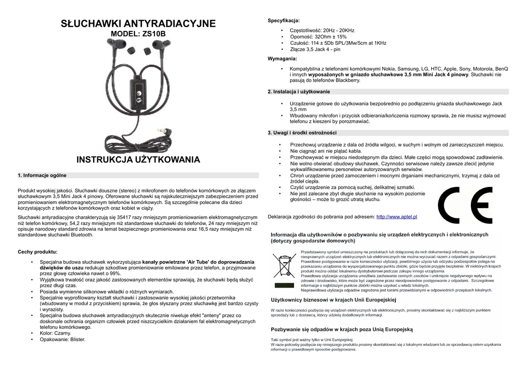SŁUCHAWKI ANTYRADIACYJNE Specyfikacja: • • • • MODEL: ZS10B Częstotliwość: 20Hz - 20KHz Oporność: 32Ohm ± 15% Czułość: 114 ± 5Db SPL/3Mw/5cm at 1KHz Złącze 3,5 Jack 4 - pin Wymagania: • Kompatybilna z telefonami komórkowymi Nokia, Samsung, LG, HTC, Apple, Sony, Motorola, BenQ i innych wyposażonych w gniazdo słuchawkowe 3,5 mm Mini Jack 4 pinowy. Słuchawki nie pasują do telefonów Blackberry. 2. Instalacja i użytkowanie • • Urządzenie gotowe do użytkowania bezpośrednio po podłączeniu gniazda słuchawkowego Jack 3,5 mm Wbudowany mikrofon i przycisk odbierania/kończenia rozmowy sprawia, że nie musisz wyjmować telefonu z kieszeni by porozmawiać. 3. Uwagi i środki ostrożności INSTRUKCJA UŻYTKOWANIA 1. Informacje ogólne Produkt wysokiej jakości. Słuchawki douszne (stereo) z mikrofonem do telefonów komórkowych ze złączem słuchawkowym 3,5 Mini Jack 4 pinowy. Oferowane słuchawki są najskuteczniejszym zabezpieczeniem przed promieniowaniem elektromagnetycznym telefonów komórkowych. Są szczególnie polecane dla dzieci korzystających z telefonów komórkowych oraz kobiet w ciąży. Słuchawki antyradiacyjne charakteryzują się 35417 razy mniejszym promieniowaniem elektromagnetycznym niż telefon komórkowy, 54,2 razy mniejszym niż standardowe słuchawki do telefonów, 24 razy mniejszym niż opisuje narodowy standard zdrowia na temat bezpiecznego promieniowania oraz 16,5 razy mniejszym niż standardowe słuchawki Bluetooth. Cechy produktu: • • • • • • • Specjalna budowa słuchawek wykorzystująca kanały powietrzne 'Air Tube' do doprowadzania dźwięków do uszu redukuje szkodliwe promieniowanie emitowane przez telefon, a przyjmowane przez głowę człowieka nawet o 99%. Wyjątkowa trwałość oraz jakość zastosowanych elementów sprawiają, że słuchawki będą służyć przez długi czas. Posiada wymienne silikonowe wkładki o różnych wymiarach. Specjalnie wyprofilowany kształt słuchawki i zastosowanie wysokiej jakości przetwornika (wbudowany w moduł z przyciskiem) sprawia, że głos słyszany przez słuchawkę jest bardzo czysty i wyrazisty. Specjalna budowa słuchawek antyradiacyjnych skutecznie niweluje efekt "anteny" przez co doskonale ochrania organizm człowiek przed niszczycielkim działaniem fal elektromagnetycznych telefonu komórkowego. Kolor: Czarny. Opakowanie: Blister. • • • • • • • Przechowuj urządzenie z dala od źródła wilgoci, w suchym i wolnym od zanieczyszczeń miejscu. Nie ciągnąć ani nie plątać kabla. Przechowywać w miejscu niedostępnym dla dzieci. Małe części mogą spowodować zadławienie. Nie wolno otwierać obudowy słuchawek. Czynności serwisowe należy zawsze zlecić jedynie wykwalifikowanemu personelowi autoryzowanych serwisów. Chroń urządzenie przed zamoczeniem i mocnymi drganiami mechanicznymi, trzymaj z dala od źródeł ciepła. Czyść urządzenie za pomocą suchej, delikatnej szmatki. Nie jest zalecane zbyt długie słuchanie na wysokim poziomie głośności – może to grozić utratą słuchu. Deklaracja zgodności do pobrania pod adresem: http://www.aptel.pl