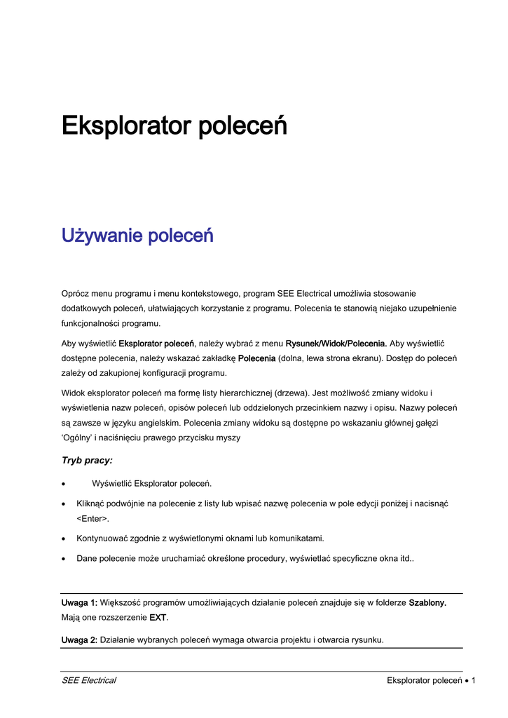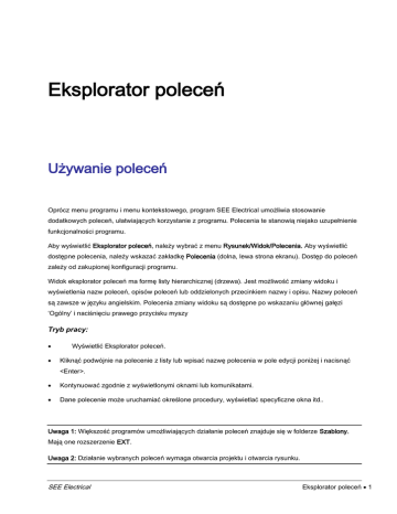 Eksplorator poleceń Używanie poleceń Oprócz menu programu i menu kontekstowego, program SEE Electrical umożliwia stosowanie dodatkowych poleceń, ułatwiających korzystanie z programu. Polecenia te stanowią niejako uzupełnienie funkcjonalności programu. Aby wyświetlić Eksplorator poleceń, należy wybrać z menu Rysunek/Widok/Polecenia. Aby wyświetlić dostępne polecenia, należy wskazać zakładkę Polecenia (dolna, lewa strona ekranu). Dostęp do poleceń zależy od zakupionej konfiguracji programu. Widok eksplorator poleceń ma formę listy hierarchicznej (drzewa). Jest możliwość zmiany widoku i wyświetlenia nazw poleceń, opisów poleceń lub oddzielonych przecinkiem nazwy i opisu. Nazwy poleceń są zawsze w języku angielskim. Polecenia zmiany widoku są dostępne po wskazaniu głównej gałęzi ‘Ogólny’ i naciśnięciu prawego przycisku myszy Tryb pracy: Wyświetlić Eksplorator poleceń. Kliknąć podwójnie na polecenie z listy lub wpisać nazwę polecenia w pole edycji poniżej i nacisnąć <Enter>. Kontynuować zgodnie z wyświetlonymi oknami lub komunikatami. Dane polecenie może uruchamiać określone procedury, wyświetlać specyficzne okna itd.. Uwaga 1: Większość programów umożliwiających działanie poleceń znajduje się w folderze Szablony. Mają one rozszerzenie EXT. Uwaga 2: Działanie wybranych poleceń wymaga otwarcia projektu i otwarcia rysunku. SEE Electrical Eksplorator poleceń 1 Polecenia Niektóre polecenia dostępne są poprzez menu programu, na paskach narzędzi jak i w eksploratorze poleceń. Działanie funkcji wywoływanych z menu lub z eksploratora poleceń jest identyczne. Polecenie można uruchomić poprzez wykonanie dwukliku na danej komendzie lub wpisując jego nazwę w oknie Nazwa polecenia i naciśnięciu klawisza ENTER. Grupowanie poleceń: Polecenia można grupować w widoku listy (nie oznacza to sekwencyjnego uruchomienia kilku poleceń). Aby utworzyć nową grupę należy kliknąć prawym przyciskiem myszy na poleceniu, a następnie wybrać z menu kontekstowego polecenie Nowa grupa. Menu kontekstowe zawiera komendy umożliwiające pracę z poleceniami w grupie. Menu kontekstowe polecenia zawiera następujące funkcjonalności: – Nowa Grupa – pozwala na stworzenie nowej grupy. – Wytnij polecenie – kopiuje polecenie do schowka i usuwa je z grupy. – Kopiuj polecenie – kopiuje wybrane polecenia. – Wklej polecenie – wkleja polecenie do grupy. – Zmień nazwę polecenia – usuwa polecenie z grupy i przenosi do gałęzi głównej. – Wykonaj polecenie – wykonuje wybrane polecenie. – Usuń wszystkie grupy – usuwa istniejące grupy poleceń. Jeśli klikniesz prawym przyciskiem myszy na danej grupie wyświetli się następujące menu: – Nowa grupa – tworzy nową grupę – Wytnij grupę – usuwa grupę poleceń. – Kopiuj grupę– kopiuje wybraną grupę. – Wklej grupę – wkleja wybraną grupę. – Wklej polecenie – wkleja wybrane polecenie do grupy. – Usuń grupę – usuwa grupę. – Zmień grupę – zmiana nazwy grupy poleceń. – Usuń wszystkie grupy – usuwa wszystkie grupy poleceń. 2 Eksplorator poleceń SEE Electrical Lista dostępnych poleceń Eksplorator poleceń zawiera listę dostępnych poleceń uporządkowaną alfabetycznie (Nie rozpatrujemy tu grupowania poleceń – jest to widok po usunięciu wszystkich grup). AddRef – Dodanie adresów krosowych do mastera Polecenie to pozwala dodać adres krosowy do symbolu wstawionego na schemacie. Wskazać symbol master na schemacie. Wybrać polecenie. Wyświetli się okno „Położenie adresów krosowych”. Wybrać odpowiednie opcje (położenie, kąt obrotu, wyrównanie. Jeżeli chcemy wybrać ręcznie położenie referencji należy kliknąć na przycisk Wybierz punkt. Opcja Wstaw definicję zestyku wstawia krzyż adresów. Uwaga 1: Działanie polecenia jest uzależnione od zaznaczenia opcji „Użyj normę tabelaryczną (krzyż)” w parametrach modułu Schematy Zasadnicze. (Wskazać moduł Schematy zasadnicze, wybrać zakładkę Cewka i zaznaczyć opcję.) Uwaga 2: Jeśli symbol master jest związany poprzez to samo oznaczenie z symbolami slave (np. stykami), to zostaną natychmiast wprowadzone adresy krosowe. Uwaga 3: Po dobraniu kodu katalogowego, krzyż adresów zostanie zamieniony na grafikę styków. Aspects – Zarządzanie Funkcją, Lokalizacją i produktem Polecenie to pozwala na definiowanie i zarządzanie funkcją, lokalizacją i produktem w bieżącym projekcie. Użytkownik może zdefiniować funkcje / lokalizacje / produkt przed rozpoczęciem projektu lub w trakcie jego opracowywania. Można również dodać dokładniejsze opisy związane z daną funkcją / lokalizacją, a także wyświetlić symbole / schematy zawarte w danej funkcji / lokalizacji / produkcie. SEE Electrical Eksplorator poleceń 3 Uwaga 1: Aby wygenerowane funkcje i lokalizacje użyć w projekcie, należy we Właściwościach projektu (wskazać nazwę projektu i z menu kontekstowego wybrać „Właściwości”), w zakładce „Ogólne” wybrać opcję "Zarządzanie Funkcją / Lokalizacją” oraz „Włączenie bazy danych Funkcja / Lokalizacja". Aby dołączyć zarządzanie produktem wybieramy „Włączenie bazy danych produktu”. Zamknąć i otworzyć projekt. Tryb pracy: Uaktywnić polecenie. Wyświetli się Eksplorator Funkcji i Lokalizacji lub Zarządzanie funkcją, lokalizacją i produktami. Dodawanie Funkcji / Lokalizacji / Produktu: Wyświetlić menu kontekstowe dla pozycji zaznaczonej w widoku drzewa Funkcji / Lokalizacji / Produktu. Wybrać polecenie Dodaj funkcję lub Dodaj lokalizację lub Dodaj produkt. Wprowadzić nazwę funkcji lub lokalizacji oraz jej opis (nieobowiązkowy). Dla produktu możemy wprowadzić jeszcze: Kod katalogowy i Rdzeń oznaczenia. Modyfikacja Funkcji / Lokalizacji / Produktu: Wybrać Funkcję lub Lokalizację lub Produkt do modyfikacji. W prawym panelu okna są udostępnione do edycji: Nazwa, Opis, a d