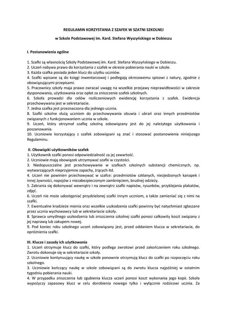 REGULAMIN KORZYSTANIA Z SZAFEK W SZATNI SZKOLNEJ w Szkole Podstawowej im. Kard. Stefana Wyszyńskiego w Dobieszu I. Postanowienia ogólne 1. Szafki są własnością Szkoły Podstawowej im. Kard. Stefana Wyszyńskiego w Dobieszu. 2. Uczeń nabywa prawo do korzystania z szafek w okresie pobierania nauki w szkole. 3. Każda szafka posiada jeden klucz do użytku uczniów. 4. Szafki wpisane są do księgi inwentarzowej i podlegają okresowemu spisowi z natury, zgodnie z obowiązującymi przepisami. 5. Pracownicy szkoły maja prawo zwracać uwagę na wszelkie przejawy nieprawidłowości w zakresie dysponowania, użytkowania oraz opłat za zniszczenie szafek szkolnych. 6. Szkoła prowadzi dla celów rozliczeniowych ewidencję korzystania z szafek. Ewidencja przechowywana jest w sekretariacie. 7. Jedna szafka jest przeznaczona dla jednego ucznia. 8. Szafki szkolne służą uczniom do przechowywania obuwia i ubrań oraz innych przedmiotów związanych z funkcjonowaniem ucznia w szkole. 9. Uczeń, który otrzymał szafkę szkolną zobowiązany jest do jej należytego użytkowania i poszanowania. 10. Uczniowie korzystający z szafek zobowiązani są znać i stosować postanowienia niniejszego Regulaminu. II. Obowiązki użytkowników szafek 1. Użytkownik szafki ponosi odpowiedzialność za jej zawartość. 2. Uczniowie mają obowiązek utrzymywać szafki w czystości. 3. Niedopuszczalne jest przechowywanie w szafkach szkolnych substancji chemicznych, np. wytwarzających nieprzyjemne zapachy, żrących itd. 4. Uczeń nie powinien przechowywać w szafce: przedmiotów szklanych, niezjedzonych kanapek i innej żywności, napojów z niezabezpieczonym zamknięciem, brudnej odzieży. 5. Zabrania się dokonywać wewnątrz i na zewnątrz szafki napisów, rysunków, przyklejania plakatów, zdjęć. 6. Uczeń nie może udostępniać przydzielonej szafki innym uczniom, a także zamieniać się z nimi na szafki. 7. Ewentualne kradzieże mienia oraz wszelkie uszkodzenia szafki powinny być natychmiast zgłaszane przez ucznia wychowawcy lub w sekretariacie szkoły. 8. Sprawca umyślnego uszkodzenia lub zniszczenia szkolnej szafki ponosi całkowity koszt związany z jej naprawą lub zakupem nowej. 9. Pod koniec roku szkolnego uczeń zobowiązany jest, przed oddaniem klucza w sekretariacie, do opróżnienia szafki. III. Klucze i zasady ich użytkowania 1. Uczeń otrzymuje klucz do szafki, który podlega zwrotowi przed zakończeniem roku szkolnego. Zwrotu dokonuje się w sekretariacie szkoły. 2. Uczniowie kontynuujący naukę w szkole ponownie otrzymują klucz do szafki po rozpoczęciu roku szkolnego. 3. Uczniowie kończący naukę w szkole zobowiązani są do zwrotu klucza najpóźniej w ostatnim tygodniu pobierania nauki. 4. W przypadku zniszczenia lub zgubienia klucza uczeń ponosi koszt wykonania jego kopii. Szkoła wypożyczy zapasowy klucz w celu dorobienia nowego tylko i wyłącznie rodzicowi ucznia. Za wypożyczony klucz pobierana jest kaucja w wysokości 50,00zł, zwracana po zwrocie klucza. W przypadku zagubienia klucza zapasowego rodzic pokrywa koszt wymiany zamka w szafce. 5. Uczniowie zabezpieczają swoje mienie pozostawione w szafkach poprzez ich zamykanie, niepozostawianie klucza w zamku i nieudostępnianie go innym osobom. IV. Kontrole i zasady ich przeprowadzania 1. Szafki mogą być kontrolowane na zasadach określonych w niniejszym rozdziale. 2. W celu sprawdzenia prawidłowości użytkowania szafek przeprowadza się kontrole okresowe. 3. Kontrole okresowe przeprowadza komisja powoływana przez Dyrektora Szkoły, w skład której wchodzą przedstawiciel Samorządu Uczniowskiego, konserwator, nauczyciel, pedagog lub Dyrektor Szkoły. 4. Kontrole nadzwyczajne przeprowadzane są w sytuacjach: uzyskania przez szkołę informacji o możliwości przechowywania przez ucznia rzeczy zabronionych niniejszym regulaminem, - na wniosek policji lub innych organów do tego uprawnionych, - na żądanie rodziców ucznia, - w związku z możliwością popełnienia czynu zabronionego. 5. Kontrolę nadzwyczajną przeprowadza się komisyjnie. Z kontroli sporządza się protokół. V. Postanowienia końcowe 1. Szkoła nie ponosi odpowiedzialności za rzeczy pozostawienie w szafkach szkolnych. 2. Uczeń oraz jego rodzic własnoręcznym podpisem przyjmują do wiadomości i stosowania niniejszy regulamin. 3. W przypadku niewywiązywania się przez ucznia z postanowień regulaminu Dyrektor Szkoły może odebrać uczniowi prawo korzystania z szafki szkolnej. 4. Regulamin wchodzi w życie z dniem podpisania przez Dyrektora Szkoły. Dyrektor Szkoły Janina Królak Dobiesz, 15 grudnia 2014.