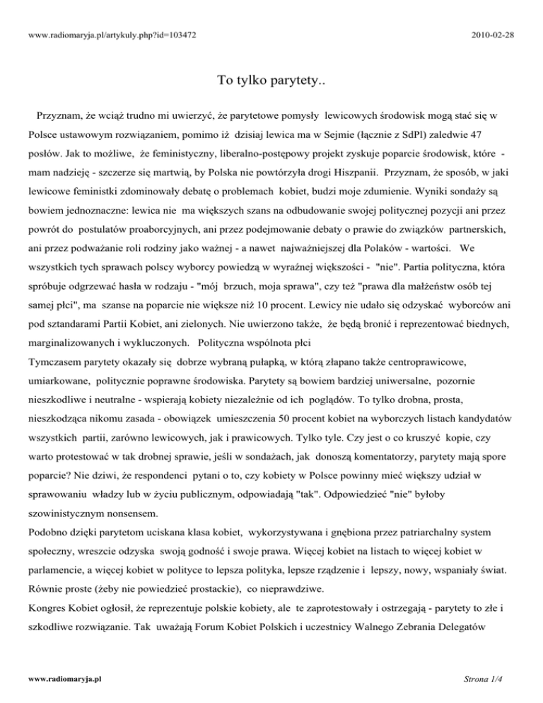 www.radiomaryja.pl/artykuly.php?id=103472 2010-02-28 To tylko parytety.. Przyznam, że wciąż trudno mi uwierzyć, że parytetowe pomysły lewicowych środowisk mogą stać się w Polsce ustawowym rozwiązaniem, pomimo iż dzisiaj lewica ma w Sejmie (łącznie z SdPl) zaledwie 47 posłów. Jak to możliwe, że feministyczny, liberalno-postępowy projekt zyskuje poparcie środowisk, które mam nadzieję - szczerze się martwią, by Polska nie powtórzyła drogi Hiszpanii. Przyznam, że sposób, w jaki lewicowe feministki zdominowały debatę o problemach kobiet, budzi moje zdumienie. Wyniki sondaży są bowiem jednoznaczne: lewica nie ma większych szans na odbudowanie swojej politycznej pozycji ani przez powrót do postulatów proaborcyjnych, ani przez podejmowanie debaty o prawie do związków partnerskich, ani przez podważanie roli rodziny jako ważnej - a nawet najważniejszej dla Polaków - wartości. We wszystkich tych sprawach polscy wyborcy powiedzą w wyraźnej większości - "nie". Partia polityczna, która spróbuje odgrzewać hasła w rodzaju - "mój brzuch, moja sprawa", czy też "prawa dla małżeństw osób tej samej płci", ma szanse na poparcie nie większe niż 10 procent. Lewicy nie udało się odzyskać wyborców ani pod sztandarami Partii Kobiet, ani zielonych. Nie uwierzono także, że będą bronić i reprezentować biednych, marginalizowanych i wykluczonych. Polityczna wspólnota płci Tymczasem parytety okazały się dobrze wybraną pułapką, w którą złapano także centroprawicowe, umiarkowane, politycznie poprawne środowiska. Parytety są bowiem bardziej uniwersalne, pozornie nieszkodliwe i neutralne - wspierają kobiety niezależnie od ich poglądów. To tylko drobna, prosta, nieszkodząca nikomu zasada - obowiązek umieszczenia 50 procent kobiet na wyborczych listach kandydatów wszystkich partii, zarówno lewicowych, jak i prawicowych. Tylko tyle. Czy jest o co kruszyć kopie, czy warto protestować w tak drobnej sprawie, jeśli w sondażach, jak donoszą komentatorzy, parytety mają spore poparcie? Nie dziwi, że respondenci pytani o to, czy kobiety w Polsce powinny mieć większy udział w sprawowaniu władzy lub w życiu publicznym, odpowiadają "tak". Odpowiedzieć "nie" byłoby szowinistycznym nonsensem. Podobno dzięki parytetom uciskana klasa kobiet, wykorzystywana i gnębiona przez patriarchalny system społeczny, wreszcie odzyska swoją godność i swoje prawa. Więcej kobiet na listach to więcej kobiet w parlamencie, a więcej kobiet w polityce to lepsza polityka, lepsze rządzenie i lepszy, nowy, wspaniały świat. Równie proste (żeby nie powiedzieć prostackie), co nieprawdziwe. Kongres Kobiet ogłosił, że reprezentuje polskie kobiety, ale te zaprotestowały i ostrzegają - parytety to złe i szkodliwe rozwiązanie. Tak uważają Forum Kobiet Polskich i uczestnicy Walnego Zebrania Delegatów www.radiomaryja.pl Strona 1/4 NSZZ "Solidarność" Regionu Mazowsze oraz kilka tysięcy osób, które podpisały list otwarty wyrażający sprzeciw wobec parytetowego pomysłu. Dlaczego? Bo parytety łamią zasady demokracji, wprowadzają pozamerytoryczne kryteria do systemu awansu i polityki kadrowej w polityce i życiu społecznym oraz kreują nieistniejącą, polityczną wspólnotę płci. Nie rozwiązują żadnego rzeczywistego problemu kobiet, a w miejsce polityki prorodzinnej, przedszkoli, żłobków, szacunku dla kompetencji człowieka, niezależnie od płci, rzucane są jak ochłap miejsca na partyjnych listach kandydatów. Zwycięstwo demokracji? Demokracja to taki system polityczny, w którym wyborcy wybierają posłów i radnych, oceniając różne programy i koncepcje polityczne oraz wiarygodność, uczciwość, kompetencje i biografie kandydatów. Płeć, podobnie jak wiek, uroda czy wzrost, ma znaczenie drugorzędne. Nie wybieramy aktorów do grania ról na scenie politycznej, więc nie dobieramy bohaterek i bohaterów sztuki wedle płci, wieku, urody i tuszy. Jeśli uważamy, że liderzy partii źle dobierają kandydatów na posłów, nie wedle kompetencji, lecz po znajomości lub np. według zamożności, to dlaczego chcemy do tego dodać kolejny, kompletnie pozamerytoryczny powód - płeć? Na sztucznie tworzonych listach pojawią się nazwiska kobiet "obowiązkowych" niezależnie od tego, ile ich w danej partii będzie faktycznie działać. Jeśli to będzie przymusowe, to ugrupowania zawsze znajdą odpowiednią liczbę kobiet. Czy jednak będą to te, którym chcemy powierzyć władzę? Dlaczego w kraju, który ma za sobą doświadczenia PRL i parytetowo dobierany Sejm - tyle z PZPR, tyle z SD i ZSL, kilku z koła Znak, tyle kobiet i mężczyzn, tylu górników i rolników etc., wracamy do złych, niedemokratycznych rozwiązań, wmawiając Polakom, że to wielka nowość i zwycięstwo demokracji? Polki radzą sobie bez ideologicznej demagogii Ukrytym założeniem parytetowej ustawy jest sugestia, że kobiety bez tej protezy nie są w stanie uczestniczyć w życiu publicznym i strukturach władzy w wymiarze równym mężczyznom. Kobiety w Polsce były aktywne i niezależne bez parytetów i propagandowych sztuczek w znacznie większym stopniu niż w wielu innych krajach. Miały prawo dziedziczenia ziemi i własności, samodzielność wymuszoną nieobecnością mężczyzn (wojny, powstania, represje), doświadczenie prowadzenia domowej edukacji szkolnej i patriotycznej (pod zaborami i okupacją). Prawo wyborcze uzyskały wraz z niepodległością Polski bez odwoływania się do demonstracji. Polki od dawna dobrze radzą sobie bez degradujących rozwiązań i ideologicznej demagogii. Mają poczucie własnej wartości, a ich mniejsza obecność w życiu politycznym jest częściej wyborem niż przejawem dyskryminacji. Zwolennicy parytetów twierdzą, że kobiety, które widzą siebie i swoją rolę w społeczeństwie inaczej niż mężczyźni, zostały zdominowane przez patriarchalny system społeczny. Obecność kobiet w opozycji, w "