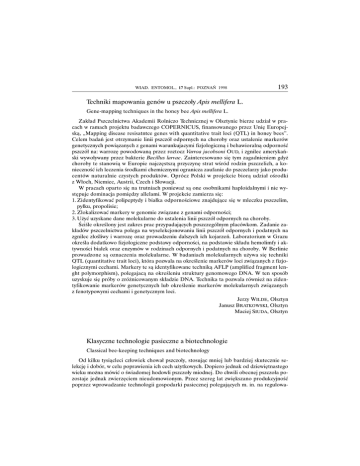 WIAD. ENTOMOL., 17 Supl.: POZNAŃ 1998 193 Techniki mapowania genów u pszczoły Apis mellifera L. Gene-mapping techniques in the honey bee Apis mellifera L. Zakład Pszczelnictwa Akademii Rolniczo Technicznej w Olsztynie bierze udział w pracach w ramach projektu badawczego COPERNICUS, finansowanego przez Unię Europejską, „Mapping disease resisatntce genes with quantitative trait loci (QTL) in honey bees”. Celem badań jest otrzymanie linii pszczół odpornych na choroby oraz ustalenie markerów genetycznych powiązanych z genami warunkujacymi fizjologiczną i behawioralną odporność pszczół na: warrozę powodowaną przez roztocz Varroa jacobsoni OUD, i zgnilec amerykański wywoływany przez bakterie Bacillus larvae. Zainteresowano się tym zagadnieniem gdyż choroby te stanowią w Europie najczęstszą przyczynę strat wśród rodzin pszczelich, a konieczność ich leczenia środkami chemicznymi ogranicza zaufanie do pszczelarzy jako producentów naturalnie czystych produktów. Oprócz Polski w projekcie biorą udział ośrodki z Włoch, Niemiec, Austrii, Czech i Słowacji. W pracach oparto się na trutniach ponieważ są one osobnikami haploidalnymi i nie występuje dominacja pomiędzy allelami. W projekcie zamierza się: 1. Zidentyfikować polipeptydy i białka odpornościowe znajdujące się w mleczku pszczelim, pyłku, propolisie; 2. Zlokalizować markery w genomie związane z genami odporności; 3. Użyć uzyskane dane molekularne do ustalenia linii pszczół odpornych na choroby. Ściśle określony jest zakres prac przypadających poszczególnym placówkom. Zadanie zakładów pszczelnictwa polega na wyselekcjonowaniu linii pszczół odpornych i podatnych na zgnilec złośliwy i warrozę oraz prowadzeniu dalszych ich kojarzeń. Laboratorium w Grazu określa dodatkowo fizjologiczne podstawy odporności, na podstawie składu hemolimfy i aktywności białek oraz enzymów w rodzinach odpornych i podatnych na choroby. W Berlinie prowadzone są oznaczenia molekularne. W badaniach molekularnych używa się techniki QTL (quantitative trait loci), która pozwala na określenie markerów loci związanych z fizjologicznymi cechami. Markery te są identyfikowane techniką AFLP (amplified fragment lenght polymorphism), polegajacą na określeniu struktury genomowego DNA. W ten sposób uzyskuje się próby o zróżnicowanym składzie DNA. Technika ta pozwala również na zidentyfikowanie markerów genetycznych lub określenie markerów molekularnych związanych z fenotypowymi cechami i genetycznym loci. Jerzy WILDE, Olsztyn Janusz B RATKOWSKI, Olsztyn Maciej SIUDA, Olsztyn Klasyczne technologie pasieczne a biotechnologie Classical bee-keeping techniques and biotechnology Od kilku tysiącleci człowiek chował pszczoły, stosując mniej lub bardziej skutecznie selekcję i dobór, w celu poprawienia ich cech użytkowych. Dopiero jednak od dziewiętnastego wieku można mówić o świadomej hodowli pszczoły miodnej. Do chwili obecnej pszczoła pozostaje jednak zwierzęciem nieudomowionym. Przez szereg lat zwiększano produkcyjność poprzez wprowadzanie technologii gospodarki pasiecznej polegających m. in. na regulowa- 194 43 ZJAZD PTE – STRESZCZENIA ZGŁOSZONYCH POSTERÓW niu struktury rodziny przez odbieranie pszczół, czerwiu, prowadzenie gospodarki dwurodzinnej, odbieranie nowych produktów pszczelich jak obnóża pyłkowe, propolis itp. W krajach o wysokim stopniu rozwoju klasycznych technologii pasiecznych bardzo trudno jest zwiększyć produkcję uzyskiwaną od rodziny pszczelej. W warunkach polskich ilość pozyskiwanych najważniejszych produktów pasiecznych: miodu i obnóży pyłkowych może dochodzić odpowiednio do 120 i 20 kg. Są to wartości wysokie, przekraczające nawet 10 razy średnią krajową. Spodziewać się jednak należy, że wielkości te nie zostaną przekroczone w najbliższym czasie przy zastosowaniu tradycyjnych metod gospodarki pasiecznej. Jedyną możliwością jest zastosowanie metod biotechnologicznych. W chwili obecnej największe znaczenia ma sztuczne unasienianie matek pszczelich, albowiem pszczoła miodna jest jedynym wśród zwierząt chowanych przez człowieka, którego unasienianie w warunkach naturalnych nie jest kontrolowane. Pszczelarze mogą stworzyć jedynie warunki matkom do odbycia lotów weselnych, w czasie których sukces reprodukcyjny odnoszą nie zawsze najbardziej wartościowe pod względem genetycznym osobniki. Sztuczne unasienianie matek pszczelich daje możliwości kontrolowanego doboru rodziców, dzięki czemu jest możliwe tworzenie mieszańców wielorakich i wielokrotnych, które poprzez wykorzystanie zjawiska heterozji na ogół znacznie przewyższają pokolenia wyjściowe produkcyjnością, dynamiką rozwoju i innymi cechami przydatnymi w gospodarce pasiecznej. Najlepszym przykładem doskonałego wielokrotnego mieszańca jest wyhodowana pszczoła „Buckwast”. Ostatnio podjęto również prace zmierzające do stworzenia mapy genów warunkujących odporność na choroby pszczół: warrozę oraz zgnilca złośliwego. W tych badaniach używane są techniki biologii molekularnej w celu określenia markerów związanych z genami odporności. Jerzy WILDE, Olsztyn Maciej SIUDA, Olsztyn Janusz B RATKOWSKI, Olsztyn Współczesne kierunki hodowli pszczół Current trends in bee-keeping Dynamiczny rozwój hodowli pszczół datuje się od lat 50-tych naszego stulecia, kiedy opracowano technikę sztucznego unasieniania matek pszczelich. Aktualnie sztuczne unasienianie wykorzystuje się masowo do uzyskiwania mieszańców wielokrotnych i wielorakich, charakteryzujących się wysoką produkcyjnością. Obok miodu, który jest głównym produktem pasiecznym, obnóża pyłkowe stają się ważnym elementem podnoszenia opłacalności gospodarowania. Istnieją możliwości skutecznej selekcji pszczół specjalizujących się w zbieraniu dużych ilości pyłku. Mleczko pszczele jest kolejnym produktem pasiecznym, którego produkcję zwięks