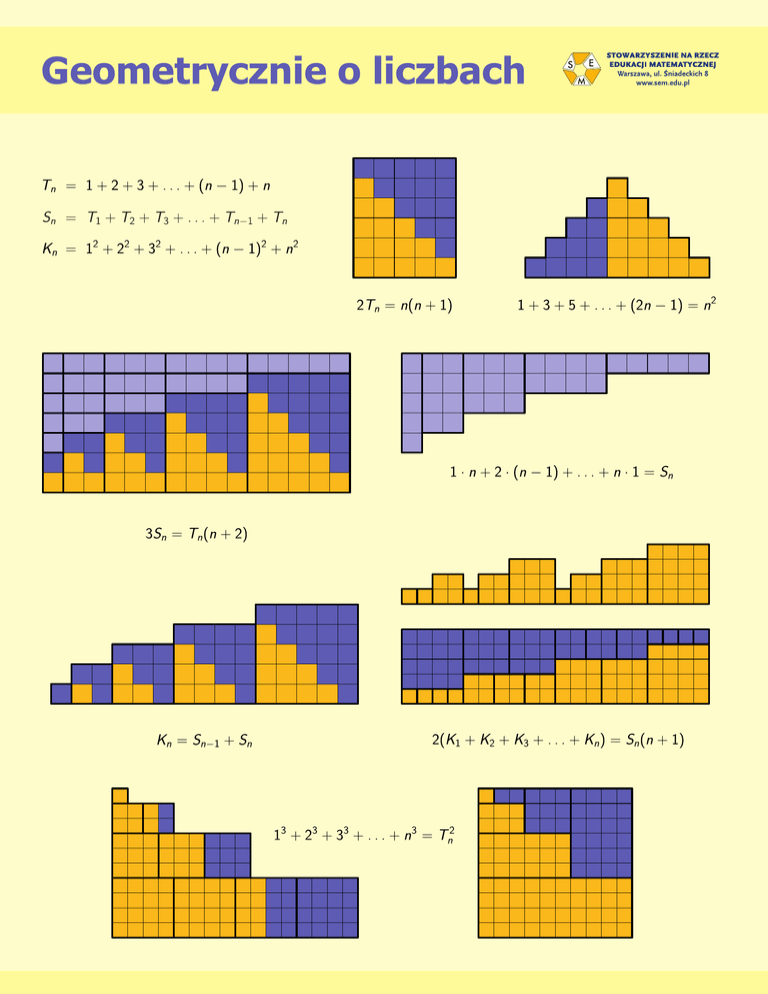 Geometrycznie o liczbach Geometrycznie o liczbach Łukasz Bożyk Dodatnią liczbę całkowitą n można interpretować jako pole pewnej figury składającej się z n kwadratów jednostkowych. Ten prosty pomysł pozwala w naturalny i elementarny sposób znaleźć jawne wzory na wyrazy pewnych ciągów oraz ujrzeć związki między tymi ciągami. Przyjmijmy oznaczenia Tn = 1 + 2 + 3 + . . . + (n − 1) + n, Sn = T1 + T2 + T3 + . . . + Tn−1 + Tn , Kn = 12 + 22 + 32 + . . . + (n − 1)2 + n2 . (1) (2) (3) Ciąg (Tn ) nazywa się ciągiem liczb trójkątnych, właśnie ze względu na interpretację geometryczną pojawiających się w nim liczb (rys. 1). Zauważmy, że z dwóch liczb trójkątnych Tn można ułożyć prostokąt o wymiarach n × (n + 1) (rys. 2). To oznacza, że zachodzi równość 2Tn = n(n + 1), czyli n(n + 1) Tn = . (4) 2 (I) 1 2 3 1 2 1 T1 T2 1 2 3 .. . n 1 2 3 4 T3 T4 n+1 n rys. 1 rys. 2 Powyższe rozumowanie polegało na przedstawieniu pola pewnej figury, w tym wypadku prostokąta, na dwa sposoby i przyrównaniu uzyskanych wyników. W ten sposób ciąg określony wzorem (1) okazał się spełniać także zależność (4). Podobnie uzasadnimy kolejne własności. (II) Rozważmy sumę początkowych n liczb nieparzystych (rys. 3). Możemy zauważyć, że omawiana figura jest sumą dwóch kolejnych liczb trójkątnych (rys. 4), które z kolei da się ułożyć w taki sposób, aby dopełniały się do kwadratu o boku n (rys. 5). Wobec tego 1 + 3 + 5 + . . . + (2n − 1) = Tn−1 + Tn = n2 . (5) 1 3 . .. n 5 2n − 1 rys. 3 n n−1 rys. 4 n rys. 5 Ciąg (Sn ) określony wzorem (2), czyli ciąg sum początkowych liczb trójkątnych, bywa nazywany ciągiem liczb czworościennych. Jeśli bowiem zamiast kwadratów jednostkowych rozważyć jednostkowe sześciany i liczbę naturalną n utożsamić z bryłą o objętości n zbudowaną z n takich sześcianów, to liczby Sn można przedstawić jako przypominające czworościany przestrzenne struktury (rys. 6), których warstwami są kolejne liczby trójkątne. (III) 1 T1 T2 T3 . .. Tn T1 T2 ··· T3 rys. 6 Tn rys. 7 Do prowadzenia rozumowań w dwóch wymiarach wygodnie jest przedstawić liczbę Sn jako n sklejonych ze sobą coraz większych liczb trójkątnych (rys. 7). Do każdego trójkątnego składnika możemy dokleić drugi taki sam, uzyskując tym samym przedstawienie liczby 2Sn jako sumy n prostokątów (rys. 8). Tn .. . T3 T2 T1 Tn ··· T3 T2 n+2 T1 Tn rys. 8 rys. 9 Rozważmy figurę, której brakuje, aby uzupełnić rysunek 8 do prostokąta z rysunku 9. Jest ona złożona z n poziomych pasków o wysokości 1, których długości są kolejnymi liczbami trójkątnymi. Wobec tego cała omawiana figura ma powierzchnię Sn . Skoro prostokąt o wymiarach Tn × (n + 2) udało się przedstawić jako sumę trzech liczb Sn , to 3Sn = Tn (n + 2). Stąd Sn = n(n + 1)(n + 2) , 6 (6) przy czym, aby otrzymać ostatnią równość, skorzystaliśmy ze wzoru (4). Na rysunku 9 można ujrzeć także uzasadnienie równości (IV) 1 · n + 2 · (n − 1) + 3 · (n − 2) + . . . + n · 1 = Sn . (7) Rzeczywiście, suma po lewej stronie powyższego wyrażenia odpowiada n prostokątom (rys. 10), z których zbudowany jest jeden ze składników Sn przedstawionych na rysunku 9. 1 2 3 ··· n n 1 rys. 10 2 3 ··· n rys. 11 Rysunek 9 może również posłużyć do wyznaczenia wzoru jawnego na wyrazy ciągu sum kwadratów (Kn ) określonego równością (3). Wyodrębnienie odpowiedniej części rysunku (rys. 11) wraz ze wzorem (6) pozwala przekonać się, że (V) Kn = Sn−1 + Sn = n(n + 1)(2n + 1) (n − 1)n(n + 1) n(n + 1)(n + 2) + = . 6 6 6 2 (VI) Zajmiemy się teraz wyprowadzeniem wzoru na sumę K1 + K2 + K3 + . . . + Kn . Chociaż naturalną geometryczną interpretacją powyższego wyrażenia jest n liczb Kn ułożonych od najmniejszej do największej (rys. 12), okazuje się, że warto narysować tę sumę inaczej. Ustawmy mianowicie w porządku niemalejącym nie całe liczby Kn , a ich małe kwadratowe składniki. Wówczas z dwóch takich figur można ułożyć prostokąt (rys. 13). T1 ··· T2 rys. 12 Tn n+1 Sn rys. 13 Prostokąt ten ma wysokość n + 1, a jego szerokość jest równa Sn , o czym możemy przekonać się albo korzystając ze wzoru (7), albo patrząc na rysunek 12 (przed zmianą kolejności składników szerokość figury była taka sama). W związku z tym 2(K1 + K2 + K3 + . . . + Kn ) = Sn (n + 1), n(n + 1)2 (n + 2) skąd K1 + K2 + K3 + . . . + Kn = . 12 (VII) Umiemy już wyznaczyć wzór na sumę kolejnych liczb naturalnych oraz sumę kwadratów kolejnych liczb naturalnych. Zajmijmy się więc sumą sześcianów 13 + 23 + 33 + . . . + (n − 1)3 + n3 . Do rozważenia tej sumy na płaszczyźnie skorzystamy z następującej obserwacji: liczbę k 3 można przedstawić w postaci prostokąta złożonego z k kwadratów o boku k, czyli prostokąta o wymiarach k 2 × k. Wobec tego omawianą sumę sześcianów możemy zilustrować jako n takich prostokątów, ułożonych jeden nad drugim (rys. 14). T1 1 2 T2 .. . Tn−1 n rys. 14 Korzystając z równości (5), podzielmy każdy z prostokątnych pasków k 2 ×k na prostokąty o szerokościach będących kolejnymi liczbami trójkątnymi Tk oraz Tk−1 (przyjmujemy T0 = 0). 3 Prostokąty uzyskane z podziału możemy połączyć w dwie figury (rys. 15), które uzupełniają się do kwadratu o boku Tn (rys. 16). 2 1 2 1 3 .. . 2 n Tn n−1 n Tn rys. 15 rys. 16 Uzasadniliśmy więc, że 13 + 23 + 33 + . . . + n3 = Tn2 = n2 (n + 1)2 , 4 gdzie aby uzyskać ostatnią równość, skorzystaliśmy z tożsamości (4). Na zakończenie proponujemy kilka zadań, do rozwiązania których mogą przydać się opisane metody. Zachęcamy również do lektury artykułu Liczby trójkątne i czworościenne, Gazetka Olimpiady Matematycznej Gimnazjalistów Kwadrat nr 11 (grudzień 2013). 1. Niech m, n będą dodatnimi liczbami całkowitymi. Znaleźć wartości wyrażeń: a) Tm+n − Tm − Tn ; c) 12 + 32 + 52 +