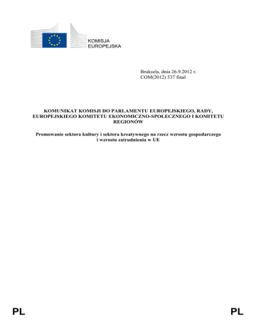 KOMISJA EUROPEJSKA Bruksela, dnia 26.9.2012 r. COM(2012) 537 final KOMUNIKAT KOMISJI DO PARLAMENTU EUROPEJSKIEGO, RADY, EUROPEJSKIEGO KOMITETU EKONOMICZNO-SPOŁECZNEGO I KOMITETU REGIONÓW Promowanie sektora kultury i sektora kreatywnego na rzecz wzrostu gospodarczego i wzrostu zatrudnienia w UE PL PL KOMUNIKAT KOMISJI DO PARLAMENTU EUROPEJSKIEGO, RADY, EUROPEJSKIEGO KOMITETU EKONOMICZNO-SPOŁECZNEGO I KOMITETU REGIONÓW Promowanie sektora kultury i sektora kreatywnego na rzecz wzrostu gospodarczego i wzrostu zatrudnienia w UE 1. NIEWYKORZYSTANE REZERWY POTENCJAŁU REALIZACJI STRATEGII „UE 2020” U podstaw naszej tkanki społecznej to właśnie kultura kształtuje naszą tożsamość, aspiracje i stosunki z innymi oraz ze światem. Kształtuje ona ponadto miejsca i krajobrazy, w których żyjemy, oraz styl życia, który rozwijamy. Dziedzictwo kulturowe, przedstawienia artystyczne i sztuki wizualne, kinematografia, muzyka, działalność wydawnicza, moda lub wzornictwo są bardzo widoczne w życiu codziennym, lecz wkład, jaki sektor kultury i sektor kreatywny1 mogą wnieść do rozwoju społecznego i gospodarczego w UE, wciąż nie jest w pełni dostrzegany. Ponadto globalizacja oraz cyfryzacja tworzy nowe wyzwania, lecz niezbędne dostosowania nie doczekały się jeszcze rozpowszechnienia, które umożliwiłoby tym sektorom pełną realizację ich potencjału i pozwoliłoby na to, aby od dawna ugruntowana doskonałość Europy w tej dziedzinie w większym stopniu przełożyła się na jej przewagę komparatywną na arenie światowej. Niniejszy komunikat proponuje strategię w celu wykorzystania potencjału tych sektorów w UE, aby przyczyniły się one do wzrostu gospodarczego i tworzenia miejsc pracy. Szybko rozwijające się sektory Docenia się wyniki gospodarcze sektora kultury i sektora kreatywnego: w UE stanowią one 3,3 % PKB i zatrudniają 6,7 mln osób (3 % całkowitej liczby osób zatrudnionych)2. Dane są również znaczące jeśli weźmie się pod uwagę branże związane z modą3 i przemysłem luksusowym4, które opierają się na silnym wkładzie kulturowym i kreatywnym. Stanowią one 3 % PKB UE, zatrudniają odpowiednio 5 mln i 1 mln osób, przy czym według prognoz zatrudnienie w przemyśle luksusowym może osiągnąć 2 mln do roku 20205. Między 2008 r. a 2011 r. zatrudnienie w sektorze kultury i sektorze kreatywnym okazało się bardziej odporne na kryzys niż cała gospodarka UE6 ze stopami wzrostu zróżnicowanymi 1 2 3 4 5 6 PL Obejmujące w szczególności architekturę, archiwa i biblioteki, rękodzieło artystyczne, sektor audiowizualny (obejmujący film, telewizję, gry wideo i multimedia), dziedzictwo kulturowe, wzornictwo (w tym wzornictwo odzieżowe), festiwale, muzykę, przedstawienia artystyczne i sztuki wizualne, działalność wydawniczą i radio. Sprawozdanie na temat europejskiej konkurencyjności w 2010 roku. Inne źródła oszacowały udział na 4,5 % PKB i 8,5 mln osób zatrudnionych (TERA Consultants, 2010 r.). Obejmuje ona wzornictwo, produkcję materiałów i towarów dotyczących mody oraz ich dystrybucję. Obejmuje on w szczególności luksusową odzież, biżuterię i zegarki, akcesoria, wyroby skórzane, perfumy i kosmetyki, meble i sprzęt gospodarstwa domowego, samochody, łodzie, jak również gastronomię, hotele i rozrywkę. Competitiveness of the EU fashion industries, Idea Consult, 2012 r.; The value of the cultural and creative industries to the European economy, Frontier Economics, 2012 r. Źródło: Eurostat (EU-LFS) 2 PL jednak w ramach podsektorów. Trend ten jest tym bardziej interesujący, że niektóre sektory uzyskały wyższy procent zatrudnienia młodzieży niż reszta gospodarki. W niektórych przypadkach na szczeblu lokalnym i regionalnym strategiczne inwestycje w tych sektorach przyniosły spektakularne wyniki. W szczególności festiwale i Europejskie Stolice Kultury dostarczają istotnych korzyści ekonomicznych, uzyskując czasem ponad dziesięciokrotny efekt dźwigni finansowej na każde zainwestowane euro. Katalizatory innowacji Na pograniczu pomiędzy sztuką, biznesem i technologią, sektor kultury i sektor kreatywny mają pozycję strategiczną, która pozwala im wywołać efekty zewnętrzne w innych gałęziach przemysłu. Dostarczają one treści dla aplikacji ICT, tworząc popyt na zaawansowaną elektronikę użytkową i urządzenia telekomunikacyjne. Kultura i twórczość mają również bezpośredni wpływ na sektory takie jak turystyka i są elementem wszystkich etapów łańcucha wartości innych sektorów, takich jak moda i przemysł wyrobów luksusowych, w których stanowią one coraz istotniejszy fundament7. W ujęciu bardziej ogólnym sektory te mają wpływ na innowacje w innych gałęziach przemysłu. Jak podkreślono w „Unii innowacji”8, innowacja jest coraz częściej stymulowana przez czynniki nietechnologiczne, takie jak kreatywność, wzornictwo i nowe procesy organizacyjne lub modele działalności gospodarczej. W dużej mierze opiera się ona na kreatywnych ekosystemach, w których decydujące znaczenie ma jakość i różnorodność partnerstw pomiędzy poszczególnymi sektorami i kategoriami podmiotów. Najbardziej oczywistym przykładem jest szersze stosowanie wzornictwa w przemyśle wytwórczym, potęgujące wartość produktów, usług, procesów i struktur rynkowych. Przedsiębiorstwa przeznaczające dwukrotność średniej kwoty wydatków na wkład kreatywny wprowadzają produkty innowacyjne z prawdopodobieństwem wyższym o 25 %9. Ten stymulujący potencjał może również stanowić podstawowy zasób dla innowacji społecznych oraz dla odpowiedzi na największe wyzwania społeczne, takie jak zmiana klimatu, zrównoważony rozwój, zmiany demograficzne lub różnorodność kulturowa10. Na przykład w ramach partnerstwa z sektorem edukacji i szkolenia zawodowego, sektor kultury i sektor kreatywny mogą przyczynić się do rozwoju różnych umiejętności dotyczących kreatywnoś