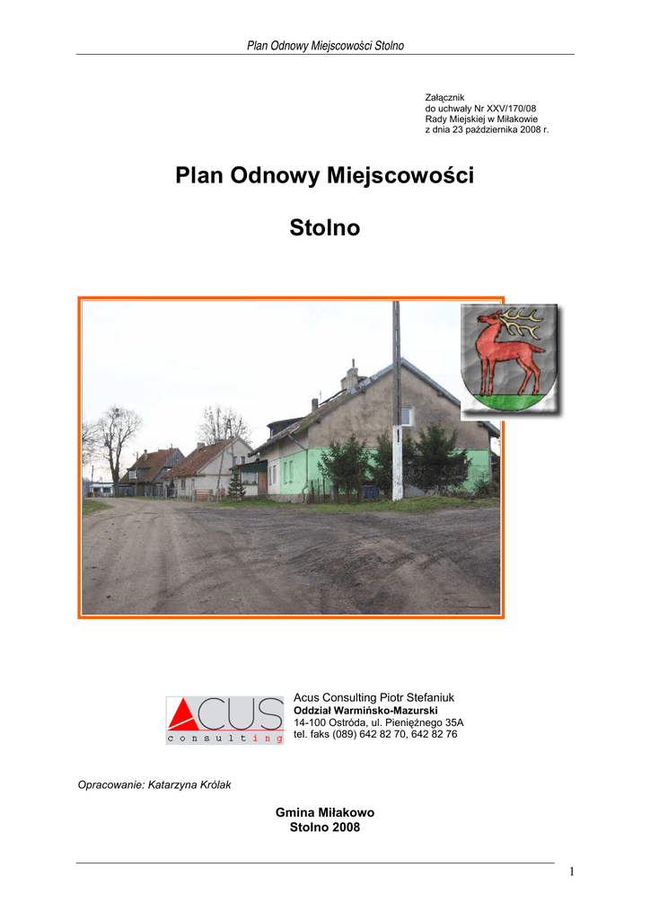 Plan Odnowy Miejscowości Stolno Załącznik do uchwały Nr XXV/170/08 Rady Miejskiej w Miłakowie z dnia 23 października 2008 r. Plan Odnowy Miejscowości Stolno Acus Consulting Piotr Stefaniuk Oddział Warmińsko-Mazurski 14-100 Ostróda, ul. PienięŜnego 35A tel. faks (089) 642 82 70, 642 82 76 Opracowanie: Katarzyna Królak Gmina Miłakowo Stolno 2008 1 Plan Odnowy Miejscowości Stolno WSTĘP .................................................................................................................................................................. 3 Rozdział 1. Spójność Planu z celami strategicznymi dokumentów dotyczących rozwoju społeczno gospodarczego gminy i regionu............................................................................................................................ 4 Rozdział 2 Analiza zasobów miejscowości .......................................................................................................... 5 2.1 Historia ........................................................................................................................................................ 5 2.2 PołoŜenie i wygląd miejscowości ................................................................................................................. 5 2.3 Przesłanki opracowania Planu Odnowy Miejscowości................................................................................ 7 2.4 Środowisko przyrodnicze.............................................................................................................................. 7 2.5 Środowisko kulturowe ................................................................................................................................ 10 2.6 Gospodarka przestrzenna i infrastruktura techniczna ............................................................................... 11 2.7 Funkcje, jakie pełni Stolno ......................................................................................................................... 13 2.8 Sfera gospodarcza ...................................................................................................................................... 13 2.9 Potencjał społeczny .................................................................................................................................... 14 Rozdział 3 Diagnoza moŜliwości rozwojowych Stolna - analiza SWOT........................................................ 18 3.1 Analiza SWOT......................................................................................................................................... 20 Rozdział 4 Wizja rozwoju miejscowości Stolno.......................................................................................... 22 Rozdział 5. Priorytety, cele, zadania i karty zadań planu ........................................................................... 23 Kolejność poniŜszych priorytetów, celów i zadań nie stanowi ich hierarchii, są one równorzędne. . 24 5.1 Priorytety.................................................................................................................................................... 25 5.2 Cele i zadania............................................................................................................................................. 25 5.3 Karty zadań ujętych w planie rozwoju wsi ................................................................................................. 28 Rozdział 6. Harmonogram realizacji przedsięwzięć wraz z kosztorysem. .................................................... 33 Rozdział 7. Promocja, zarządzaniem realizacją i monitoring Planu Odnowy Miejscowości Stolno ........ 34 7.1 Promocja Planu Odnowy Miejscowości Stolno.......................................................................................... 34 7.2 System zarządzania realizacją Planu Odnowy Miejscowości Stolno ......................................................... 34 7.3 Monitorowanie realizacji celów i zadań, sposoby oceny Planu................................................................. 35 7.4 Sposoby oceny Planu Odnowy Miejscowości Stolno.................................................................................. 36 7.5 Uspołecznienie procesu planowania i realizacji ........................................................................................ 37 2 Plan Odnowy Miejscowości Stolno WSTĘP Odnowa wsi koncentruje się wokół zagadnień związanych z ekonomicznym bytem wsi, ale równieŜ z warunkami materialnymi Ŝycia mieszkańców (standard Ŝycia) Jednocześnie w procesie odnowy wsi bardzo mocno akcentuje się jakość Ŝycia, wynikającą z pozamaterialnych, duchowych i społecznych potrzeb osób i całej społeczności wiejskiej. Cechą odnowy wsi jako metody rozwoju obszarów wiejskich jest zatem kompleksowość, polegająca na uzgodnieniu i realizowaniu całościowej wizji rozwoju wsi, z myślą o zachowaniu jej toŜsamości, przestrzennej integralności oraz zharmonizowaniu podstawowych funkcji: mieszkalnej, gospodarczej oraz rekreacyjnej i wypoczynkowej. W procesie odnowy wsi bardzo mocno podkreśla się potrzebę dokonania zasadniczej zmiany w mentalności mieszkańców wsi z postaw pasywnych na postawy polegające na kreatywnych i uporządkowanych działaniach, na wzięciu odpowiedzialności za swoje bezpośrednie otoczenie, jak równieŜ za przyszłość swojej społeczności. Zwraca się uwagę na fakt, iŜ odnowa wsi jest czymś więcej, niŜ upiększeniem fasad budynków, porządkowaniem przestrzeni wiejskiej, renowacją historycznych budynków czy realizacją nowych inwestycji dotyczących infrastruktury wiejskiej czy imprez o charakterze kulturalnym czy rekreacyjnym, ale przede wszystkim odbudową toŜsamości i integralności wsi oraz zachowaniem wartości Ŝycia wiejskiego, zakorzenionych w jej kulturze i tradycji. Odnowa wsi jest zarówno koncepcją rozwojow
