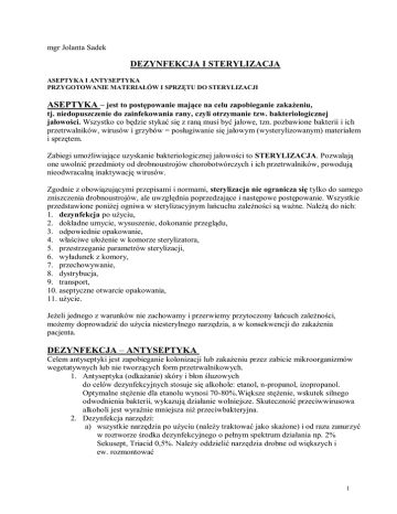 mgr Jolanta Sadek DEZYNFEKCJA I STERYLIZACJA ASEPTYKA I ANTYSEPTYKA PRZYGOTOWANIE MATERIAŁÓW I SPRZĘTU DO STERYLIZACJI ASEPTYKA – jest to postępowanie mające na celu zapobieganie zakażeniu, tj. niedopuszczenie do zainfekowania rany, czyli otrzymanie tzw. bakteriologicznej jałowości. Wszystko co będzie stykać się z raną musi być jałowe, tzn. pozbawione bakterii i ich przetrwalników, wirusów i grzybów = posługiwanie się jałowym (wysterylizowanym) materiałem i sprzętem. Zabiegi umożliwiające uzyskanie bakteriologicznej jałowości to STERYLIZACJA. Pozwalają one uwolnić przedmioty od drobnoustrojów chorobotwórczych i ich przetrwalników, powodują nieodwracalną inaktywację wirusów. Zgodnie z obowiązującymi przepisami i normami, sterylizacja nie ogranicza się tylko do samego zniszczenia drobnoustrojów, ale uwzględnia poprzedzające i następowe postępowanie. Wszystkie przedstawione poniżej ogniwa w sterylizacyjnym łańcuchu zależności są ważne. Należą do nich: 1. dezynfekcja po użyciu, 2. dokładne umycie, wysuszenie, dokonanie przeglądu, 3. odpowiednie opakowanie, 4. właściwe ułożenie w komorze sterylizatora, 5. przestrzeganie parametrów sterylizacji, 6. wyładunek z komory, 7. przechowywanie, 8. dystrybucja, 9. transport, 10. aseptyczne otwarcie opakowania, 11. użycie. Jeżeli jednego z warunków nie zachowamy i przerwiemy przytoczony łańcuch zależności, możemy doprowadzić do użycia niesterylnego narzędzia, a w konsekwencji do zakażenia pacjenta. DEZYNFEKCJA – ANTYSEPTYKA Celem antyseptyki jest zapobieganie kolonizacji lub zakażeniu przez zabicie mikroorganizmów wegetatywnych lub nie tworzących form przetrwalnikowych. 1. Antyseptyka (odkażanie) skóry i błon śluzowych do celów dezynfekcyjnych stosuje się alkohole: etanol, n-propanol, izopropanol. Optymalne stężenie dla etanolu wynosi 70-80%.Większe stężenie, wskutek silnego odwodnienia bakterii, wykazują działanie wolniejsze. Skuteczność przeciwwirusowa alkoholi jest wyraźnie mniejsza niż przeciwbakteryjna. 2. Dezynfekcja narzędzi: a) wszystkie narzędzia po użyciu (należy traktować jako skażone) i od razu zanurzyć w roztworze środka dezynfekcyjnego o pełnym spektrum działania np. 2% Sekusept, Triacid 0,5%. Należy oddzielić narzędzia drobne od większych i ew. rozmontować 1 b) narzędzia winny być całkowicie zanurzone (uważać należy na uwięzione pęcherzyki powietrza) c) specjalne pojemniki, przykryte!!!! d) roztwory środków powinny być wymieniane codziennie lub nawet częściej jeżeli uległy skażeniu zanieczyszczeniami organicznymi e) nie należy dopełniać naczyń zawierających częściowo zużyty roztwór f) narzędzia należy wyjmować w rękawiczkach, następnie dokładnie wypłukać w wodzie destylowanej, osuszyć w jałowych ręcznikach. 3. dezynfekcja powierzchni przedmiotów i sprzętu: sprzęt pomocniczy, stoliki podręczne, blaty itp. Jest ona połączona z reguły z myciem (wycieranie lub spryskiwanie - ostrożnie z drogami oddechowymi). Preparaty dezynfekcyjne używane do tego celu muszą zawierać środki czyszczące nie zmniejszające, w znaczący sposób, aktywności przeciwbakteryjnej wskutek zanieczyszczenia. Najczęściej używa się połączeń związków czynnych powierzchniowo z aldehydami lub bez nich, preparatów uwalniających tlen aktywny. Termiczne czyszczenie i dezynfekcja narzędzi nazywana jest DEKONTAMINACJĄ W dezynfekcji wykorzystuje się metody fizyczne i chemiczne: 1. metody fizyczne termiczne (ciepło wilgotne) - podgrzana woda 80-100 st. C – czas ekspozycji 10-30 min. - dezynfekcja wrzącą wodą przez gotowanie-czas 30 min- niszczy wegetatywne formy bakterii, nie działa na HBV polecana do: dezynfekcji tkanin np. bielizny - dezynfekcja przez pasteryzacjępolega na krótkotrwałym jednorazowym podgrzaniu cieczy do temp. poniżej 1000 C w czasie od kilku sekund do 60 min. i natychmiastowym oziębieniu do temperatury pokojowej - para wodna przepływająca (1000 C – czas ekspozycji 10-30 min) para rzepływająca pod ciśnieniem atmosferycznym przez materiały poddawane dezynfekcji np. dezynfekcja materaców, kołder, zakażonych odpadków) nietermiczne –filtracja: filtracja jako metoda separacji drobnoustrojów stosowana jest głównie podczas produkcji leków i szczepionek, coraz częściej do czyszczenia wody w otoczeniu chorych szczególnie zagrożonych zakażeniem, do oczyszczania powietrza z drobnoustrojów w instalacjach nawiewowych w pomieszczeniach “czystych” lub “czystych” stołach roboczych, promieniowanie UV: promieniowaniem nadfioletowym nazywamy fale elektromagnetyczne o długości między 13,6 a 400 nm. Działanie promieni UV polega na pochłanianiu kwantów promieniowania (fotonów) przez funkcjonalnie ważne cząstki mikroorganizmów. Ze względu na ograniczoną przenikliwość UV stosuje się je do dezynfekcji powietrza - lampy bakteriobójcze 2. metody chemiczne - alkohole - aldehydy - fenole - środki utleniające - chlorowce - środki powierzchniowo czynne 3. metody chemiczno – termiczne (połączenie wilgotnego gorącego powietrza ze środkiem dezynfekcyjnym w automatycznym urządzeniu do dezynfekcji) Zarówno w przypadku sterylizacji i dezynfekcji, metodami z wyboru są metody termiczne. Zgodnie z zasadami narzędzia i sprzęt, które mają kontakt z nieuszkodzoną powierzchnią skóry, 2 mogą być poddawane wyłącznie procesom dezynfekcji. Jeżeli nie stosuje się do tego celu metody termicznej, można stosować metody chemiczne. STERYLIZACJA To całkowite zabicie wszystkich drobnoustrojów łącznie ze sporami. Jest to proces nieodwracalny i kończy się śmiercią komórki. Przedmiot uważany jest za sterylny, jeżeli prawdopodobieństwo iż jest on niesterylny ma się jak 1:1000000. Sterylność nie podlega stopniowaniu: przedmiot nie może być bardziej lub mniej sterylny. Jest sterylny lub nie METODY STERYLIZACJI I. metody termiczne 1. sterylizacja cie