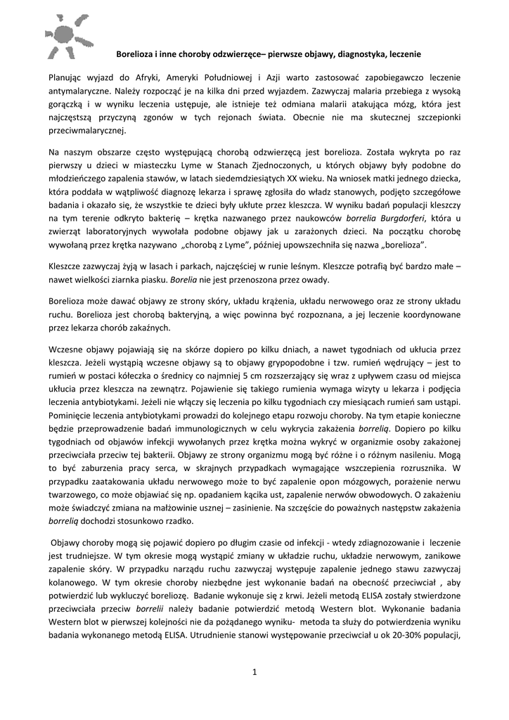 Borelioza i inne choroby odzwierzęce– pierwsze objawy, diagnostyka, leczenie Planując wyjazd do Afryki, Ameryki Południowej i Azji warto zastosować zapobiegawczo leczenie antymalaryczne. Należy rozpocząć je na kilka dni przed wyjazdem. Zazwyczaj malaria przebiega z wysoką gorączką i w wyniku leczenia ustępuje, ale istnieje też odmiana malarii atakująca mózg, która jest najczęstszą przyczyną zgonów w tych rejonach świata. Obecnie nie ma skutecznej szczepionki przeciwmalarycznej. Na naszym obszarze często występującą chorobą odzwierzęcą jest borelioza. Została wykryta po raz pierwszy u dzieci w miasteczku Lyme w Stanach Zjednoczonych, u których objawy były podobne do młodzieńczego zapalenia stawów, w latach siedemdziesiątych XX wieku. Na wniosek matki jednego dziecka, która poddała w wątpliwość diagnozę lekarza i sprawę zgłosiła do władz stanowych, podjęto szczegółowe badania i okazało się, że wszystkie te dzieci były ukłute przez kleszcza. W wyniku badań populacji kleszczy na tym terenie odkryto bakterię – krętka nazwanego przez naukowców borrelia Burgdorferi, która u zwierząt laboratoryjnych wywołała podobne objawy jak u zarażonych dzieci. Na początku chorobę wywołaną przez krętka nazywano „chorobą z Lyme”, później upowszechniła się nazwa „borelioza”. Kleszcze zazwyczaj żyją w lasach i parkach, najczęściej w runie leśnym. Kleszcze potrafią być bardzo małe – nawet wielkości ziarnka piasku. Borelia nie jest przenoszona przez owady. Borelioza może dawać objawy ze strony skóry, układu krążenia, układu nerwowego oraz ze strony układu ruchu. Borelioza jest chorobą bakteryjną, a więc powinna być rozpoznana, a jej leczenie koordynowane przez lekarza chorób zakaźnych. Wczesne objawy pojawiają się na skórze dopiero po kilku dniach, a nawet tygodniach od ukłucia przez kleszcza. Jeżeli wystąpią wczesne objawy są to objawy grypopodobne i tzw. rumień wędrujący – jest to rumień w postaci kółeczka o średnicy co najmniej 5 cm rozszerzający się wraz z upływem czasu od miejsca ukłucia przez kleszcza na zewnątrz. Pojawienie się takiego rumienia wymaga wizyty u lekarza i podjęcia leczenia antybiotykami. Jeżeli nie włączy się leczenia po kilku tygodniach czy miesiącach rumień sam ustąpi. Pominięcie leczenia antybiotykami prowadzi do kolejnego etapu rozwoju choroby. Na tym etapie konieczne będzie przeprowadzenie badań immunologicznych w celu wykrycia zakażenia borrelią. Dopiero po kilku tygodniach od objawów infekcji wywołanych przez krętka można wykryć w organizmie osoby zakażonej przeciwciała przeciw tej bakterii. Objawy ze strony organizmu mogą być różne i o różnym nasileniu. Mogą to być zaburzenia pracy serca, w skrajnych przypadkach wymagające wszczepienia rozrusznika. W przypadku zaatakowania układu nerwowego może to być zapalenie opon mózgowych, porażenie nerwu twarzowego, co może objawiać się np. opadaniem kącika ust, zapalenie nerwów obwodowych. O zakażeniu może świadczyć zmiana na małżowinie usznej – zasinienie. Na szczęście do poważnych następstw zakażenia borrelią dochodzi stosunkowo rzadko. Objawy choroby mogą się pojawić dopiero po długim czasie od infekcji - wtedy zdiagnozowanie i leczenie jest trudniejsze. W tym okresie mogą wystąpić zmiany w układzie ruchu, układzie nerwowym, zanikowe zapalenie skóry. W przypadku narządu ruchu zazwyczaj występuje zapalenie jednego stawu zazwyczaj kolanowego. W tym okresie choroby niezbędne jest wykonanie badań na obecność przeciwciał , aby potwierdzić lub wykluczyć boreliozę. Badanie wykonuje się z krwi. Jeżeli metodą ELISA zostały stwierdzone przeciwciała przeciw borrelii należy badanie potwierdzić metodą Western blot. Wykonanie badania Western blot w pierwszej kolejności nie da pożądanego wyniku- metoda ta służy do potwierdzenia wyniku badania wykonanego metodą ELISA. Utrudnienie stanowi występowanie przeciwciał u ok 20-30% populacji, 1 szczególnie w rejonach ze zwiększonym występowaniem zakażonych kleszczy tj. m. in. w Sudetach i na Suwalszczyźnie. Boreliozę leczy się zgodnie z zaleceniami Amerykańskiego Towarzystwa Chorób Infekcyjnych (IDSA).Zalecenia te zostały poparte przez liczne krajowe towarzystwa w tym przez Polskie Towarzystwo Epidemiologów i Lekarzy Chorób Zakaźnych. Lekiem pierwszego rzutu jest doksycyklina stosowana doustnie w dawce 200 mg na dobę przez 21 dni. Jeżeli występuje równolegle zapalenie stawów antybiotyk stosuje się przez miesiąc. Kontrowersje wzbudzają objawy, które określa się terminem „zespół po przebytej chorobie z Lyme”. Objawami tej choroby mogą być bóle mięśni i stawów, uczucie ogólnego zmęczenia, zaburzenia pamięci, zaburzenia koncentracji, bóle głowy i nerwobóle. Podobne dolegliwości występują również u osób, które nigdy na boreliozę nie chorowały. W przypadku zespołu po przebytej chorobie z Lyme antybiotyki nie działają. Objawy te można leczyć jedynie objawowo. Według zaleceń międzynarodowych nie zaleca się więc stosowania antybiotyków. Podejrzewa się, że przyczyną pojawienia się tego zespołu jest zbyt późne włączenie antybiotykoterapii w leczeniu boreliozy. Wyjątkowo w zaleceniach leczenia boreliozy podaje się czego nie należy stosować ze względu na brak skuteczności. Nie zaleca się m. in. stosowania długotrwałej antybiotykoterapii i większych dawek antybiotyków niż zalecane. Profilaktyką boreliozy jest odpowiedni ubiór do lasu i stosowanie repelentów na skórę i ubranie oraz dokładny przegląd całego ciała po powrocie z wycieczki do lasu. Ważne jest usunięcia kleszcza możliwie jak najszybciej, aby zmniejszyć ryzyko infekcji. Nie ma szczepionki na boreliozę. Istnieje jedynie szczepionka zapobiegająca odkleszczowemu zapaleniu opon mózgowych, które jest chorobą wirusową i rzadszą iż borelioza. Nie zaleca się 