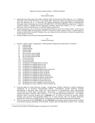 Regulamin promocji „Nikon Cashback – JESTEM TĄ CHWILĄ” § 1. Postanowienia ogólne 1. Organizatorem promocji pod nazwą „Nikon cashback” (dalej „Promocja”) jest Nikon Polska sp. z o.o. z siedzibą w 2. 3. Warszawie, adres: 02-232 Warszawa, ul. Łopuszańska 38B , wpisana do rejestru przedsiębiorców prowadzonego przez Sąd Rejonowy dla m. st. Warszawy, XIII Wydział Gospodarczy Krajowego Rejestru Przedsiębiorców Krajowego Rejestru Sądowego pod numerem KRS 0000173495 , NIP 5252273898 (dalej „Organizator”). Wybrane czynności związane z obsługą Promocji Organizator powierzył spółce Walk Creative sp. z o.o. z siedzibą w Warszawie, adres: 01-029 Warszawa, ul. Dzielna 60 (dalej „Koordynator”). Promocja prowadzona jest na terytorium Rzeczpospolitej Polskiej w okresie od 1 kwietnia 2016 r. do 30 czerwca 2016 r. Produkty objęte Promocją (dalej „Produkt”) w okresie jej trwania, zgodnie z §2 pkt. 1 będą dostępne w sprzedaży również poza terminem Promocji, przy czym zakup przed lub po terminie Promocji nie uprawnia do wzięcia udziału w Promocji. Promocja odbywa się na terytorium Rzeczypospolitej Polskiej. § 2. Produkty Promocyjne 1. Promocja dotyczy zakupu następujących modeli aparatów fotograficznych Organizatora ( „Produkt”): 1.1. 1.2. 1.3. 1.4. 1.5. 1.6. 1.7. 1.8. 1.9. 1.10. 1.11. 1.12. 1.13. 1.14. 1.15. 1.16. 1.17. 1.18. 1.19. 1.20. 1.21. 1.22. 1.23. 1.24. 1.25 COOLPIX L340 COOLPIX P900 COOLPIX AW130 * COOLPIX B500 * COOLPIX B700 DX Lustrzanka cyfrowa D5300 DX Lustrzanka cyfrowa D5500 DX Lustrzanka cyfrowa D7200 FX lustrzanka D610 FX lustrzanka D750 FX lustrzanka D810 FX Obiektyw AF-S NIKKOR 24mm f/1.4G ED FX Obiektyw AF-S NIKKOR 35mm f/1.4G FX Obiektyw AF-S NIKKOR 58mm f/1.4G FX Obiektyw AF-S NIKKOR 85mm f/1.4G FX Obiektyw AF-S NIKKOR 80-400mm f/4.5-5.6G ED VR FX Obiektyw AF-S NIKKOR 14-24mm f/2.8G ED FX Obiektyw AF-S NIKKOR 24-70mm f/2.8G ED FX Obiektyw AF-S NIKKOR 24-70mm f/2.8G VR FX Obiektyw AF-S NIKKOR 70-200mm f/4G ED VR FX Obiektyw AF-S NIKKOR 70-200mm f/2.8G ED VR II FX Obiektyw AF-S NIKKOR 16-35mm f/4G ED VR FX Obiektyw AF-S NIKKOR 24-120mm f/4G ED VR DX Obiektyw AF-S Zoom- NIKKOR 12-24mm f/4G IF-ED DX Obiektyw AF-S Zoom- NIKKOR 17-55mm f/2.8G IF-ED 2. Promocją objęty jest zakup fabrycznie nowego i oznakowanego Produktu, dokonany w punkcie handlowym 3. * znajdującym się na terytorium Rzeczpospolitej Polskiej i prowadzącym sprzedaż detaliczną Produktu pochodzącego z dystrybucji Nikon Polska oraz zakup dokonany za pośrednictwem sklepu internetowego store.nikon.pl lub innego sklepu internetowego, oferowanego w oryginalnych opakowaniach zawierających nalepkę informacyjną „Importer: Nikon Polska Sp. z o.o.” oraz kartę gwarancyjną producenta. Lista sklepów biorących udział w promocji dostępna jest w Załączniku nr 1. Do udziału w Promocji nie uprawnia nabycie Produktu poza granicami Rzeczypospolitej Polskiej lub od osoby fizycznej, która nie prowadzi działalności gospodarczej. Promocją nie są objęte Produkty pochodzące ze sprzedaży wtórnej (komisowej lub podobnej). Promocja obowiązuje od dnia 01.04.2016r. do dnia 30.06.2016r. W przypadku zakupów dokonywanych w sklepie internetowym promocja obowiązuje od 01.04.2016r. od godz. 00:01 do 30.06.2016r. do godz. 23.59 - decyduje Produkty COOLPIX B500 i B700 będą dostępne w sprzedaży od 15 maja 2016 r. data i godzina wysłania Zamówienia na serwer Sklepu Internetowego. W przypadku zakupu w sklepie internetowym, klient powinien upewnić się przed dokonaniem zakupu iż Produkt pochodzi z Dystrybucji Nikon Polska. § 3. Uczestnictwo w Promocji 1. W Promocji mogą uczestniczyć osoby/podmioty, które dokonały zakupu jako: 1.1. pełnoletnie osoby fizyczne posiadające pełną zdolność do czynności prawnych, dokonujące zakupu Produktu w charakterze konsumenta w rozumieniu art. 221 Kodeksu cywilnego. 1.2. przedsiębiorcy, bez względu na formę organizacyjno-prawną (w tym osoba fizyczna prowadząca działalność gospodarczą, osoba prawna albo jednostka organizacyjna nieposiadająca osobowości prawnej, której ustawa przyznaje zdolność prawną), posiadający miejsce zamieszkania albo siedzibę w Rzeczypospolitej Polskiej, którzy w Okresie Promocji nabyli Produkt (dalej „Uczestnik”). § 4. Zasady Promocji 1. Za zakup Produktu w okresie Promocji Uczestnikowi przysługiwać będzie Rabat Promocyjny zrealizowany poprzez zwrot gotówki na zasadach opisanych w niniejszym Regulaminie. 2. Do udziału w Promocji uprawnia kupon promocyjny dostępny w opakowaniach Produktów objętych Promocją lub 3. 4. 5. 6. 7. 8. 9. 10. 11. wydrukowany ze strony www.nikon.pl/promocje (dalej: „Kupon Promocyjny”), jak również formularz rejestracji dostępny na www.nikon.pl/promocje. Celem uzyskania Rabatu Promocyjnego Uczestnik powinien zgłosić swój udział w promocji na jeden z dwóch sposobów, poprzez 3.1. Prawidłowe wypełnienie zgłoszenia do promocji dostępnego na stronie www.nikon.pl/promocje oraz dołączenie skanów/zdjęć wymaganych dokumentów. 3.2. Przesłanie na adres WALK Creative ul. Dzielna 60, 01-029 Warszawa, z dopiskiem „Nikon Cashback”: 3.2.1. prawidłowo wypełnionego i podpisanego Kuponu Promocyjnego, który jest dostępny w opakowaniach lub wydrukowany ze strony www.nikon.pl/promocje. Przez prawidłowo wypełniony kupon promocyjny należy rozumieć kupon wypełniony w sposób czytelny we wszystkich polach wskazanych jako obligatoryjne. Do kuponu promocyjnego Uczestnik powinien dołączyć: 3.2.2. kopię paragonu lub faktury VAT dokumentującej zakup Produktu, oraz potwierdzenie złożenia zamówienia w przypadku zakupów przez Internet, 3.2.3. kopię wypełnionej, oryginalnej karty gwarancyjnej firmy NIKON dołączonej do zakupionego Produktu. Organizator rekomenduje wysłanie zgłoszenia jako list polecony. Prawidłowo wypełniony Kupon Promocyjny wraz z załącznikami, o których mowa w § 4 pkt 3 stanowi zgłoszenie w Promocji