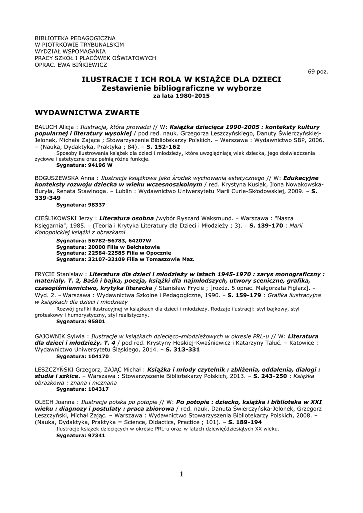 BIBLIOTEKA PEDAGOGICZNA W PIOTRKOWIE TRYBUNALSKIM WYDZIAŁ WSPOMAGANIA PRACY SZKÓŁ I PLACÓWEK OŚWIATOWYCH OPRAC. EWA BIŃKIEWICZ 69 poz. ILUSTRACJE I ICH ROLA W KSIĄŻCE DLA DZIECI Zestawienie bibliograficzne w wyborze za lata 1980-2015 WYDAWNICTWA ZWARTE BALUCH Alicja : Ilustracja, która prowadzi // W: Książka dziecięca 1990-2005 : konteksty kultury popularnej i literatury wysokiej / pod red. nauk. Grzegorza Leszczyńskiego, Danuty ŚwierczyńskiejJelonek, Michała Zająca ; Stowarzyszenie Bibliotekarzy Polskich. – Warszawa : Wydawnictwo SBP, 2006. – (Nauka, Dydaktyka, Praktyka ; 84). – S. 152-162 Sposoby ilustrowania książek dla dzieci i młodzieży, które uwzględniają wiek dziecka, jego doświadczenia życiowe i estetyczne oraz pełnią różne funkcje. Sygnatura: 94196 W BOGUSZEWSKA Anna : Ilustracja książkowa jako środek wychowania estetycznego // W: Edukacyjne konteksty rozwoju dziecka w wieku wczesnoszkolnym / red. Krystyna Kusiak, Ilona NowakowskaBuryła, Renata Stawinoga. ‒ Lublin : Wydawnictwo Uniwersytetu Marii Curie-Skłodowskiej, 2009. ‒ S. 339-349 Sygnatura: 98337 CIEŚLIKOWSKI Jerzy : Literatura osobna /wybór Ryszard Waksmund. ‒ Warszawa : "Nasza Księgarnia", 1985. ‒ (Teoria i Krytyka Literatury dla Dzieci i Młodzieży ; 3). ‒ S. 139-170 : Marii Konopnickiej książki z obrazkami Sygnatura: Sygnatura: Sygnatura: Sygnatura: 56782-56783, 64207W 20000 Filia w Bełchatowie 22584-22585 Filia w Opocznie 32107-32109 Filia w Tomaszowie Maz. FRYCIE Stanisław : Literatura dla dzieci i młodzieży w latach 1945-1970 : zarys monograficzny : materiały. T. 2, Baśń i bajka, poezja, książki dla najmłodszych, utwory sceniczne, grafika, czasopiśmiennictwo, krytyka literacka / Stanisław Frycie ; [rozdz. 5 oprac. Małgorzata Figlarz]. ‒ Wyd. 2. ‒ Warszawa : Wydawnictwa Szkolne i Pedagogiczne, 1990. ‒ S. 159-179 : Grafika ilustracyjna w książkach dla dzieci i młodzieży Rozwój grafiki ilustracyjnej w książkach dla dzieci i młodzieży. Rodzaje ilustracji: styl bajkowy, styl groteskowy i humorystyczny, styl realistyczny. Sygnatura: 95801 GAJOWNIK Sylwia : Ilustracje w książkach dziecięco-młodzieżowych w okresie PRL-u // W: Literatura dla dzieci i młodzieży. T. 4 / pod red. Krystyny Heskiej-Kwaśniewicz i Katarzyny Tałuć. ‒ Katowice : Wydawnictwo Uniwersytetu Śląskiego, 2014. ‒ S. 313-331 Sygnatura: 104170 LESZCZYŃSKI Grzegorz, ZAJĄC Michał : Książka i młody czytelnik : zbliżenia, oddalenia, dialogi : studia i szkice. – Warszawa : Stowarzyszenie Bibliotekarzy Polskich, 2013. – S. 243-250 : Książka obrazkowa : znana i nieznana Sygnatura: 104317 OLECH Joanna : Ilustracja polska po potopie // W: Po potopie : dziecko, książka i biblioteka w XXI wieku : diagnozy i postulaty : praca zbiorowa / red. nauk. Danuta Świerczyńska-Jelonek, Grzegorz Leszczyński, Michał Zając. ‒ Warszawa : Wydawnictwo Stowarzyszenia Bibliotekarzy Polskich, 2008. ‒ (Nauka, Dydaktyka, Praktyka = Science, Didactics, Practice ; 101). ‒ S. 189-194 Ilustracje książek dziecięcych w okresie PRL-u oraz w latach dziewięćdziesiątych XX wieku. Sygnatura: 97341 1 SŁÓŃSKA Irena : Grafika ilustracyjna w książkach dla dzieci i młodzieży // W: Frycie Stanisław : Literatura dla dzieci i młodzieży w latach 1945-1970 : zarys monograficzny : materiały. T. 2, Baśń i bajka, poezja, książki dla najmłodszych, utwory sceniczne, grafika, czasopiśmiennictwo, krytyka literacka. ‒ Wyd. 2. ‒ Warszawa : Wydawnictwa Szkolne i Pedagogiczne, 1990. ‒ S. 483-494 Sygnatura: 95801 SŁOŃSKA Irena : Z problemów ilustracji dla dzieci // W: Wybrane problemy literatury dla dzieci i młodzieży / red. Z. Brzuchowska. – Rzeszów: Wydawnictwo Uczelniane WSP. 1984. ‒ S. 223-229 Sygnatura: 43740, 43742 UZARSKA-BIELAWSKA Renata : Treści wychowawcze i ideologiczne w przekazie ilustracyjnym elementarzy Mariana Falskiego w kontekście sztuki profesjonalnej // W: Edukacja czytelnicza wyzwaniem współczesnej pedagogiki przedszkolnej i wczesnoszkolnej / red. Anna JakubowiczBryx. ‒ Bydgoszcz : Wydawnictwo Uniwersytetu Kazimierza Wielkiego, 2011. ‒ S. 184-190 Sygnatura: 103263 ZAJĄC Michał : Nurty i style w edytorstwie książki dziecięcej // W: Książka dziecięca 1990-2005 : konteksty kultury popularnej i literatury wysokiej / pod red. nauk. Grzegorza Leszczyńskiego, Danuty Świerczyńskiej-Jelonek, Michała Zająca ; Stowarzyszenie Bibliotekarzy Polskich. – Warszawa : Wydawnictwo SBP, 2006. – (Nauka, Dydaktyka, Praktyka ; 84). – S. 163-175 Sygnatura: 94196 W ZAJĄC Michał : Promocja książki dziecięcej : podręcznik akademicki / Stowarzyszenie Bibliotekarzy Polskich. ‒ Warszawa : Wydawnictwo SBP, 2000. ‒ (Nauka, Dydaktyka, Praktyka = Science, Didactics, Practice; 42). ‒ S. 136-138 : Rola okładki obwoluty) w promocji książki dziecięcej Sygnatura: 90394 Sygnatura: 28192 Filia w Bełchatowie ARTYKUŁY Z CZASOPISM BALUCH Alicja : Ilustracja, która prowadzi // Polonistyka. ‒ 2006, nr 2, s. 27-32 Rozważania na temat kształcącej roli ilustracji w książkach dla dzieci. BALUCH Alicja : Ujęcia angelologiczne w ilustracjach książek dla dzieci i młodzieży (od loczków do łysinki) // Guliwer. – 2003, nr 4, s. 5-11 BODANKO Anatol : Świat baśni w procesie wychowania i kształtowania osobowości dziecka. ‒ Bibliogr. // Nauczyciel i Szkoła. ‒ 2006, nr 1/2, s. 191-205 Psychoanalityczna teoria baśni. Problemy ilustracji plastycznej baśni. Rola baśni w rozwoju intelektualnym dziecka. Refleksje o genezie i istocie bajki. Bajka współczesna w procesie wychowania. BOGUSZEWSKA Anna : Kicz we współczesnej ilustracji w książkach dla dzieci // Poradnik Bibliotekarza. – 2010, nr 10, dod. S. 1-3 BOGUSZEWSKA Anna : Nurt pięknej książki w Polsce : konteksty historyczne // Poradnik Bibliotekarza. ‒ 2013 , nr 3 , dod. Świat Książki Dziecięcej, nr 3, s. 4-6 BOGUSZEWSKA Anna : O ilustracji w książkach dla dzieci