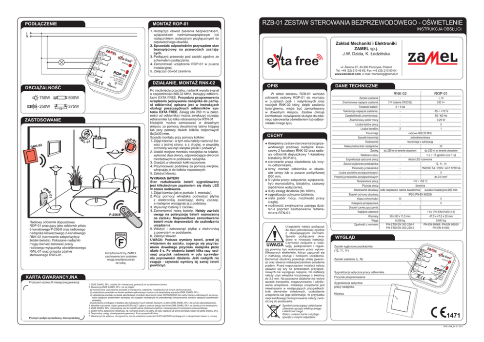 PODŁĄCZENIE MONTAŻ ROP-01 1.Rozłączyć obwód zasilania bezpiecznikiem, wyłącznikiem nadmiarowoprądowym lub rozłącznikiem izolacyjnym przyłączonymi do odpowiedniego obwodu. 2.Sprawdzić odpowiednim przyrządem stan beznapięciowy na przewodach zasilających. 3.Podłączyć przewody pod zaciski zgodnie ze schematem podłączenia. 4.Zamontować urządzenie ROP‑01 w puszce instalacyjnej. 5. Załączyć obwód zasilania. DZIAŁANIE, MONTAŻ RNK-02 OBCIĄŻALNOŚĆ 750W 250W 500W 375W ZASTOSOWANIE Radiowy odbiornik dopuszkowy ROP-01 pracujący jako odbiornik pilota 8-kanałowego P-256/8 oraz radiowego nadajnika klawiszowego 2-kanałowego RNK-02 (sterowanie załącz/wyłącz źródeł światła). Pokazane nadajniki mogą również sterować pracą radiowego wyłącznika oświetleniowego RWL-01 oraz gniazda zdalnie sterowanego RWG-01. Urządzenia firmy ZAMEL cechowane tym znakiem mogą współpracować ze sobą. Po naciśnięciu przycisku, nadajnik wysyła sygnał o częstotliwości 868,32 MHz, sterujący odbiornikami EXTA FREE. Procedura programowania urządzenia (wpisywania nadajnika do pamięci odbiornika) opisana jest w instrukcjach obsługi poszczególnych odbiorników systemu EXTA FREE. Zasięg (do 250 m w zależności od odbiornika) można zwiększyć stosując retransmiter lub kilka retransmiterów RTN-01. Nadajnik można zamocować w dowolnym miejscu za pomocą dwustronnej taśmy klejącej lub przy pomocy dwóch kołków rozporowych 5x(3x30) mm. Sposób montażu przy pomocy kołków: 1.Zdjąć klawisz - w tym celu należy nacisnąć klawisz z jednej strony, a z drugiej, w powstałą szczelinę wsunąć wkrętak płaski i podważyć. 2.Ustalić miejsce montażu nadajnika na ścianie, wykonać dwa otwory, odpowiadające otworom montażowym w podstawie nadajnika. 3.Osadzić w otworach kołki rozporowe. 4.Przymocować podstawę za pomocą wkrętów, wkręcając je do kołków rozporowych. 5.Założyć klawisz. WYMIANA BATERII Stan rozładowania baterii sygnalizowany jest kilkukrotnym zapaleniem się diody LED w czasie nadawania. 1.Zdjąć klawisz (jak w punkcie 1. montażu). 2.Przy pomocy wkrętaka podważyć płytkę z elektroniką zwalniając dolny zaczep, a następnie wyciągnąć ją z podstawy. 3.Wysunąć baterię z zacisku. 4.Zamontować nową baterię. Należy zwrócić uwagę na polaryzację baterii oaznaczoną na zacisku. Nieprawidłowe zamontowanie baterii może doprowadzić do uszkodzenia urządzenia. 5.Włożyć i zatrzasnąć płytkę z elektroniką z powrotem w podstawie. 6. Założyć klawisz. UWAGA: Podczas wymiany baterii, przed jej włożeniem do zacisku, sugeruje się przytrzymanie dowolnego przycisku nadajnika przez około 5 s. Po włożeniu baterii kilka razy nacisnąć przycisk nadawania w celu sprawdzenia poprawności działania. Jeśli nadajnik nie reaguje - czynność wymiany tej samej baterii powtórzyć. KARTA GWARANCYJNA Producent udziela 24 miesięcznej gwarancji Pieczęć i podpis sprzedawcy, data sprzedaży 1. ZMIE ZAMEL SP.J. udziela 24- miesięcznej gwarancji na sprzedawane towary. 2. Gwarancją ZMIE ZAMEL SP.J. nie są objęte: a) mechaniczne uszkodzenia powstałe w transporcie, załadunku / rozładunku lub innych okolicznościach, b) uszkodzenia powstałe na skutek wadliwie wykonanego montażu lub eksploatacji wyrobów ZMIE ZAMEL SP.J., c) uszkodzenia powstałe na skutek jakichkolwiek przeróbek dokonanych przez KUPUJĄCEGO lub osoby trzecie a odnoszących się do wyrobów będących przedmiotem sprzedaży lub urządzeń niezbędnych do prawidłowego funkcjonowania wyrobów będących przedmiotem sprzedaży, d) uszkodzenia wynikające z działania siły wyższej lub innych zdarzeń losowych, za które ZMIE ZAMEL SP.J. nie ponosi odpowiedzialności. 3. Wszelkie roszczenia z tytułu gwarancji KUPUJĄCY zgłosi w punkcie zakupu lub firmie ZMIE ZAMEL SP.J. na piśmie po ich stwierdzeniu. 4. ZMIE ZAMEL SP.J. zobowiązuje się do rozpatrywania reklamacji zgodnie z obowiązującymi przepisami prawa polskiego. 5. Wybór formy załatwienia reklamacji, np. wymiana towaru na wolny od wad, naprawa lub zwrot pieniędzy należy do ZMIE ZAMEL SP.J. 6. Terytorialny zasięg obowiązywania gwarancji: Rzeczpospolita Polska. 7. Gwarancja nie wyłącza, nie ogranicza, ani nie zawiesza uprawnień KUPUJĄCEGO wynikających z niezgodności towaru z umową. RZB-01 ZESTAW STEROWANIA BEZPRZEWODOWEGO - OŚWIETLENIE INSTRUKCJA OBSŁUGI Zakład Mechaniki i Elektroniki ZAMEL sp.j. J.W. Dzida, K. Łodzińska ul. Zielona 27, 43-200 Pszczyna, Poland Tel. +48 (32) 210 46 65, Fax +48 (32) 210 80 04 www.zamelcet.com, e-mail: [email protected] OPIS DANE TECHNICZNE W skład zestawu RZB-01 wchodzi odbiornik radiowy ROP-01 do montażu w puszkach pod- i natynkowych oraz nadajnik RNK-02 który, dzięki zasilaniu bateryjnemu, może być zamontowany w dowolnym miejscu. Zestaw oferuje komfortowe rozwiązanie służące do zdalnego sterowania oświetleniem lub odbiornikami innego typu. RNK-02 Zaciski zasilania: Znamionowe napięcie zasilania: Trwałość baterii: Urządzenie należy podłączyć do sieci jednofazowej zgodnie z obowiązującymi normami. Sposób podłączenia określono w niniejszej instrukcji. Czynności związane z: instaUWAGA lacją, podłączeniem i regulacją powinny być wykonywane przez wykwalifikowanych elektryków, którzy zapoznali się z instrukcją obsługi i funkcjami urządzenia. Demontaż obudowy powoduje utratę gwarancji oraz stwarza niebezpieczeństwo porażenia prądem. Przed rozpoczęciem instalacji należy upewnić się czy na przewodach przyłączeniowych nie występuje napięcie. Do instalacji należy użyć wkrętaka krzyżowego o średnicy do 3,5 mm. Na poprawne działanie ma wpływ sposób transportu, magazynowania i użytkowania urządzenia. Instalacja urządzenia jest niewskazana w następujących przypadkach: brak elementów składowych, uszkodzenie urządzenia lub jego deformacje. W przypadku nieprawidłowego funkcjonowania należy zwrócić 