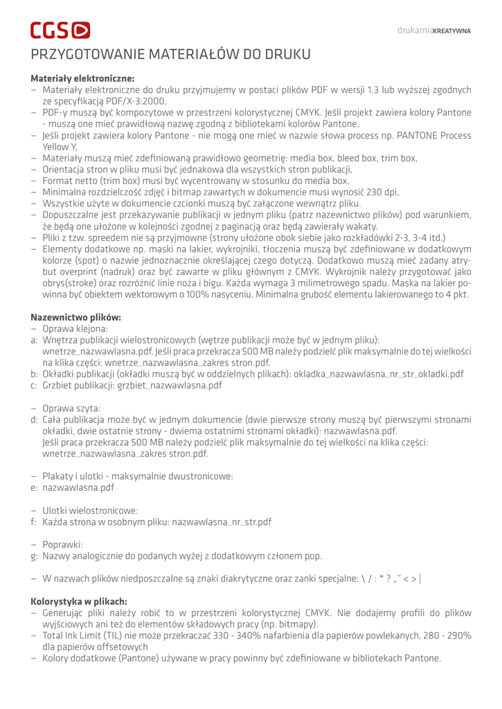 drukarniaKREATYWNA PRZYGOTOWANIE MATERIAŁÓW DO DRUKU Materiały elektroniczne: — Materiały elektroniczne do druku przyjmujemy w postaci plików PDF w wersji 1.3 lub wyższej zgodnych ze specyfikacją PDF/X-3:2000, — PDF-y muszą być kompozytowe w przestrzeni kolorystycznej CMYK. Jeśli projekt zawiera kolory Pantone - muszą one mieć prawidłową nazwę zgodną z bibliotekami kolorów Pantone, — Jeśli projekt zawiera kolory Pantone - nie mogą one mieć w nazwie słowa process np. PANTONE Process Yellow Y, — Materiały muszą mieć zdefiniowaną prawidłowo geometrię: media box, bleed box, trim box, — Orientacja stron w pliku musi być jednakowa dla wszystkich stron publikacji, — Format netto (trim box) musi być wycentrowany w stosunku do media box, — Minimalna rozdzielczość zdjęć i bitmap zawartych w dokumencie musi wynosić 230 dpi, — Wszystkie użyte w dokumencie czcionki muszą być załączone wewnątrz pliku. — Dopuszczalne jest przekazywanie publikacji w jednym pliku (patrz nazewnictwo plików) pod warunkiem, że będą one ułożone w kolejności zgodnej z paginacją oraz będą zawierały wakaty. — Pliki z tzw. spreedem nie są przyjmowne (strony ułożone obok siebie jako rozkładówki 2-3, 3-4 itd.) — Elementy dodatkowe np. maski na lakier, wykrojniki, tłoczenia muszą być zdefiniowane w dodatkowym kolorze (spot) o nazwie jednoznacznie określającej czego dotyczą. Dodatkowo muszą mieć zadany atrybut overprint (nadruk) oraz być zawarte w pliku głównym z CMYK. Wykrojnik należy przygotować jako obrys(stroke) oraz rozróżnić linie noża i bigu. Każda wymaga 3 milimetrowego spadu. Maska na lakier powinna być obiektem wektorowym o 100% nasyceniu. Minimalna grubość elementu lakierowanego to 4 pkt. Nazewnictwo plików: — Oprawa klejona: a: Wnętrza publikacji wielostronicowych (wętrze publikacji może być w jednym pliku): wnetrze_nazwawlasna.pdf. Jeśli praca przekracza 500 MB należy podzielć plik maksymalnie do tej wielkości na klika części: wnetrze_nazwawlasna_zakres stron.pdf. b: Okładki publikacji (okładki muszą być w oddzielnych plikach): okladka_nazwawlasna_nr_str_okladki.pdf c: Grzbiet publikacji: grzbiet_nazwawlasna.pdf — Oprawa szyta: d: Cała publikacja może być w jednym dokumencie (dwie pierwsze strony muszą być pierwszymi stronami okładki, dwie ostatnie strony - dwiema ostatnimi stronami okładki): nazwawlasna.pdf. Jeśli praca przekracza 500 MB należy podzielć plik maksymalnie do tej wielkości na klika części: wnetrze_nazwawlasna_zakres stron.pdf. — Plakaty i ulotki - maksymalnie dwustronicowe: e: nazwawlasna.pdf — Ulotki wielostronicowe: f: Każda strona w osobnym pliku: nazwawlasna_nr_str.pdf — Poprawki: g: Nazwy analogicznie do podanych wyżej z dodatkowym członem pop. — W nazwach plików niedposzczalne są znaki diakrytyczne oraz zanki specjalne: \ / : * ? „” < > | Kolorystyka w plikach: — Generując pliki należy robić to w przestrzeni kolorystycznej CMYK. Nie dodajemy profili do plików wyjściowych ani też do elementów składowych pracy (np. bitmapy). — Total Ink Limit (TIL) nie może przekraczać 330 - 340% nafarbienia dla papierów powlekanych, 280 - 290% dla papierów offsetowych — Kolory dodatkowe (Pantone) używane w pracy powinny być zdefiniowane w bibliotekach Pantone. drukarniaKREATYWNA Wersje językowe katalogów (Versioning) W przypadku wielu wersji językowych produktu pliki należy przygotować zgodnie z poniższymi wytycznymi: — na każdą z wersji potrzebny jest osobny plik PDF zawierający wymieniane elementy (np. teksty) w kolorze K z zadanym parametrem nadruku (overprint) — baza musi zawierać wszystkie powtarzalne elementy (np. zdjęcia) do wszystkich wersji w CMYK’u — wszystkie pliki muszą mieć tę samą ilość stron oraz tak samo zadane Trimbox’y — nazwy plików powinny jednoznacznie określać ich zastosowanie np.: „katalog_PL”; „katalog_DE”; „katalog_Baza”. Tekst: — Wielkości czcionek dla tekstów (minimalne): a: 4 pkt. — w jednym kolorze na białym tle b: 8 pkt. — dla tekstu białego na tle kolorowym c: 8 pkt. — dla teksty z triady (cmyk) Nadruki, zalewki, podlewki: — Teksty pisane czcionkami powyżej 14 pkt. należy zalewkować (trapping) — Ustawienia zalewek i nadruków (overprint) zadane przez klienta są nadrzędne — Zalecana wielkość zalewki 0,08 mm — W przypadku nakładania białego tekstu na tło składające się z CMYK-a, gdzie czarny jest 100% należy wykonać podlewkę nieco większą w pozostałych separacjach (CMY) w stosunku do wielkości podlewki z K Paramerty graficznego układu strony: Oprawa klejona — spady wnętrza: a: spad - 3 mm dookoła strony - również od wewnętrznej (grzbietowej) — marginesy wnętrza: b: wewnętrzny (grzbietowy) - dla ważnych elementów graficznych - 10 mm c: pozostałe (góra, dół, zewnętrzny) - dla wżnych elementów graficznych - 5 mm d. ilustracje przechodzące ze “strony na stronę” - minimalna wielkość obszaru przeniesienia to 10 mm — rozkładówki - parametr musi być uzwzględniony w pliku wysłanym do drukarni. Za wyciąganie grafiki na stronach stanowiących rozkładówkę odpowiedzialny jest Klient. — okładki: e: materiały na okładki w osobnych plikach, również grzbiet f: 2 i 3 strona okładki muszą mieć wybranie pod klej od wewnętrznej częsci strony (2 mm). g: spady - 3 mm. h: marginesy dla ważnych elementów graficznych 5 mm — wklejka: i: Kolejność stron w pliku musi uwzględniać zalecenia drukarni dla konkretnego przypadku Oprawa zeszytowa — spady wnętrza: a: spad - 3 mm dookoła strony - również od wewnętrznej (grzbietowej). Spad musi być większy w związku z zastosowaniem technologii Creepa (wciągania stron) o wartość creepa. — marginesy wnętrza: b: wewnętrzny (grzbietowy) - dla ważnych elementów graficznych - 10 mm c: pozostałe (góra, dół, zewnętrzny) - dla wżnych elementów graficznyc