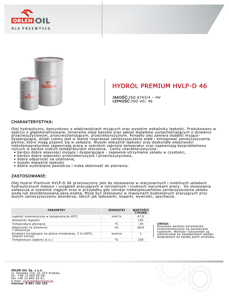 HYDROL PREMIUM HVLPD 46 JAKOŚĆ: JAKOŚĆ:ISO 6743/4 – HV LEPKOŚĆ: LEPKOŚĆ:ISO VG: 46 CHARAKTERYSTYKA: Olej hydrauliczny, bezcynkowy o właściwościach myjących oraz wysokim wskaźniku lepkości. Produkowany w oparciu o głębokorafinowane, mineralne oleje bazowe oraz pakiet dodatków uszlachetniających o działaniu przeciwzużyciowym, przeciwutleniającym, przeciwkorozyjnym. Ponadto olej zawiera dodatki myjąco dyspergujące, dzięki czemu jest w stanie rozpraszać zanieczyszczenia stałe i emulgować zanieczyszczenia płynne, które mogą pojawić się w układzie. Wysoki wskaźnik lepkości oraz doskonałe właściwości niskotemperaturowe zapewniają pracę w szerokim zakresie temperatur oraz zapewniają bezproblemowy rozruch w bardzo niskich temperaturach otoczenia. Cechy charakterystyczne: • bardzo dobre własności myjące i dyspergujące zapewnia utrzymanie układu w czystości, • bardzo dobre własności przeciwkorozyjne i przeciwzużyciowe, • dobra odporność na utlenianie, • wysoki wskaźnik lepkości • dobre wydzielanie powietrza i niska skłonność do pienienia. ZASTOSOWANIE: Olej Hydrol Premium HVLPD 46 przeznaczony jest do stosowania w stacjonarnych i mobilnych układach hydraulicznych maszyn i urządzeń pracujących w normalnych i trudnych warunkach pracy. Do stosowania zwłaszcza w systemie ciągłym oraz w przypadku gdy istnieje niebezpieczeństwo zanieczyszczenia układu wodą lub skondensowaną parą wodną. Może być stosowany w maszynach budowlanych pracujących przy dużym zanieczyszczeniu powietrza, takich jak ładowarki, koparki, wywrotki, spychacze. PARAMETRY Lepkość kinematyczna w temperaturze 40 0 C Wskaźniki lepkości Temperatura płynięcia Odporność na pienienie: I sekwencja Działanie korodujące na płytce miedzianej, 3 h/100 0 C, stopień korozji Temperatura zapłonu (t.o.) ORLEN OIL Sp. z o.o. ul. Opolska 114, 31323 Kraków, tel. +48 12 665 55 00, fax +48 12 665 55 01, email: [email protected], infolinia: 0 801 102 103 mm 2 /s 0C ml WARTOŚCI TYPOWE 47,5 155 39 20/0 wzorce 1 0C 230 JEDNOSTKI UWAGA: Powyższe wartości parametrów fizykochemicznych są wartościami typowymi. Wartości rzeczywiste są umieszczane na świadectwach jakości dołączanych do każdej partii produktu.