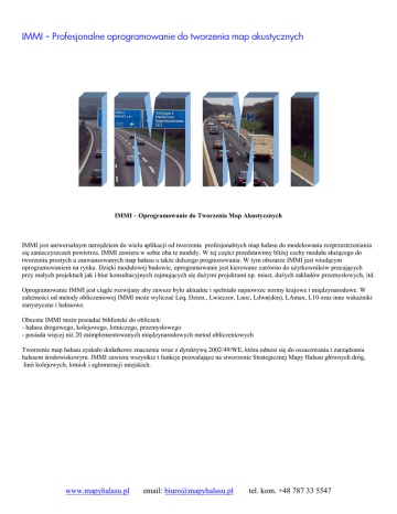 IMMI – Profesjonalne oprogramowanie do tworzenia map akustycznych IMMI – Oprogramowanie do Tworzenia Map Akustycznych IMMI jest uniwersalnym narzędziem do wielu aplikacji od tworzenia profesjonalnych map hałasu do modelowania rozprzestrzeniania się zanieczyszczeń powietrza. IMMI zawiera w sobie oba te moduły. W tej części przedstawimy bliżej cechy modułu służącego do tworzenia prostych u zaawansowanych map hałasu a także dalszego prognozowania. W tym obszarze IMMI jest wiodącym oprogramowaniem na rynku. Dzięki modułowej budowie, oprogramowanie jest kierowane zarówno do użytkowników pracujących przy małych projektach jak i biur konsultacyjnych zajmujących się dużymi projektami np. miast, dużych zakładów przemysłowych, itd. Oprogramowanie IMMI jest ciągle rozwijany aby zawsze było aktualne i spełniało najnowsze normy krajowe i międzynarodowe. W zależności od metody obliczeniowej IMMI może wyliczać Leq, Dzien., Lwieczor, Lnoc, Ldwn(den), LAmax, L10 oraz inne wskaźniki statystyczne i hałasowe. Obecnie IMMI może posiadać biblioteki do obliczeń: - hałasu drogowego, kolejowego, lotniczego, przemysłowego - posiada więcej niż 20 zaimplementowanych międzynarodowych metod obliczeniowych Tworzenie map hałasu zyskało dodatkowe znaczenie wraz z dyrektywą 2002/49/WE, która odnosi się do oszacowania i zarządzania hałasem środowiskowym. IMMI zawiera wszystkie t funkcje pozwalające na stworzenie Strategicznej Mapy Hałasu głównych dróg, linii kolejowych, lotnisk i aglomeracji miejskich. www.mapyhalasu.pl email: [email protected] tel. kom. +48 787 33 5547 IMMI – Profesjonalne oprogramowanie do tworzenia map akustycznych IMMI STANDARD To pakiet, który charakteryzuje się wyjątkowym stosunkiem możliwości do ceny i jest kierowany do początkujących projektantów zajmujących się tworzeniem map akustycznych. Cechuje się on zestawem funkcji pozwalającym na wykonanie typowych projektów akustycznych. Każdy projekt w IMMI Standard może zawierać nieskończoną ilość punktów siatki i elementów oraz do 200 przeszkód akustycznych, które odpowiadają około 100000 krawędzi uginających. Podstawowe właściwości: • w pełni funkcjonalne oprogramowanie służące do tworzenia map akustycznych oraz prognozowania rozprzestrzeniania się zanieczyszczeń powietrza do małych projektów • zarządzanie GIS i danymi georeferencyjnymi • moduł obliczeniowy dla propagacji hałasu oraz rozprzestrzeniania się zanieczyszczeń powietrza • pojedyncze punkty odbiorcze, siatka punktów odbiorczych (mapy) • import i eksport bitmap (włączając pliki georeferencyjne) • odbicia pierwszego rzędu • nieograniczona ilość źródeł • import oraz eksport plików DXF oraz tekstowych • podgląd 3D • metoda klasyfikacji Ldwn(Lden) według normy 2002/49/WE • specjalne funkcje (wstawianie budynków emitujących hałas, konstruowanie otworów, transformacje) • izolinie, kontury kolorowe oraz wypełnione, mapy numeryczne (mapy hałasu mapy koncentracji zanieczyszczeń) IMMI PLUS To pakiet kierowany do osób wykonujących analizy i projekty akustyczne różnych wielkości – od małych projektów tj. pozwolenia środowiskowe po mapy akustyczne małych miejscowości. IMMI Plus dzięki szerokiej gamie funkcji i narzędzi tj. baza danych widm, obliczanie poziomów wewnątrz budynków, propagacja hałasu na zewnątrz, przypisywanie udziału hałasu, pozwala na szybkie i poprawne wykonanie nawet bardzo zaawansowanych projektów. Pakiet ten pozwala na wprowadzanie nieskończonej ilości punktów siatki i elementów oraz do 1000 przeszkód akustycznych www.mapyhalasu.pl email: [email protected] tel. kom. +48 787 33 5547 IMMI – Profesjonalne oprogramowanie do tworzenia map akustycznych Właściwości (zawiera także wszystkie możliwości pakietu IMMI Standard): • do 1000 przeszkód co odpowiada 499000 poziomym krawędziom • odbicia wielokrotne (wyższego rzędu) • referencyjne bazy danych: emisja hałasu dla zakładów przemysłowych/ośrodków wypoczynkowych/placów budowy oraz lokali gastronomicznych • wyliczanie hałasu wewnątrz budynków (metoda Sabine) • automatyczna optymalizacja ekranów akustycznych • rozszerzone funkcje dla siatki (matematyczna analiza siatek, różnica siatek, mapy wskazujące przekroczenia wartości granicznych, itd.) • menadżer projektów • hałas przemysłowy: transmisja hałasu przez bariery akustyczne • prognozowanie czasu potrzebnego na obliczenie siatki aby zoptymalizować czas obliczeń i dokładność • przypisywanie udziału hałasu IMMI PREMIUM To najbardziej zaawansowany pakiet obliczeniowy służący do tworzenia projektów dużej skali, oferowany w przystępnej cenie. Zestaw funkcji dostępnych dla IMMI Premium jest dostosowany do zarządzania ogromną ilością danych w największych projektach (nieograniczona liczba elementów, źródeł, punktów odbiorczych siatki, przeszkód). W celu przyspieszenia obliczeń skomplikowanych map akustycznych wykorzystywane są obliczenia rozproszone AUDINOM. Spełnione są wszystkie wymagania zawarte w dyrektywie 2002/49/WE a w szczególności mapy strategiczne, obliczenia na fasadach, itd. Właściwości (w pakiecie tym zawarte są wszystkie możliwości IMMI Plus): • nieograniczona liczba przeszkód oraz krawędzi uginających • do 4 milionów węzłów modelu terenu (praktycznie nieograniczona liczba z wykorzystaniem obliczeń rozproszonych AUDINOM) • technologia AUDINOM dla obliczeń rozproszonych na komputerach wielordzeniowych oraz będących w sieci • obliczenia siatek pionowych (przekrojów pionowych) • obliczenia poziomów na fasadzie (2002/49/WE) • transformacja współrzędnych – import oraz eksport obrazów bitmap z danymi GIS z GoogleEarth™ • w cenie zawarty 1 klient obliczeniowy www.mapyhalasu.pl email: [email protected] tel. kom. +48 787 33 5547 IMMI – Profesjonalne oprogramowanie do tworzenia map akustycznych 