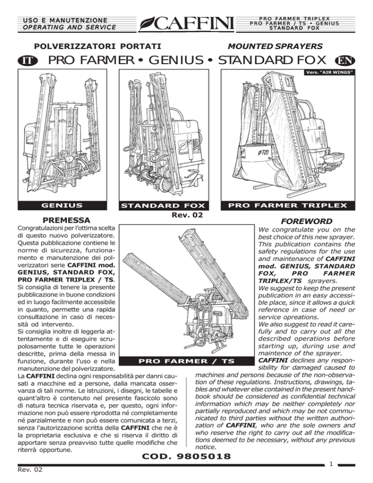 12345678901234567890123456789012123456789012345678 12345678901234567890123456789012123456789012345678 12345678901234567890123456789012123456789012345678 USO E MANUTENZIONE 12345678901234567890123456789012123456789012345678 12345678901234567890123456789012123456789012345678 12345678901234567890123456789012123456789012345678 12345678901234567890123456789012123456789012345678 OPERATING AND SERVICE 12345678901234567890123456789012123456789012345678 12345678901234567890123456789012123456789012345678 12345678901234567890123456789012123456789012345678 PRO FARMER TRIPLEX 12345678901234567890123456789012123456789012345678 12345678901234567890123456789012123456789012345678 PRO FARMER / TS • GENIUS 12345678901234567890123456789012123456789012345678 12345678901234567890123456789012123456789012345678 STANDARD FOX POLVERIZZATORI PORTATI MOUNTED SPRAYERS PRO FARMER • GENIUS • STANDARD FOX EN IT Vers. “AIR WINGS” GENIUS PREMESSA STANDARD FOX PRO FARMER TRIPLEX Rev. 02 FOREWORD Congratulazioni per l’ottima scelta We congratulate you on the di questo nuovo polverizzatore. best choice of this new sprayer. Questa pubblicazione contiene le This publication contains the norme di sicurezza, funzionasafety regulations for the use mento e manutenzione dei poland maintenance of CAFFINI verizzatori serie CAFFINI mod. mod. GENIUS, STANDARD GENIUS, STANDARD FOX, FOX, PRO FARMER PRO FARMER TRIPLEX / TS. TRIPLEX/TS sprayers. Si consiglia di tenere la presente We suggest to keep the present pubblicazione in buone condizioni publication in an easy accessied in luogo facilmente accessibile ble place, since it allows a quick in quanto, permette una rapida reference in case of need or consultazione in caso di necesservice opreations. sità od intervento. We also suggest to read it carefully and to carry out all the Si consiglia inoltre di leggerla atdescribed operations before tentamente e di eseguire scrustarting up, during use and polosamente tutte le operazioni maintence of the sprayer. descritte, prima della messa in CAFFINI declines any responPRO FARMER / TS funzione, durante l’uso e nella sibility for damaged caused to manutenzione del polverizzatore. machines and persons because of the non-observaLa CAFFINI declina ogni responsabilità per danni caution of these regulations. Instructions, drawings, tasati a macchine ed a persone, dalla mancata osserbles and whatever else contained in the present handvanza di tali norme. Le istruzioni, i disegni, le tabelle e book should be considered as confidential technical quant’altro è contenuto nel presente fascicolo sono information which may be neither completely nor di natura tecnica riservata e, per questo, ogni inforpartially reproduced and which may be not commumazione non può essere riprodotta né completamente nicated to third parties without the written authoriné parzialmente e non può essere comunicata a terzi, zation of CAFFINI, who are the sole owners and senza l’autorizzazione scritta della CAFFINI che ne è who reserve the right to carry out all the modificala proprietaria esclusiva e che si riserva il diritto di tions deemed to be necessary, without any previous apportare senza preavviso tutte quelle modifiche che notice. riterrà opportune. COD. 9805018 Rev. 02 1 - Dichiarazione CE di Conformità ai sensi della direttiva 2006/42/CE e 2004/108/CE - Declaration of EC conformity conform to the essential health and safety requirements as laid down in the directive 2006/42/CE and 2004/108/CE La Ditta sottoscritta / The untersigned Firm CAFFINI S.p.A. Via G. Marconi, 2 - 37050 Palù (Vr) - Italia P. IVA / VAT N. 02945220230 per tramite del / through: GRIGOLATO p.i. FABIANO in qualità di / in quality of: Responsabile Tecnico / Technical Manager Dichiara sotto la propria responsabilità che la macchina Under its own responsability declares that the following machines TIPO / TYPE: MODELLO / MODEL: MATRICOLA / SERIAL NUMBER: ZK4 ANNO / YEAR OF CONSTRUCTION: É conforme ai Requisiti Essenziali di sicurezza e di Tutela della Salute di cui alla Direttiva 2006/42/CE. Per la verifica della conformità di cui alle Direttive sopra menzionate, sono state utilizzate le seguenti Norme Armonizzate: UNI EN 907: 1998, UNI EN ISO 4254-1 nonchè la specifica tecnica ISO 11684: 1995 Conforms to the safety regulations as laid down in the Directive 2006/42/CE. The following Unified Norms UNI EN 907: 1998, UNI EN ISO 4254-1 and the specific technology ISO 11684: 1995 were consulted when checking for conformity Il fascicolo tecnico è costituito dal / The technical file is compiled by: GERARDO p.i. CAFFINI in qualità di / in quality of: Direttore Tecnico / Technical Director Nome e qualifica del delegato dal fabbricante: Name and qualification of the manufacturer’s representative: (Grigolato p.i. Fabiano) Palù, 12345678901234567890123456789012123456789012345678 12345678901234567890123456789012123456789012345678 12345678901234567890123456789012123456789012345678 USO E MANUTENZIONE 12345678901234567890123456789012123456789012345678 12345678901234567890123456789012123456789012345678 12345678901234567890123456789012123456789012345678 12345678901234567890123456789012123456789012345678 OPERATING AND SERVICE Rev. 02 12345678901234567890123456789012123456789012345678 12345678901234567890123456789012123456789012345678 12345678901234567890123456789012123456789012345678 PRO FARMER TRIPLEX 12345678901234567890123456789012123456789012345678 12345678901234567890123456789012123456789012345678 PRO FARMER / TS • GENIUS 12345678901234567890123456789012123456789012345678 12345678901234567890123456789012123456789012345678 STANDARD FOX 3 12345678901234567890123456789012123456789012345678 12345678901234567890123456789012123456789012345678 12345678901234567890123456789012123456789012345678 12345678901234567890123456789012123456789012345678 USO E MANUTENZIONE 12345678901234567890123456789012123456789012345678 12345678901234567890123456789012123456789012345678 123456789012345678901234567