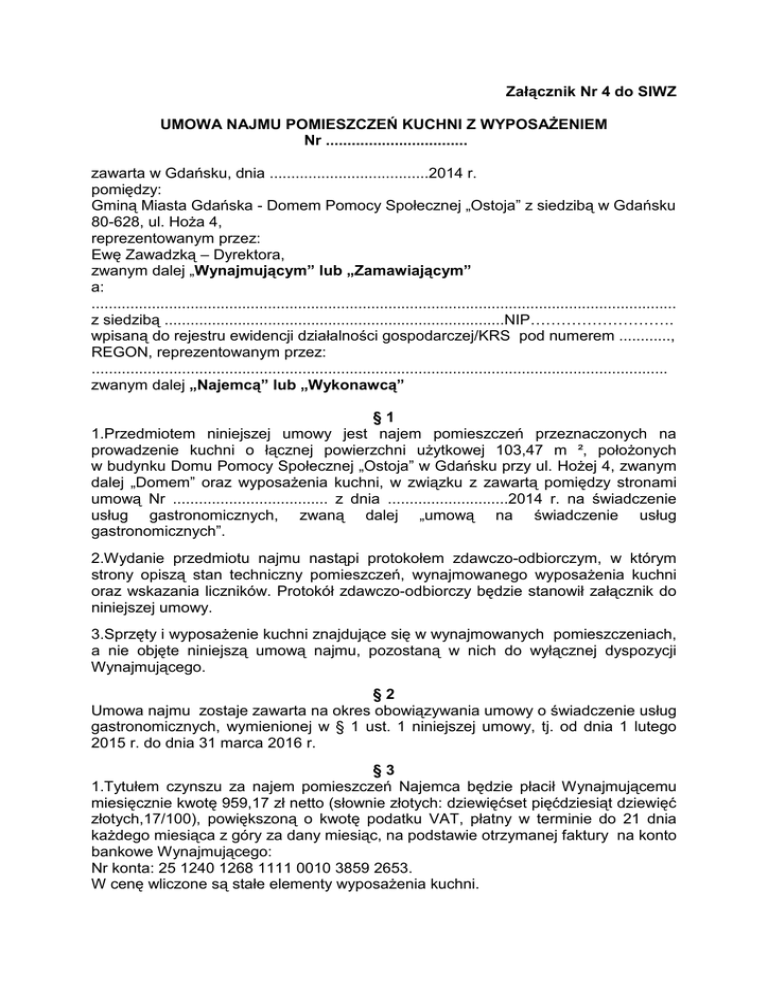 Załącznik Nr 4 do SIWZ UMOWA NAJMU POMIESZCZEŃ KUCHNI Z WYPOSAŻENIEM Nr ................................. zawarta w Gdańsku, dnia .....................................2014 r. pomiędzy: Gminą Miasta Gdańska - Domem Pomocy Społecznej „Ostoja” z siedzibą w Gdańsku 80-628, ul. Hoża 4, reprezentowanym przez: Ewę Zawadzką – Dyrektora, zwanym dalej „Wynajmującym” lub „Zamawiającym” a: ........................................................................................................................................ z siedzibą ...............................................................................NIP………………………. wpisaną do rejestru ewidencji działalności gospodarczej/KRS pod numerem ............, REGON, reprezentowanym przez: ...................................................................................................................................... zwanym dalej „Najemcą” lub „Wykonawcą” §1 1.Przedmiotem niniejszej umowy jest najem pomieszczeń przeznaczonych na prowadzenie kuchni o łącznej powierzchni użytkowej 103,47 m ², położonych w budynku Domu Pomocy Społecznej „Ostoja” w Gdańsku przy ul. Hożej 4, zwanym dalej „Domem” oraz wyposażenia kuchni, w związku z zawartą pomiędzy stronami umową Nr .................................... z dnia ............................2014 r. na świadczenie usług gastronomicznych, zwaną dalej „umową na świadczenie usług gastronomicznych”. 2.Wydanie przedmiotu najmu nastąpi protokołem zdawczo-odbiorczym, w którym strony opiszą stan techniczny pomieszczeń, wynajmowanego wyposażenia kuchni oraz wskazania liczników. Protokół zdawczo-odbiorczy będzie stanowił załącznik do niniejszej umowy. 3.Sprzęty i wyposażenie kuchni znajdujące się w wynajmowanych pomieszczeniach, a nie objęte niniejszą umową najmu, pozostaną w nich do wyłącznej dyspozycji Wynajmującego. §2 Umowa najmu zostaje zawarta na okres obowiązywania umowy o świadczenie usług gastronomicznych, wymienionej w § 1 ust. 1 niniejszej umowy, tj. od dnia 1 lutego 2015 r. do dnia 31 marca 2016 r. §3 1.Tytułem czynszu za najem pomieszczeń Najemca będzie płacił Wynajmującemu miesięcznie kwotę 959,17 zł netto (słownie złotych: dziewięćset pięćdziesiąt dziewięć złotych,17/100), powiększoną o kwotę podatku VAT, płatny w terminie do 21 dnia każdego miesiąca z góry za dany miesiąc, na podstawie otrzymanej faktury na konto bankowe Wynajmującego: Nr konta: 25 1240 1268 1111 0010 3859 2653. W cenę wliczone są stałe elementy wyposażenia kuchni. Czynsz za najem pomieszczeń ulega zmianie w przypadku zmiany stawki bazowej najmu, określonej przepisami prawa miejscowego, lub zasad jej korygowania przy zastosowaniu algorytmu umożliwiającego obniżenie tej stawki. Stawka podatku VAT ulega zmianie w przypadku zmiany obowiązujących przepisów prawa. 2.Tytułem najmu wyposażenia i sprzętu kuchni Najemca będzie płacił Wynajmującemu miesięcznie kwotę ryczałtową 1.100 zł netto (słownie złotych: jeden tysiąc sto,00/100), powiększoną o podatek VAT, płatną w terminie do 21 dnia każdego miesiąca z góry za dany miesiąc na podstawie otrzymanej faktury na konto bankowe Wynajmującego: Nr konta: 25 1240 1268 1111 0010 3859 2653. Stawka podatku VAT ulega zmianie w przypadku zmiany obowiązujących przepisów prawa. 3. Wykonawca odpowiada za wynajmowane urządzenia i naczynia (m.in. za ich stan, czystość, prawidłową eksploatację, należyte przechowywanie i zabezpieczenie przed dostępem osób trzecich) oraz uzupełnia na bieżąco braki w wynajmowanych zasobach i dokonuje niezbędnych bieżących napraw (przez bieżące naprawy rozumie się naprawy, których koszt nie przekracza 500zł), w takim zakresie w jakim jest to konieczne do wykonywania przedmiotu zamówienia. Jeżeli Zamawiający stwierdzi braki, uszkodzenie, niewłaściwą eksploatację sprzętu lub naczyń Zamawiający jest uprawniony do zakupu brakujących lub zniszczonych urządzeń lub naczyń oraz do wykonania bieżących napraw na koszt Wykonawcy, co nie zwalnia Wykonawcy z obowiązku o którym mowa w zdaniu poprzedzającym. Zamawiający pomniejszy o poniesioną z tego tytułu szkodę (wartość brakującego lub zniszczonego urządzenia lub jego naprawy) wynagrodzenie Wykonawcy należne od Zamawiającego, o którym mowa w § 8 umowy na świadczenie usług gastronomicznych. Jeżeli koszt bieżącej naprawy przekroczy 500zł, (co wymaga udokumentowania przez Wykonawcę ekspertyzą niezależnego rzeczoznawcy na koszt Wykonawcy) Zamawiający może wyrazić zgodę na partycypację w kosztach naprawy przekraczających kwotę 500zł. Jeżeli wynajmowane urządzenia stracą zdatność do użytku w trakcie trwania umowy ze względu na normalne zużycie wówczas Wykonawca jest zobowiązany protokolarnie zdać to urządzenie Zamawiającemu. Zamawiający nie ma obowiązku dostarczyć Wykonawcy nowego urządzenia – w takim wypadku wynagrodzenie, o którym mowa w § 3 ust. 2 może ulec obniżeniu w stosunku w jakim wartość tego urządzenia stanowi udział w wynagrodzeniu określonym w § 3 ust. 2 . Jeżeli ekspertyza rzeczoznawcy wykaże, że urządzenie było nieprawidłowo eksploatowane przez Wykonawcę Zamawiający pomniejszy o poniesioną z tego tytułu szkodę (wartość zniszczonego urządzenia lub jego naprawy oraz ekspertyzy rzeczoznawcy) wynagrodzenie Wykonawcy należne od Zamawiającego, o którym mowa w § 8 umowy na świadczenie usług gastronomicznych. Wykonawca odpowiada za wynajmowane urządzenia i naczynia i jest zobowiązany stosować do ich konserwacji i utrzymania w czystości środki chemiczne zgodnie z zaleceniami producenta. Wykonawca upoważnia Zamawiającego, do tego aby Zamawiający w razie stwierdzenia nieodpowiednich środków czystości stosowanych przez Wykonawcę, mógł zakupić środki zalecone przez producenta w celu przekazania ich do stosowania Wykonawcy, 