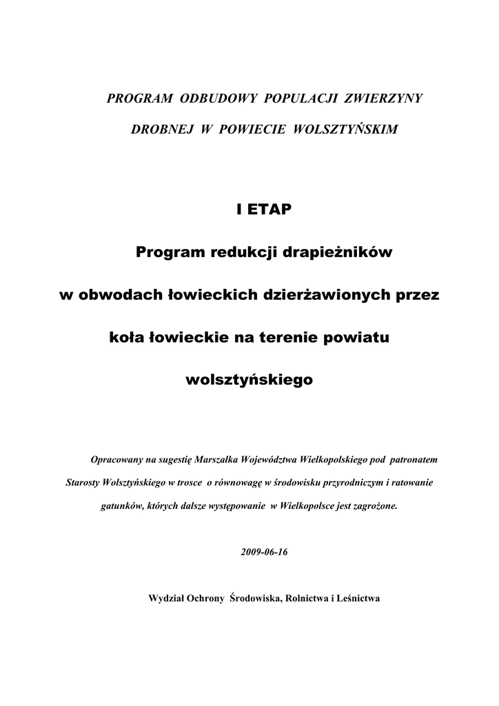 PROGRAM ODBUDOWY POPULACJI ZWIERZYNY DROBNEJ W POWIECIE WOLSZTYŃSKIM I ETAP Program redukcji drapieŜników w obwodach łowieckich dzierŜawionych przez koła łowieckie na terenie powiatu wolsztyńskiego Opracowany na sugestię Marszałka Województwa Wielkopolskiego pod patronatem Starosty Wolsztyńskiego w trosce o równowagę w środowisku przyrodniczym i ratowanie gatunków, których dalsze występowanie w Wielkopolsce jest zagroŜone. 2009-06-16 Wydział Ochrony Środowiska, Rolnictwa i Leśnictwa POWIAT WO L S Z T Y Ń S K I - w obecnych granicach istnieje od 1 stycznia 1999 roku. Geograficznie teren powiatu łączy kraj Wysoczyzny Leszczyńskiej i Pradoliny Warszawsko – Berlińskiej. Atutem wynikającym z tego połoŜenia jest obfitość lasów i jezior, które stanowią 1/3 obszaru powiatu. To zaś sprzyja rozwojowi turystyki w takich miejscowościach jak: Wieleń, Osłonin, Rudno, Wilcze, Karpicko, Grójec Wielki, Boruja. W skład powiatu wchodzą trzy gminy: Przemęt, Siedlec i Wolsztyn . Na terenie powiatu wolsztyńskiego wydzielonych zostało 13 obwodów łowieckich o łącznej powierzchni 62 443 ha, które dzierŜawi 10 kół łowieckich. Lasy Państwowe, których powierzchnia stanowi około 1/3 powierzchni obwodów łowieckich administrowane są przez Nadleśnictwa w Kościanie i Wolsztynie, niewielka część lasów jest w administracji Nadleśnictwa Babimost i Sława. Obwody łowieckie powiatu wolsztyńskiego – rozporządzenie Nr 32/2004 Wojewody Wielkopolskiego z dnia 19 marca 2004 r. w sprawie podziału województwa wielkopolskiego na obwody łowieckie (Wielk.04.42.1022). 1. Obwód Łowiecki Nr 352”TUCHORZA” (Nr 20) Powierzchnia – 5,390 ha – leśny DzierŜawca: Koło Łowieckie Nr 28 „DROP” w Poznaniu 2. Obwód łowiecki Nr 353”GODZISZEWO”(Nr 21) Powierzchnia – 5.670 ha – polny DzierŜawca: Koło Łowieckie Nr 94 „ODYNIEC” w Belęcinie 3. Obwód łowiecki Nr 354 „WOLSZTYN” (Nr 34) Powierzchnia 4.400 ha – leśny DzierŜawca: Koło Łowieckie Nr 93 „DIANA” w Wolsztynie 4. Obwód łowiecki Nr 355 „śODYŃ” (Nr 35) Powierzchnia 5.770 ha – polny 2 DzierŜawca: Koło Łowieckie Nr 93 „DIANA” w Wolsztynie 5. Obwód Nr 356 „KOPANICA” (Nr 36) Powierzchnia – 3.880 ha – leśny DzierŜawca: Koło Łowieckie Nr 95 „CZAPLA” w Chobienicach 6. Obwód Łowiecki Nr 357 „TORFIARNIA” (Nr 2) Powierzchnia - 4158 ha – polny DzierŜawca: Kolo Łowieckie Nr 37 „KACZOR” w Rakoniewicach. 7. Obwód łowiecki Nr 358 „KLUCZEWO” (NR 3) Powierzchnia: 4.665 ha -polny DzierŜawca: Koło Łowieckie Nr 9 „KNIEJA” w Śmiglu. 8. Obwód Łowiecki Nr 359 „NOWA DĄBROWA”” (Nr 48) Powierzchnia: 3.800 ha - polny DzierŜawca: Koło Łowieckie Nr 37 „KACZOR” w Rakoniewicach. 9. Obwód łowiecki Nr 360 „KĘBŁOWO” (Nr 49) Powierzchnia: 6.340 ha - polny DzierŜawca: Koło Łowieckie Nr 3 „SZARAK” w StrzyŜewicach. 10. Obwód łowiecki Nr 361 „OBRA DOLNA” (NR 50) Powierzchnia: 3.810 ha - polny DzierŜawca: Koło Łowieckie „śURAW” w Babimoście 11. Obwód Łowiecki Nr 362 „ŚWIĘTNO” (Nr 55) Powierzchnia: 4.025 ha - leśny DzierŜawca: Koło Łowieckie Nr 24 „WYDRA” w Świętnie. 12. Obwód łowiecki Nr 363 „BŁOTNICA” (Nr 12) Powierzchnia: 3.345 ha – polny 3 DzierŜawca: Koło Łowieckie Nr 100 „DZIK” w Mochach 13. Obwód łowiecki Nr 364 „MOCHY” (Nr 13) Powierzchnia: 7.190 ha - polny DzierŜawca: Koło Łowieckie Nr 100 „DZIK” w Mochach. I. WSTĘP Las to wspólny świat roślin i zwierząt, to przez całe dzieje świata naturalnym uzupełnieniem tego są łowiectwo i myśliwi, jako dopełnienie leśnej przyrody. Człowiek polował zaspakajając swoje potrzeby bytowe. Przez wieki zmieniła się forma i potrzeba polowania. Współczesny myśliwy dysponuje bardzo precyzyjną bronią, a obecne łowiectwo to wielka sztuka współŜycia z Ŝywą przyrodą i umiejętność brania z jej darów tyle ile moŜna nie naruszając źródła jej bogactwa. Myśliwi to środowisko o własnej toŜsamości i własnych interesach, a takŜe unikalnej wiedzy w wielu dziedzinach związanych z przyrodą i jej ochroną. Cywilizacja ubiegłego wieku doprowadziła do ogromnego wpływu człowieka na środowisko i sprawiła, Ŝe kontrola (myśliwych) nad zwierzyną wolno Ŝyjącą jest konieczna w stosunku do ilości zwierzyny grubej mając na uwadze interesy leśników i rolników – szkody łowieckie, jak i zwierzyny drobnej, która jest na skraju wyginięcia, być moŜe za sprawą nadmiernej ilości szkodników i drapieŜników łowieckich, niektóre bowiem od wielu lat są pod całoroczną ochroną. Myśliwi, to grupa ludzi o duŜej wiedzy przyrodniczej, dobrze przygotowana do spełnienia postawionego przez Ministra Środowiska zadania, gospodarowania zwierzętami łownymi na podstawie ustawy – Prawo łowieckie. Opracowanie powiatowego programu redukcji drapieŜników jest doskonałą okazją do nakreślenia krótkiej historii łowiectwa w naszym regionie w ostatnich 50 latach, zaznaczenia 4 zmian, które w tak krótkim czasie nastąpiły szczególnie w pozyskaniu gatunków zwierząt łownych. W czerwcu 1968 r. „Głos Wolsztyński” zamieścił art. pod tytułem „Najlepsi myśliwi” cyt. „Ze sprawozdania z działalności Powiatowej Rady Łowieckiej złoŜonego przez łowczego powiatowego dowiadujemy się, Ŝe w łowieckim roku gospodarczym odstrzelono: - 47 jeleni, - 169 saren, - 133 dziki, - 1716 zajęcy, - 195 kuropatw, - 107 królików, - 115 dzikich kaczek Koła Łowieckie dostarczyły równieŜ cennych dewiz dla gospodarki narodowej za odstrzelone dwa jelenie odstrzelone przez myśliwych zagranicznych oraz odłowionych na eksport do Francji 185 Ŝywych zajęcy. Pozyskanie dzików w stosunku do lat ubiegłych wzrosło o 49%.” Z podsumowania pozyskanej zwierzyny w 1968 r. widać jak znacznie uległo pozyskanie zwierzyny w ostatnich latach. Na zające, króliki, kuropatwy praktycznie nie poluje