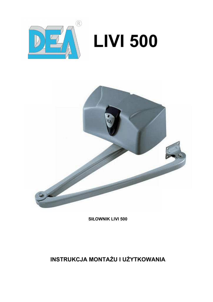 LIVI 500 SIŁOWNIK LIVI 500 INSTRUKCJA MONTAŻU I UŻYTKOWANIA DEKLARACJA PRODUCENTA (Zgodna z Dyrektywą 98/37/CE – Załącznik II – część B) Niżej podpisany, przedstawiciel następującego konstruktora DEA SYSTEM S.r.l. Via Monte Summano, 45/E 36010 ZANE’ (VI) – Włochy deklaruje, że urządzenia wymienione poniżej 500, 500L, 501, 501L, 500R, 502, 502L, 503, 503L, 502R, 503R, 500/24, 501/24, 502/24, 503/24 Napędy elektromechaniczne do bram skrzydłowych są zgodne z przepisami prawnymi określonymi przez następujące Dyrektywy: Dyrektywa 98/37/CE (Dyrektywa o Maszynach) i kolejne modyfikacje Dyrektywa 73/23/CEE (Dyrektywa O Niskim Napięciu) i kolejne modyfikacje • Dyrektywa 89/336/CEE (Dyrektywa o EMC) i kolejne modyfikacje oraz, że zostały zastosowane wszystkie normy i specyfikacje techniczne wymienione niżej: EN 292/1, EN 294, EN 349, EN 1050, Niżej podpisany deklaruje, że w/w napędy nie mogą być używane, dopóki urządzenie, w którym zostały zastosowane, nie otrzyma znaku certyfikacji CE i nie będzie zgodne z Dyrektywą 98/37/CE. ZANE` (VI) Włochy, 13/10/03 Administrator 2 SPIS TREŚCI Deklaracja producenta WSTĘP. 1. ZGODNOŚĆ PRODUKTU. 2. OSTRZEŻENIA DOTYCZĄCE POTENCJALNYCH NIEBEZPIECZEŃSTW. 3. DOSTĘPNE MODELE I ZAWARTOŚĆ OPAKOWANIA. 4. INSTRUKCJA MONTAŻU I UŻYTKOWANIA. 4.1. Opis produktu. 4.2. Dane techniczne. 4.3. Wskazówki dotyczące oznakowania. 4.4. Wymagane warunki użytkowania. 4.5. Instrukcje bezpiecznego postępowania. 4.5.1. Transport. 4.5.2. Montaż. 4.5.3. Podłączenie. 4.5.4. Zastosowanie i użytkowanie. 4.5.5. Regulacja. 4.5.6. Konserwacja i naprawy. 4.6. Szkolenie. 4.7. Przeciwwskazania użytkowania. 5. WYKAZ PODZESPOŁÓW. 6. ZESPÓŁ KOMPONENTÓW PEŁNEGO SYSTEMU AUTOMATYZACJI. 6.1 Ochrona krawędzi czołowej skrzydeł bramy. 6.2 Niebezpieczeństwo zmiażdżenia przy otwieraniu. 6.3 Niebezpieczeństwo uderzenia w strefie zamykania lub otwierania. 3 WSTĘP CEL PREZENTOWANEJ INSTRUKCJI Niniejsza instrukcja została opracowana przez producenta i stanowi część integralną produktu. Zawarte w niej wytyczne skierowane są do instalatorów odpowiednio przygotowanych i wykwalifikowanych. Producent zaleca uważne zapoznanie się z niniejszą instrukcją i jej zachowanie w celu korzystania z niej w przyszłości. W rozdziale 2: ”Ostrzeżenia dotyczące potencjalnych niebezpieczeństw” i w rozdziale 4: „Instrukcja montażu” zawarte są informacje świadczące, iż DEA SYSTEM oferuje produkt spełniający Zasadnicze Wymogi Bezpieczeństwa określone w Dyrektywie o Maszynach (Dyrektywa Europejska 98/37/CE). Zaleca się uważne przeczytanie w/w rozdziałów, gdyż zawiera on ważne wskazówki dotyczące bezpiecznej instalacji, montażu, użytkowania i konserwacji oraz istotne ostrzeżenia dotyczące niebezpieczeństw, które mogą zaistnieć pomimo zastosowania opisanych wskazówek. Produkt winien stanowić integralną część kompletnych systemów zamykania, do których odnoszą się odpowiednie wytyczne ustawodawcze. Rozdział 6 „Zespół komponentów pełnego systemu automatyzacji” zawiera niektóre użyteczne wskazówki pozwalające na respektowanie Zasadniczych Wymogów Bezpieczeństwa dla poszczególnych typów systemów zamykania. 1. ZGODNOŚĆ PRODUKTU LIVI 500 jest produktem posiadającym certyfikat CE. DEA SYSTEM gwarantuje zgodność produktu z Dyrektywami Europejskimi: 98/37/CE dotyczącą bezpieczeństwa maszyn, 89/336/CE i k.m. dotyczącą zgodności elektromagnetycznej oraz 72/23/CE i k.m. dotyczącą urządzeń elektrycznych o niskim napięciu). Do niniejszej instrukcji DEA SYSTEM załącza Deklarację Konstruktora (Dyrektywa 98/37/CE Art. 4, paragraf 2). 2. OSTRZEŻENIA DOTYCZĄCE POTENCJALNYCH NIEBEZPIECZEŃSTW Producent zaleca uważne zapoznanie się z niniejszym rozdziałem; nie respektowanie poniższych ostrzeżeń może spowodować powstanie niebezpiecznych sytuacji. UWAGA. Używanie produktu w niewłaściwych warunkach i do innych celów, nie przewidzianych przez producenta, może prowokować sytuacje niebezpieczne; w związku z tym zaleca się przestrzeganie warunków przedstawionych w niniejszej instrukcji. A1 UWAGA. DEA SYSTEM przypomina, że wybór, wykorzystanie i montaż wszystkich urządzeń i akcesoriów, stanowiących kompletny system automatyzacji, powinien odbywać się w zgodności z Dyrektywami Europejskimi: 98/37/CE (Dyrektywa o Maszynach), 89/336/CE i k.m. (dotyczącą kompatybilności elektromagnetycznej), 72/23/CE i k.m. (dotyczącą urządzeń elektrycznych zasilanych niskim napięciem). We wszystkich krajach nie będących członkami Unii Europejskiej, obok obowiązujących norm krajowych, zaleca się także respektowanie przepisów zawartych w wymienionych dyrektywach; ich przestrzeganie gwarantuje zadowalający poziom bezpieczeństwa. A2 UWAGA. W żadnym wypadku nie należy używać produktu w środowisku zagrożonym wybuchem. W żadnym wypadku nie należy również używać produktu w warunkach mogących powodować uszkodzenie poszczególnych elementów produktu. A3 UWAGA. Którekolwiek z działań związanych z montażem, konserwacją, czyszczeniem lub naprawą całego systemu zamykania winny być wykonywane wyłącznie przez osoby wykwalifikowane; wszelkie wskazane czynności należy wykonywać przy odłączonym zasilaniu elektrycznym oraz należy przestrzegać skrupulatnie wszystkich norm dotyczących urządzeń elektrycznych, obowiązujących w kraju, w którym dokonuje się automatyzacji bramy. A4 UWAGA. Wykorzystywanie części zamiennych innych niż te wskazane przez DEA SYSTEM i/lub montaż niepoprawny, mogą prowokować sytuacje niebezpieczne dla ludzi, zwierząt i przedmiotów materialnych, a także wpływać na wadliwe funkcjonowanie urządzenia; zaleca się stosowanie części zamiennych oryginalnych, wskazanych przez DEA SYSTEM i przestrzeganie instrukcji montażu. A5 UWAGA. Znajomość działania systemu odblokowania na kluczyk (zob. rys. F9), w które wyposażon