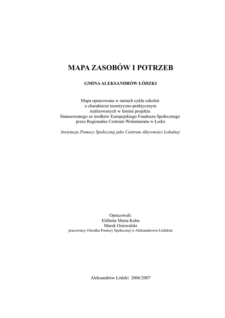 MAPA ZASOBÓW I POTRZEB GMINA ALEKSANDRÓW ŁÓDZKI Mapa opracowana w ramach cyklu szkoleń o charakterze teoretyczno-praktycznym realizowanych w formie projektu finansowanego ze środków Europejskiego Funduszu Społecznego przez Regionalne Centrum Wolontariatu w Łodzi Instytucja Pomocy Społecznej jako Centrum Aktywności Lokalnej Opracowali: Elżbieta Maria Kuba Marek Osiewalski pracownicy Ośrodka Pomocy Społecznej w Aleksandrowie Łódzkim Aleksandrów Łódzki 2006/2007 WSTĘP Oddajemy do Państwa użytku Mapę zasobów i potrzeb Gminy Aleksandrów Łódzki, która została wykonana jako „praca domowa” w ramach cyklu intensywnych szkoleń o charakterze teoretyczno-praktycznym. Na cykl szkoleń złożyło się 6 tematycznych, za każdym razem 3 dniowych spotkań szkoleniowych obejmujących tematykę aktywności lokalnej rozwijanej w oparciu o partnerstwo lokalne, tworzenie grup samopomocowych, grup obywatelskich, poszukiwanie funduszy na realizowanie działalności społecznej w oparciu o projekty socjalne ( z pominięciem form biurokratycznych ). Ponadto w ramach wyjazdów studyjnych mieliśmy możliwość wizytowania Ośrodków Pomocy Społecznej – w Kutnie oraz w Kielcach. Mogliśmy w ten sposób dowiedzieć się jak pracują instytucje pomocy społecznej jako centra aktywności lokalnej. Uczestnicząc w spotkaniach szkoleniowych utwierdziliśmy się w przekonaniu, że dobrze zorganizowane i prężnie działające społeczności lokalne stanowią ważny element społeczeństwa demokratycznego. Ich siła oczywiście w dużym stopniu uzależniona jest od uwarunkowań historycznych, kulturowych i ekonomicznych, które sprzyjają bądź nie aktywności społecznej na bazie grup samopomocowych, obywatelskich czy w oparciu o partnerstwo społeczne. Tego rodzaju działalność odnosi pozytywne i skuteczne rezultaty pod warunkiem, że jest prowadzona poza schematami utartymi w instytucjach publicznych. Liczymy na to, że obecnie jest dobry czas i miejsce na aktywizowanie wyobraźni i predyspozycji do ożywiania zbiorowości lokalnej. Takich osób na terenie naszej Gminy jest na pewno dużo. Warto aby uzmysłowiły sobie swój potencjał i umiejętności do ożywiania działań lokalnych. Tego typu osobę określa się pojęciem animator społeczny. W ślad za zeszytem edukacyjnym Animator społeczny katalizator zmian autorstwa Pawła Jordana i Bohdana Skrzypczyka wydanym przez CAL w Warszawie w 2005 roku cytujemy: „Pojęcie „animacja”, choć po raz pierwszy użyte w latach 40-tych, jest zakorzenione w ruchu kontrkultury, kontestacji i buntu młodzieży lat 60-tych. Rewolucja społeczna, jaka dotknęła wówczas kraje Europy Zachodniej i USA, była reakcją na kumulujące się od dłuższego czasu nowe zjawiska, związane z niedopasowaniem systemów społecznych (edukacji, polityki, opieki społecznej) do dynamiki życia społecznego. Refleksja nad wartościami podstawowymi jak: wolność, miłość, solidarność, sprawiedliwość, odpowiedzialność ukazała daleko posunięty dogmatyzm i schematyzm, dominujące w życiu instytucji publicznych, których symbolem była przede wszystkim szkoła.. Animacja była próbą odrzucenia formalizacji, hierarchizacji i biurokratyzacji w relacjach między ludźmi. Uzmysłowiono sobie, że prawdziwe życie społeczne nie istnieje bez grup, że to właśnie one są szkołą, w której zdobywamy umiejętności indywidualnego i zbiorowego działania. Animacja miała odrodzić tę naturalną, autentyczną komunikację społeczną i umożliwić organizowanie stosunków między grupami ludzi w oparciu o ich twórczą aktywność. W proponowanym ujęciu animacja jest metodą edukacyjną skupiającą się na pobudzaniu obywateli do działania na rzecz społeczności lokalnej, a więc grupy zamieszkującej określone terytorium, gdzie pomiędzy jej członkami występuje poczucie wspólnotowej identyfikacji i więzi. Odnajdywanie i uruchamianie sił tkwiących w środowisku, dla jego rozwoju, to wspólny cel animatorów kultury, pedagogów 2 społecznych, pracowników socjalnych, liderów lokalnych instytucji, samorządowców a nawet przedsiębiorców. Pojęcie „animacja” i „animator” zadomowiło się na dobre w naszym słowniku w latach osiemdziesiątych. Obecnie zaś staje się uniwersalną etykietą, używaną dość dowolnie w sferze kultury, turystyki, samorządności, religii, pomocy społecznej, a nawet gospodarki. Cóż więc oznacza to słowo wytrych ? W podstawowym słownikowym wymiarze jest to: „ożywienie (łac. anima), zachęcenie, skłanianie do działania”. Warto zauważyć, że nikt nie ma przymusu podejmowania działalności społecznej, ale rolą animatora społecznego – osoby ożywiającej społeczność ( nie mylić z liderem ) jest przekonywanie jednostek i grup do zaktywizowania ich wyobraźni w celu podjęcia działań samopomocowych na rzecz rozwiązywania problemów lokalnych. W gruncie rzeczy mieszkańcy powinni zrozumieć, że pomaganie innym jest i dobrowolnym i dobrym sposobem na samodoskonalenie. To daje satysfakcję. W części pierwszej mapy zaprezentowaliśmy zasoby lokalne (gminne), czyli wykaz jednostek samorządowych i rządowych usytuowanych na terenie Gminy Aleksandrów Łódzki. Ich znajomość ułatwi poruszanie się podczas realizacji lokalnego zadania samopomocowego. W części drugiej przedstawiamy analizę kwestionariusza ankiety. Zwracamy uwagę na dominujące potrzeby gminne wskazane przez respondentów. W zdecydowanej większości byli nimi mieszkańcy terenów miejskich. Summa summarum przekazaliśmy do społecznego obiegu 250 ankiet, wypełnionych wróciło – 107 ankiet, czyli nawet nie 50% przekazanych. Z materiału badawczego można wysnuć wniosek, że mieszkańcy naszej Gminy wykazują małą aktywność społeczną. Choć zauważają dużą ilość problemów społecznych to jednak nie przejawiają zaangażowania w ich rozwiązanie. Chętnie dołączać chcą do już istniejąc
