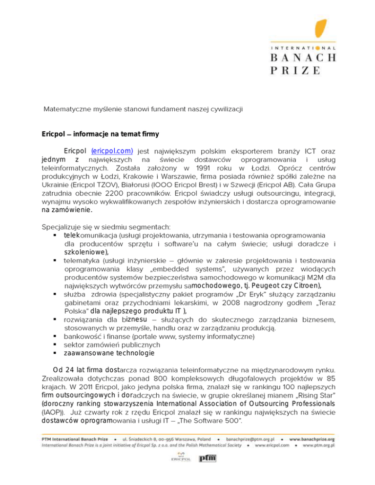 Ericpol informacje na temat firmy Ericpol (ericpol.com) jednym z na zamówienie. telek szkoleniowe), mochodowego, tj. Peugeot czy Citroen), dla najlepszego produktu IT ), iznesu zaawansowane technologie Od 24 lat firma dost firm outsourcingowych i dor (doroczny ranking stowarzyszenia International Association of Outsourcing Professionals dostawców oprogram W swoim portfolio firma posiada takich klientów, jak Ericsson, Orange (France Telecom), Telecom Italia Mobile, Telefonica, Polkomtel, T-Mobile (Deutsche Telekom), AT&T, Telmex, TeliaSonera, AIS, Saigon Postel, Sprint, PTC, Autoliv, Aepona, ACTIA, Amcor, EurotaxGlass, Cablex, Deante, Saint-Gobain, Solar, BORG Automotive, Bank BPH, Alior Bank, UBS, Samsung. Ericpol Science Ecosytem platformy kademickimi dydaktycznym studentów telekomunikacji, matematyki stosowanej oraz informatyki irmowych ekspertów oraz jako sponsor i teleinformatyki; w tym - - Ericpol Summer S organizowan . w dziedzinie matematyki. Wspólnie z Polskim Towar charakterze Czech, Estonii, Litwy . y, Polski dziedzinie nauk matematycznych. ji, Ukrainy si, ier, Norwegii, Szwecji i Finlandii. jednym z