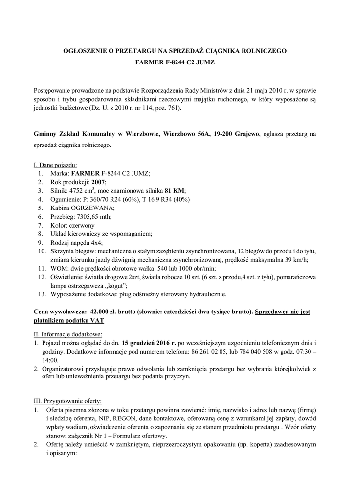 OGŁOSZENIE O PRZETARGU NA SPRZEDAŻ CIĄGNIKA ROLNICZEGO FARMER F-8244 C2 JUMZ Postępowanie prowadzone na podstawie Rozporządzenia Rady Ministrów z dnia 21 maja 2010 r. w sprawie sposobu i trybu gospodarowania składnikami rzeczowymi majątku ruchomego, w który wyposażone są jednostki budżetowe (Dz. U. z 2010 r. nr 114, poz. 761). Gminny Zakład Komunalny w Wierzbowie, Wierzbowo 56A, 19-200 Grajewo, ogłasza przetarg na sprzedaż ciągnika rolniczego. I. Dane pojazdu: 1. Marka: FARMER F-8244 C2 JUMZ; 2. Rok produkcji: 2007; 3. Silnik: 4752 cm3, moc znamionowa silnika 81 KM; 4. Ogumienie: P: 360/70 R24 (60%), T 16.9 R34 (40%) 5. Kabina OGRZEWANA; 6. Przebieg: 7305,65 mth; 7. Kolor: czerwony 8. Układ kierowniczy ze wspomaganiem; 9. Rodzaj napędu 4x4; 10. Skrzynia biegów: mechaniczna o stałym zazębieniu zsynchronizowana, 12 biegów do przodu i do tyłu, zmiana kierunku jazdy dźwignią mechaniczna zsynchronizowaną, prędkość maksymalna 39 km/h; 11. WOM: dwie prędkości obrotowe wałka 540 lub 1000 obr/min; 12. Oświetlenie: światła drogowe 2szt, światła robocze 10 szt. (6 szt. z przodu,4 szt. z tyłu), pomarańczowa lampa ostrzegawcza „kogut”; 13. Wyposażenie dodatkowe: pług odśnieżny sterowany hydraulicznie. Cena wywoławcza: 42.000 zł. brutto (słownie: czterdzieści dwa tysiące brutto). Sprzedawca nie jest płatnikiem podatku VAT II. Informacje dodatkowe: 1. Pojazd można oglądać do dn. 15 grudzień 2016 r. po wcześniejszym uzgodnieniu telefonicznym dnia i godziny. Dodatkowe informacje pod numerem telefonu: 86 261 02 05, lub 784 040 508 w godz. 07:30 – 14:00. 2. Organizatorowi przysługuje prawo odwołania lub zamknięcia przetargu bez wybrania którejkolwiek z ofert lub unieważnienia przetargu bez podania przyczyn. III. Przygotowanie oferty: 1. Oferta pisemna złożona w toku przetargu powinna zawierać: imię, nazwisko i adres lub nazwę (firmę) i siedzibę oferenta, NIP, REGON, dane kontaktowe, oferowaną cenę z warunkami jej zapłaty, dowód wpłaty wadium ,oświadczenie oferenta o zapoznaniu się ze stanem przedmiotu przetargu . Wzór oferty stanowi załącznik Nr 1 – Formularz ofertowy. 2. Ofertę należy umieścić w zamkniętym, nieprzezroczystym opakowaniu (np. koperta) zaadresowanym i opisanym: Nadawca: Nazwa/ adres Oferenta, Gminny Zakład Komunalny w Wierzbowie, Wierzbowo 56A, 19-200 Grajewo, „OFERTA NA ZAKUP CIĄGNIKA ROLNICZEGO FARMER ”. 3. 4. 5. Ofertę należy złożyć w Gminnym Zakładzie Komunalnym w Wierzbowie, Wierzbowo 56A, 19-200 Grajewo do dnia: 16 GRUDNIA 2016 r. do godz. 11:00. Otwarcie ofert nastąpi komisyjnie w dniu 16 GRUDNIA 2016 r. w siedzibie Gminnego Zakładu Komunalnego w Wierzbowie o godzinie 11:05. Kryterium: CENA. Wybrana zostanie oferta z najwyższą oferowaną ceną. 6. WADIUM 1. 2. 3. 4. 5. 6. 7. 8. 9. Oferta musi być zabezpieczona wadium w wysokości 840,00 zł. (słownie złotych: osiemset czterdzieści 00/100). Termin wniesienia wadium upływa dnia 16.12.2016 r. Wadium musi obejmować okres związania ofertą tj. 14 dni od ostatecznego terminu składania ofert. Wadium musi być wniesione: a) w pieniądzu – przelewem na rachunek bankowy Sprzedającego BS Szczuczyn o/Grajewo 15 8768 1013 1310 4737 2000 0040. Wniesione wadium w pieniądzu musi wpłynąć na konto Sprzedającego do terminu i godziny składania ofert. Wadium zostanie zwrócone w terminie do 14 dni. Zamawiający zatrzymuje wadium wraz z odsetkami, jeżeli Wykonawca, którego oferta została wybrana: a) odmówił podpisania umowy kupna - sprzedaży na warunkach określonych w ofercie. Oferenci związani są złożoną ofertą przez okres 14 dni, licząc od terminu wyznaczonego na składanie ofert. Nabywca jest zobowiązany zapłacić cenę nabycia w terminie wyznaczonym przez Sprzedającego, nie dłuższym niż 7 dni od dnia zawarcia umowy sprzedaży. Wydanie przedmiotu sprzedaży następuje niezwłocznie po zapłaceniu przez nabywcę ceny nabycia. IV. Oferta zostanie odrzucona jeżeli: 1. Została złożona po wyznaczonym terminie, w niewłaściwym miejscu. 2. W chwili otwarcia oferty, na rachunku bankowym Sprzedającego nie będzie znajdować się kwota wadium. 3. Nie zawiera poprawnych danych lub budzą inne wątpliwości. Organizator przetargu powiadomi oferenta niezwłocznie o odrzuceniu oferty. Wierzbowo, dn. 2 grudnia 2016 r. Dyrektor Gminnego Zakładu Komunalnego w Wierzbowie Łukasz Ajdyn Załącznik Nr 1 OFERTA NA ZAKUP W odpowiedzi na ogłoszenie o przetargu na sprzedaż ciągnika rolniczego FARMER F-8244 C2 JUMZ z dnia 02.12.2016 r. składam ofertę na zakup w/w pojazdu. Imię i nazwisko/ nazwa kupującego Adres/siedziba kupującego NIP REGON Telefon E-mail Oferuję cenę brutto: .................................................................................. zł., (słownie złotych: ..............................................................................................................................................) Oświadczam, iż zapoznałem się ze stanem technicznym sprzedawanego pojazdu. Oświadczam, że akceptuję warunki zawarte w ogłoszeniu o przetargu. Załączniki do oferty: 1. Dowód wpłaty wadium ..................................................................... (data i podpis)