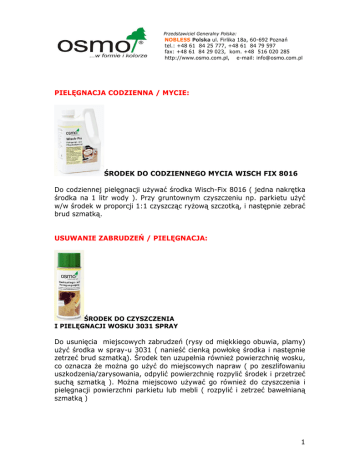 Przedstawiciel Generalny Polska: NOBLESS Polska ul. Firlika 18a, 60-692 Poznań tel.: +48 61 84 25 777, +48 61 84 79 597 fax: +48 61 84 29 023, kom. +48 516 020 285 http://www.osmo.com.pl, e-mail: [email protected] PIELĘGNACJA CODZIENNA / MYCIE: ŚRODEK DO CODZIENNEGO MYCIA WISCH FIX 8016 Do codziennej pielęgnacji uŜywać środka Wisch-Fix 8016 ( jedna nakrętka środka na 1 litr wody ). Przy gruntownym czyszczeniu np. parkietu uŜyć w/w środek w proporcji 1:1 czyszcząc ryŜową szczotką, i następnie zebrać brud szmatką. USUWANIE ZABRUDZEŃ / PIELĘGNACJA: ŚRODEK DO CZYSZCZENIA I PIELĘGNACJI WOSKU 3031 SPRAY Do usunięcia miejscowych zabrudzeń (rysy od miękkiego obuwia, plamy) uŜyć środka w spray-u 3031 ( nanieść cienką powłokę środka i następnie zetrzeć brud szmatką). Środek ten uzupełnia równieŜ powierzchnię wosku, co oznacza Ŝe moŜna go uŜyć do miejscowych napraw ( po zeszlifowaniu uszkodzenia/zarysowania, odpylić powierzchnię rozpylić środek i przetrzeć suchą szmatką ). MoŜna miejscowo uŜywać go równieŜ do czyszczenia i pielęgnacji powierzchni parkietu lub mebli ( rozpylić i zetrzeć bawełnianą szmatką ) 1 Przedstawiciel Generalny Polska: NOBLESS Polska ul. Firlika 18a, 60-692 Poznań tel.: +48 61 84 25 777, +48 61 84 79 597 fax: +48 61 84 29 023, kom. +48 516 020 285 http://www.osmo.com.pl, e-mail: [email protected] RENOWACJA I CZYSZCZENIE POWIERZCHNI OSMO: ŚRODEK DO RENOWACJI I CZYSZCZENIA ( 3029 lub 3087 ) Do odnowy uszkodzonych powierzchni parkietu uŜyć Środka do Renowacji i Czyszczenia Wosku (Wachpflege 3029 lub 3087 Wachpflege Biały). I FUNKCJA RENOWACJI: Na czystą i suchą powierzchnię powłok Osmo (np. parkietu) rozprowadzić cienką powłokę w/w Środka do Renowacji i Czyszczenia Wosku ( mop mikrowłókno, szmatka bawełniana ). Czynność tę naleŜy wykonywać tak aby uniknąć zadeptania naniesionej powłoki. Po upływie 30 minut powierzchnia jest gotowa do uŜytkowania. W celu uzyskania połysku naleŜy ją zapolerować po wyschnięciu (biały ped, szmatka bawełniana). WaŜne jest aby pielęgnację tym środkiem wykonywać na intensywnie uŜywanych powierzchniach gdzie powłoka twardego wosku ulega uszkodzeniom. W normalnym domowym uŜytku tę czynność wykonuje się 1-4 razy w roku. W uŜytku publicznym ( restauracje, sale taneczne ) konieczne jest nanoszenie w/w środka minimum 1-raz w tygodniu. II FUNKCJA USUWANIA TRUDNYCH PLAM: Środkiem tym moŜna równieŜ usunąć tzw. “trudne plamy”. NaleŜy na plamę nanieść niewielką ilość środka, pozostawić na kilka minut i zebrać zmiękczony brud bawełnianą szmatką. 2 Przedstawiciel Generalny Polska: NOBLESS Polska ul. Firlika 18a, 60-692 Poznań tel.: +48 61 84 25 777, +48 61 84 79 597 fax: +48 61 84 29 023, kom. +48 516 020 285 http://www.osmo.com.pl, e-mail: [email protected] NARZĘDZIA DO PIELĘGNACJI: OSMO OPTI ZESTAW MOP nr. 118 OPTI ZESTAW MOP ZAWIERA: ( uchwyt teleskopowy, nakłada do wycierania kurzu, nakładka do mycia, nakładka do aplikacji środka renowacyjnego. Wszystkie nakładki wykonane są w technologii mikrowłókien ) MOP NAKŁADKA DO KURZU nr 119 MOP NAKŁADKA DO ZMYWANIA nr 120 MOP NAKŁADKA Z AKTYWNEGO WŁÓKNA nr 121 3 Przedstawiciel Generalny Polska: NOBLESS Polska ul. Firlika 18a, 60-692 Poznań tel.: +48 61 84 25 777, +48 61 84 79 597 fax: +48 61 84 29 023, kom. +48 516 020 285 http://www.osmo.com.pl, e-mail: [email protected] OSMO MASZYNA POLERSKA nr OS 20 na prąd OSMO MASZYNA POLERSKA nr AK 20 na akumulator OSMO CHUSTKI DO MASZYNY POLERSKIEJ nr 8020 CHUSTKI PIELĘGNACYJNE DO PARKIETÓW nr 8019 OSMO CHUSTKI DO CZYSZCZENIA RĄK nr 8018 4 Przedstawiciel Generalny Polska: NOBLESS Polska ul. Firlika 18a, 60-692 Poznań tel.: +48 61 84 25 777, +48 61 84 79 597 fax: +48 61 84 29 023, kom. +48 516 020 285 http://www.osmo.com.pl, e-mail: [email protected] 5