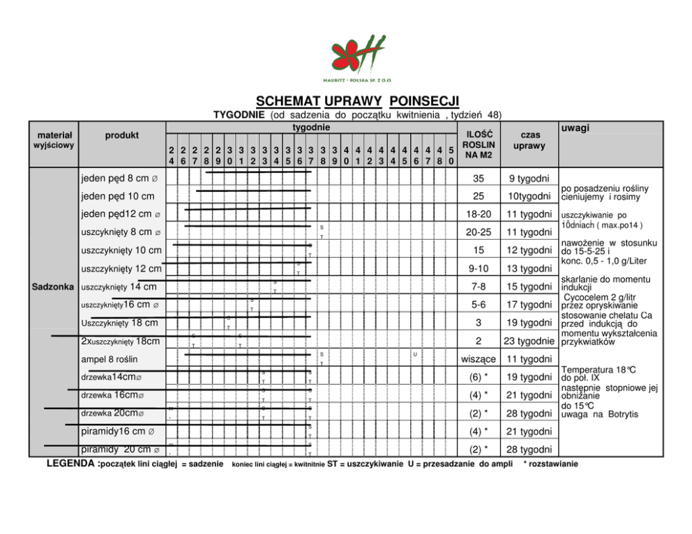 SCHEMAT UPRAWY POINSECJI TYGODNIE (od sadzenia do początku kwitnienia , tydzień 48) materiał produkt wyjściowy tygodnie ILOŚĆ ROSLIN 2 2 2 2 2 3 3 3 3 3 3 3 3 3 3 4 4 4 4 4 4 4 4 4 5 NA M2 4 6 7 8 9 0 1 2 3 4 5 6 7 8 9 0 1 2 3 4 5 6 7 8 0 czas uprawy jeden pęd 8 cm Ø 35 9 tygodni jeden pęd 10 cm 25 10tygodni jeden pęd12 cm ø S uszcyknięty 8 cm ø T S uszczyknięty 10 cm S uszczyknięty 12 cm T S Sadzonka uszczyknięty 14 cm uszczyknięty16 Uszczyknięty T S cm ø T S 18 cm T 2xuszczyknięty 18cm S S T T S ampel 8 roślin T drzewka14cmø S S T T drzewka 16cmø S S T T 20 S S ° T T drzewka 20cmø S piramidy16 cm Ø T 20 piramidy 20 cm ø ° LEGENDA :początek lini ciągłej = sadzenie S T koniec lini ciągłej = kwitnitnie U po posadzeniu rośliny cieniujemy i rosimy 18-20 11 tygodni uszczykiwanie po 20-25 11 tygodni 15 T uwagi 10dniach 10dniach ( max.po14 ) nawoŜenie w stosunku 12 tygodni do 15-5-25 i konc. 0,5 - 1,0 g/Liter 9-10 13 tygodni 7-8 15 tygodni indukcji 5-6 17 tygodni przez opryskiwanie 3 19 tygodni przed indukcją do 2 23 tygodnie przykwiatków wiszące skarlanie do momentu Cycocelem 2 g/litr stosowanie chelatu Ca momentu wykształcenia 11 tygodni Temperatura 18°C (6) * 19 tygodni do poł. IX (4) * 21 tygodni obniŜanie (2) * 28 tygodni uwaga na Botrytis (4) * 21 tygodni (2) * 28 tygodni następnie stopniowe jej do 15°C ST = uszczykiwanie U = przesadzanie do ampli * rozstawianie