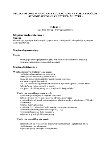 SZCZEGÓŁOWE WYMAGANIA EDUKACYJNE NA POSZCZEGÓLNE STOPNIE SZKOLNE ZE SZTUKI ( MUZYKI ) Klasa I (zgodne z nową podstawą programową) Stopień niedostateczny : Uczeń: nie realizuje wymagań koniecznych – jego wiedza i umiejętności nie spełniają wymogów oceny pozytywnej Stopień dopuszczający: Uczeń: - realizuje podstawę programową przy pomocy nauczyciela (treści podstawy programowej zamieszczone zostały poniżej) Stopień dostateczny : W zakresie muzyki średniowiecza uczeń: - odróżni dzieła romańskie od gotyckich; - określi przedział czasowy średniowiecza - poda, jak nazywali się średniowieczni rycerze śpiewacy; - zna tematykę pieśni świeckich; - wie , jak zachować się podczas słuchania lub wykonania pieśni „Gaude, Mater Polonia” oraz zaśpiewa pieśń w grupie; - wie, przed jaką bitwą polscy rycerze śpiewali „Bogurodzicę” W zakresie muzyki renesansu uczeń: - wymieni najważniejszych artystów renesansu; - potrafi odróżnić śpiew jednogłosowy od wielogłosowego; - wymieni kraje w których najbujniej rozwijała się muzyka wielogłosowa ( Włochy, Niderlandy); - rozumie budowę kanonu; - wymieni ( 2 –3) władców Polski panujących w epoce renesansu; - wymieni instrumenty popularne w epoce ( 2-3); - rozpoznaje brzmienie lutni i organów - zaśpiewa w grupie pieśń renesansową ; W zakresie muzyki baroku uczeń: - odróżni barok od renesansu na podstawie wysłuchanych i oglądanych dzieł; odróżni organy od klawesynu; kojarzy polifonię z muzyką wielogłosową; - wie, jaką formą jest opera ora w jakim kraju powstały pierwsze dzieła operowe; zna przynajmniej jednego przedstawiciela muzyki polskiego baroku; wymieni nazwy polskich tańców narodowych ( polonez, mazur); wie, na czym polegają przedstawienia jasełkowe oraz śpiewa w grupie kolędy; wie, kim był Antonio Vivaldi i poda tytuł jego dzieła ( Cztery pory roku); zna nazwiska głównych przedstawicieli muzyki baroku oraz ich podstawowe dzieła ( Haendel, Bach ) zaśpiewa piosenkę „Hej sokoły w grupie”; W zakresie muzyki klasycznej uczeń: - wymieni cechy baroku i klasycyzmu , - zna niektóre nazwy form o budowie cyklicznej, - rozpoznaje główne tematy z dzieł największych kompozytorów klasycyzmu, - zna podstawowe fakty z życia kompozytorów klasycyzmu, - śpiewa pieśni w zespole klasowym, - zna tekst i melodię Ody do radości, - wymieni pieśni polskie powstałe w oświeceniu ( część z wymaganych). - zaśpiewa hymn państwowy w zespole klasowym, - wymieni tytuły niektórych dzieł operowych ( polskich), - rozpozna tańce narodowe i tańce kurpiowskie ( przynajmniej dwa), rozpozna rytm poloneza, - umieści klasycyzm na osi czasu. W zakresie muzyki romantycznej uczeń: - umieści romantyzm na osi czasu, - zna cechy ogólne muzyki romantyzmu i główne jej formy, - zna nazwiska czołowych kompozytorów romantyzmu, - śpiewa pieśni romantyczne w grupie, - rozpoznaje główne tematy z dzieł największych kompozytorów romantyzmu, - wie kogo nazywamy wirtuozem, - wie na jakim instrumencie grał i komponował F. Chopin oraz poda 2 –3 przykłady jego dzieł, - wie , czym zajmował się O. Kolberg, - zna tematykę polskich i kurpiowskich pieśni ludowych, - śpiewa w grupie piosenki ludowe – kurpiowskie, odróżni muzykę artystyczną od ludowej, Inne umiejętności (realizuje w 50%): - odczytuje i stosuje w praktyce podstawowe sposoby zapisu muzyki, czyta z błędami zapis nutowy; zapisuje z błędami nuty i inne znaki muzyczne; korzysta z programów komputerowych służących do nagrywania i przetwarzania dźwięku – częściowo, - częściowo wykorzystuje Internet, - określa funkcje społeczne muzyki (ludowa i profesjonalna, religijna i świecka, poważna i rozrywkowa, użytkowa), elementy dzieła muzycznego : rytm, melodia, harmonia, dynamika, agogika, artykulacja, barwa dźwięku, budowa- forma: motyw, fraza, zdanie, okres, utwory jedno i wieloczęściowe, rondo, suita, wariacje, fuga, koncert, sonata, symfonia, opera, oratorium i dramat muzyczny, wykonanie; aparat wykonawczy: muzyka wokalna, muzyka instrumentalna, wokalno-instrumentalna; muzyka programowa i absolutna, muzyka ilustracyjna; środki techniki kompozytorskiej: monodia, polifonia i homofonia, imitacja kanon, pentatonika, skale modalne i kościelne, system dur-mol, dodekafonia i aleatoryzm – Stopień dobry: W zakresie muzyki średniowiecza uczeń ( to, co na stopień dostateczny +) : - wyjaśni nazwę chorału gregoriańskiego oraz poda jego cechy; - zna formy muzyczne średniowiecza - wymieni cechy sztuki romańskiej i gotyckiej oraz poda przedziały czasowe, w których kształtowały się oba style; - wyjaśni znaczenie kultury rycerskiej dla rozwoju muzyki świeckiej; - zna tytuły najważniejszych pieśni polskich ; - zna treść pieśni „Gaude, Mater...” i okoliczności jej powstania.\ - śpiewa solo lub w grupie pieśni : „Gaude, Mater ...” , „Bogurodzica”; - zrealizuje na bębenku rytm „Prowansalskiej pieśni miłosnej”; W zakresie muzyki renesansu uczeń ( to, co na stopień dostateczny +): - potrafi odróżnić utwór pochodzący ze średniowiecza od utworu renesansowego; - poda ramy czasowe epoki; - wskaże różnice między sztuką średniowiecza a renesansu; - wyjaśni znaczenie słowa polifonia ; - poda nazwiska włoskich lutników; - wymieni władców Polski panujących w epoce renesansu oraz wyjaśni, dlaczego ten okres w historii Polski nazywamy Złotym wiekiem; - wymieni nazwiska najwybitniejszych poetów i muzyków oraz ich dzieła muzyczne; - wymieni instrumenty popularne w epoce oraz rozpozna ich brzmienia; - zna formy muzyczne renesansu - wymieni nazwy tańców renesansowych; - wyjaśni znaczenie określenia : tabulatura; - wykona w małym zespole poznane pieśni renesansowe; - śpiewa w kanonie z nauczycielem lub z innymi uczniami; W zakresie muzyki baroku uczeń ( to, co na stopień dostateczny+): - umiejscowi epokę w dziejach – poda ramy czaso