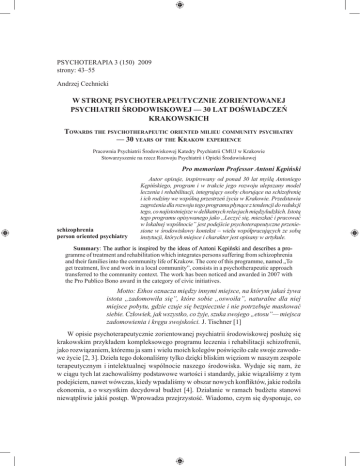 Psychoterapia 3 (150) 2009 strony: 43–55 Andrzej Cechnicki W stronę psychoterapeutycznie zorientowanej psychiatrii środowiskowej — 30 lat doświadczeń krakowskich Towards the psychotherapeutic oriented milieu community psychiatry — 30 years of the Krakow experience Pracownia Psychiatrii Środowiskowej Katedry Psychiatrii CMUJ w Krakowie Stowarzyszenie na rzecz Rozwoju Psychiatrii i Opieki Środowiskowej Pro memoriam Professor Antoni Kępiński schizophrenia person oriented psychiatry Autor opisuje, inspirowany od ponad 30 lat myślą Antoniego Kępińskiego, program i w trakcie jego rozwoju ulepszany model leczenia i rehabilitacji, integrujący osoby chorujące na schizofrenię i ich rodziny we wspólną przestrzeń życia w Krakowie. Przedstawia zagrożenia dla rozwoju tego programu płynące z tendencji do redukcji tego, co najistotniejsze w delikatnych relacjach międzyludzkich. Istotą tego programu opisywanego jako „Leczyć się, mieszkać i pracować w lokalnej wspólnocie” jest podejście psychoterapeutyczne przeniesione w środowiskowy kontekst – wielu współpracujących ze sobą instytucji, których miejsce i charakter jest opisany w artykule. Summary: ��������������������������������������������������������������������������� The author is inspired by the ideas of Antoni Kępiński and describes a programme of treatment and rehabilitation which integrates persons suffering from schizophrenia and their families into the community life of Krakow. The core of this programme, named „To get treatment, live and work in a local community”, consists in a psychotherapeutic approach transferred to the community context. The work has been noticed and awarded in 2007 with the Pro Publico Bono award in the category of civic initiatives. Motto: Ethos oznacza między innymi miejsce, na którym jakaś żywa istota „zadomowiła się”, które sobie „oswoiła”, naturalne dla niej miejsce pobytu, gdzie czuje się bezpiecznie i nie potrzebuje maskować siebie. Człowiek, jak wszystko, co żyje, szuka swojego „etosu”— miejsca zadomowienia i kręgu swojskości. J. Tischner [1] W opisie psychoterapeutycznie zorientowanej psychiatrii środowiskowej posłużę się krakowskim przykładem kompleksowego programu leczenia i rehabilitacji schizofrenii, jako rozwiązaniem, któremu ja sam i wielu moich kolegów poświęciło całe swoje zawodowe życie [2, 3]. Dzieła tego dokonaliśmy tylko dzięki bliskim więziom w naszym zespole terapeutycznym i intelektualnej wspólnocie naszego środowiska. Wydaje się nam, że w ciągu tych lat zachowaliśmy podstawowe wartości i standardy, jakie wiązaliśmy z tym podejściem, nawet wówczas, kiedy wpadaliśmy w obszar nowych konfliktów, jakie rodziła ekonomia, a o wszystkim decydował budżet [4]. Działanie w ramach budżetu stanowi niewątpliwie jakiś postęp. Wprowadza przejrzystość. Wiadomo, czym się dysponuje, co 44 Andrzej Cechnicki można planować i czym gospodarować. Wszyscy zmieniliśmy się w ekonomistów. To nie jest błąd, że staliśmy się realistami, przestaliśmy marzyć i narzekać. Budżet ma tylko jedną wadę: z roku na rok jest mniejszy! Jak się do tego odnieść? Debaty na ten temat prowadzą, chcąc nie chcąc, do centralnego pytania o to, co niezbędne. Skoro z roku na rok mamy coraz mniej środków, to co jest jeszcze absolutnie niezbędne? Pragmatycznie problem ten rozwiązujemy następująco: zatrudnić lekarza czy psychologa? Oczywiście lekarza, ponieważ lekarz może też pracować na dyżurach. Zatrudnić pielęgniarkę czy ergoterapeutę? Oczywiście pielęgniarkę, ponieważ zapewnienie dobrej opieki ma bez wątpienia pierwszeństwo przed terapią zajęciową, itd., itd. Kontynuując ten proces znów możemy wylądować przy dwóch grupach zawodowych, które zawsze były nieodzowne, a mianowicie — lekarzy i personelu pielęgniarskiego. To, co niezbędne, okaże się w końcu podejściem medycznym. My, wywodząc się z tradycji ukształtowanej przez Antoniego Kępińskiego, na pytanie o to, co niezbędne, odwołujemy się do samej istoty, do specyfiki psychiatrii, czyli podejścia medyczno-społecznego. Wówczas — jako to, co niezbędne — musimy rozważać: • rozwijanie relacji z pacjentem i rodziną; • wrażliwość w postrzeganiu i reflektowaniu; • budowanie poczucia bezpieczeństwa, zaufania i pewności; • ostrożne odkrywanie związków pomiędzy chorobą a biografią; • staranne odnajdywanie i przygotowywanie indywidualnej drogi powrotu z choroby do życia; • a to wszystko w środowisku, dającym czas i przestrzeń na zmiany, których człowiek nie może dokonać w ciągu trzech miesięcy. Ten zagrożony redukcją „dodatek” z dala od biologicznego jądra naszego fachu, jest więc właściwie tym, co niezbędne. Z pewnością nadszedł czas, aby na nowo uprzytomnić sobie wartości i normy naszego zawodu. Chodziłoby więc dzisiaj o krytyczną ocenę i przeciwstawianie się tendencjom do: • redukcji kompleksowości teorii i praktyki psychiatrycznej i skupianiu się na tym, co biologiczne; • forsowania zasady skuteczności, sprzyjającej redukcji do tego, co mierzalne; • kształtowania atmosfery pośpiechu zagrażającej kulturze leczenia psychiatrycznego; • ograniczania działalności klinik psychiatrycznych i szpitali do tego, co uleczalne i obiecuje powodzenie, co zwalnia z odpowiedzialności za pacjenta. O psychoterapeutycznie zorientowanej krakowskiej psychiatrii środowiskowej Kiedy myślimy o korzeniach psychoterapeutycznie zorientowanej psychiatrii środowiskowej, wracamy do intelektualnej i duchowej spuścizny Antoniego Kępińskiego [5, 6]. Kępiński, podobnie jak Manfred Bleuler [7], opowiada się za tą tradycją, która w myśleniu o schizofrenii podkreśla to, co wspólne, a nie to, co specyficzn