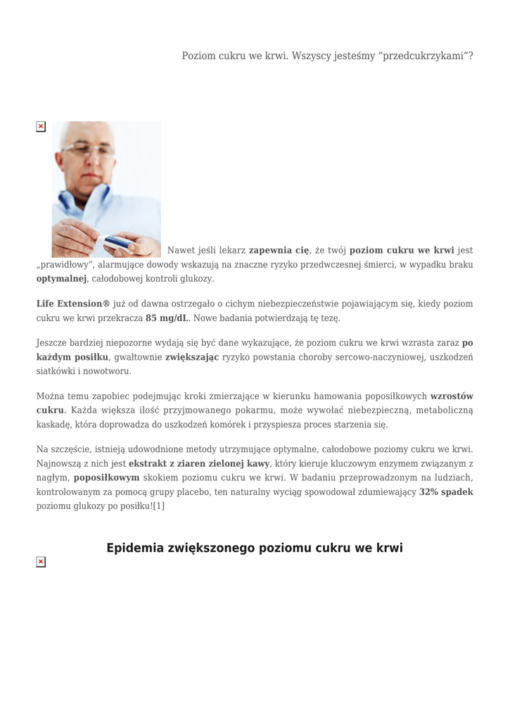 Poziom cukru we krwi. Wszyscy jesteśmy “przedcukrzykami”? Nawet jeśli lekarz zapewnia cię, że twój poziom cukru we krwi jest „prawidłowy”, alarmujące dowody wskazują na znaczne ryzyko przedwczesnej śmierci, w wypadku braku optymalnej, całodobowej kontroli glukozy. Life Extension® już od dawna ostrzegało o cichym niebezpieczeństwie pojawiającym się, kiedy poziom cukru we krwi przekracza 85 mg/dL. Nowe badania potwierdzają tę tezę. Jeszcze bardziej niepozorne wydają się być dane wykazujące, że poziom cukru we krwi wzrasta zaraz po każdym posiłku, gwałtownie zwiększając ryzyko powstania choroby sercowo-naczyniowej, uszkodzeń siatkówki i nowotworu. Można temu zapobiec podejmując kroki zmierzające w kierunku hamowania poposiłkowych wzrostów cukru. Każda większa ilość przyjmowanego pokarmu, może wywołać niebezpieczną, metaboliczną kaskadę, która doprowadza do uszkodzeń komórek i przyspiesza proces starzenia się. Na szczęście, istnieją udowodnione metody utrzymujące optymalne, całodobowe poziomy cukru we krwi. Najnowszą z nich jest ekstrakt z ziaren zielonej kawy, który kieruje kluczowym enzymem związanym z nagłym, poposiłkowym skokiem poziomu cukru we krwi. W badaniu przeprowadzonym na ludziach, kontrolowanym za pomocą grupy placebo, ten naturalny wyciąg spowodował zdumiewający 32% spadek poziomu glukozy po posiłku![1] Epidemia zwiększonego poziomu cukru we krwi Poziom cukru we krwi. Wszyscy jesteśmy “przedcukrzykami”? Odsetek osób, które cierpią na przewlekle wysoki poziom cukru we krwi jest zdumiewający! Pewne badanie obejmujące 46 000 osób w średnim wieku wykazało, że u ponad 80% z nich, mierzony na czczo poziom cukru we krwi wyniósł 85 mg/dL lub więcej.[2] Inna próba badająca 11 000 osób w średnim i podeszłym wieku wykazała, że u ponad 85% z nich, mierzony na czczo poziom cukru we krwi wyniósł 85 mg/dL lub więcej.[3] U coraz obszerniejszej grupy pacjentów obserwuje się podniesione ponad te wartości poziomy cukru we krwi (badane na czczo), co oznacza, że obecnie ogromna większość starzejących się ludzi cierpi na przewlekłe uszkodzenia komórek. Ta epidemia będzie przyspieszać powstawanie chorób związanych z wiekiem do momentu kiedy lekarze zrozumieją, że ich testy oceniające wartości cukru we krwi jako „prawidłowe” są niedoskonałe. Fatalne błędy klasycznej medycyny Istnieją dwa główne problemy w sposobie spojrzenia na poziom cukru we krwi przez medycynę ogólną. Po pierwsze, ustalony jako „prawidłowy” poziom mierzonego na czczo cukru we krwi nadal jest zbyt wysoki. Aktualne kryteria uznają, że osoby z poziomem mierzonym na czczo mniejszym od 125 mg/dL, Poziom cukru we krwi. Wszyscy jesteśmy “przedcukrzykami”? nie są „diabetykami”. Wartości między 100 a 125 mg/dL są przypisywane stanowi „przedcukrzycowemu”.[4] Innymi słowy, lekarz odczytując twoje wyniki – 99 mg/dL – zapewni cię, że wszystko jest w porządku i wyśle cię do domu, nieświadomego niebezpieczeństwa czającego w twoim organizmie. Dla przypomnienia – optymalna kontrola glukozy występuje kiedy jej stężenie mierzone na czczo mieści się w granicach 70 a 85 mg/dL. Oznacza to, że poziomy, które obecnie lekarze uznają za „prawidłowe” w rzeczywistości są niebezpiecznie podniesione. Po drugie, lekarze nie mówią swoim pacjentom o ryzyku występowania poposiłkowych (poobiednich) skoków cukru we krwi, które uszkadzają delikatne naczynia krwionośne w twoim mózgu, sercu, nerkach i oczach, jak i również przyśpieszają starzenie się komórek i tkanek. Wykorzystywanie tylko mierzonych na czczo odczytów poziomu glukozy we krwi nie wykrywa niebezpiecznych poposiłkowych skoków, które zwiększają ryzyko śmierci.[5] Gorzką prawdą jest fakt, że standardowe definicje odnoszące się do cukrzycy są niebezpiecznie przedawnione. Badania naukowe wykazują, że poposiłkowe skoki cukru są potencjalnie bardziej szkodliwe niż jej podniesione poziomy mierzone na czczo.[6] Na przykład, u osób z „prawidłowym” poziomem i „prawidłowym” wynikiem testu tolerancji glukozy, ryzyko zawału serca wzrasta o 58% dla każdych 21 mg/dL w poposiłkowym poziomie cukru we krwi.[7] Ryzyko śmierci w wyniku choroby sercowonaczyniowej zwiększa się wówczas o 26%.[8] Kontrola poposiłkowego poziomu glukozy powinna być postrzegana jako decydujący czynnik redukowania komplikacji sercowo-naczyniowych.[9] To, z czego lekarze nie zdają sobie sprawy to fakt, że same odczyty mierzonych na czczo poziomów glukozy nie dostarczają informacji o jej całodobowej kontroli. A zatem, kiedy pacjent otrzyma wynik mierzonej na czczo glukozy np. 95 mg/dL, może to być sztucznie niska wartość, nie dająca rzeczywistego obrazu całodobowego stężenia glukozy, które może być znacznie wyższe. Na przykład, pacjent z wynikiem 95 mg/dL mierzonym na czczo może przez większość dnia mieć znacznie wyższy odczyt – ponad 150 mg/dL, ponieważ jego starzejący się organizm jest niezdolny do neutralizowania dodatkowych kalorii. Brak kontroli nad poobiednimi i mierzonymi na czczo skokami poziomu glukozy, to przygotowanie gruntu dla przyśpieszonego procesu starzenia się i serii chorób zwyrodnieniowych. Dlaczego mamy predyspozycję do podniesionych poziomów glukozy Poziom cukru we krwi. Wszyscy jesteśmy “przedcukrzykami”? Komórki mózgowe nie są w stanie długo funkcjonować bez odpowiedniego stanu glukozy i dlatego jeśli kiedykolwiek poziom cukru we krwi spadnie zbyt nisko szybko następuje śmierć. By ochronić się od nagłej śmierci w wyniku stanu bliskiego zagłodzeniu, jaka spotykała naszych przodków, organizm rozwinął rekompensacyjne mechanizmy, nie pozwalające na zbyt niski spadek poziomu glukozy. Problem jednak w tym, że te ochronne mechanizmy są obecnie odpowiedzialne za większość niebezpiecznie podniesionych poziomów cukru we krwi u starzeją