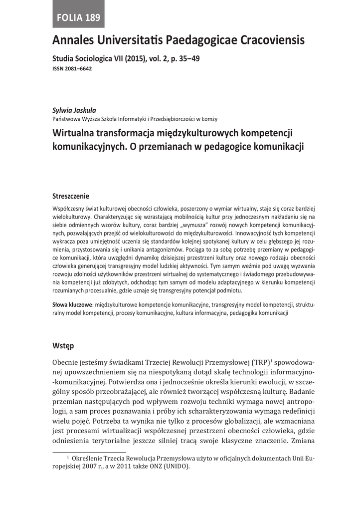 Folia 189 Annales Universitatis Paedagogicae Cracoviensis Studia Sociologica VII (2015), vol. 2, p. 35–49 ISSN 2081–6642 Sylwia Jaskuła Państwowa Wyższa Szkoła Informatyki i Przedsiębiorczości w Łomży Wirtualna transformacja międzykulturowych kompetencji... komunikacyjnych. O przemianach w pedagogice komunikacji Streszczenie Współczesny świat kulturowej obecności człowieka, poszerzony o wymiar wirtualny, staje się coraz bardziej wielokulturowy. Charakteryzując się wzrastającą mobilnością kultur przy jednoczesnym nakładaniu się na siebie odmiennych wzorów kultury, coraz bardziej „wymusza” rozwój nowych kompetencji komunikacyjnych, pozwalających przejść od wielokulturowości do międzykulturowości. Innowacyjność tych kompetencji wykracza poza umiejętność uczenia się standardów kolejnej spotykanej kultury w celu głębszego jej rozumienia, przystosowania się i unikania antagonizmów. Pociąga to za sobą potrzebę przemiany w pedagogice komunikacji, która uwzględni dynamikę dzisiejszej przestrzeni kultury oraz nowego rodzaju obecności człowieka generującej transgresyjny model ludzkiej aktywności. Tym samym weźmie pod uwagę wyzwania rozwoju zdolności użytkowników przestrzeni wirtualnej do systematycznego i świadomego przebudowywania kompetencji już zdobytych, odchodząc tym samym od modelu adaptacyjnego w kierunku kompetencji rozumianych procesualnie, gdzie uznaje się transgresyjny potencjał podmiotu. Słowa kluczowe: międzykulturowe kompetencje komunikacyjne, transgresyjny model kompetencji, strukturalny model kompetencji, procesy komunikacyjne, kultura informacyjna, pedagogika komunikacji Wstęp Obecnie jesteśmy świadkami Trzeciej Rewolucji Przemysłowej (TRP)1 spowodowanej upowszechnieniem się na niespotykaną dotąd skalę technologii informacyjno-komunikacyjnej. Potwierdza ona i jednocześnie określa kierunki ewolucji, w szczególny sposób przeobrażającej, ale również tworzącej współczesną kulturę. Badanie przemian następujących pod wpływem rozwoju techniki wymaga nowej antropologii, a sam proces poznawania i próby ich scharakteryzowania wymaga redefinicji wielu pojęć. Potrzeba ta wynika nie tylko z procesów globalizacji, ale wzmacniana jest procesami wirtualizacji współczesnej przestrzeni obecności człowieka, gdzie odniesienia terytorialne jeszcze silniej tracą swoje klasyczne znaczenie. Zmiana Określenie Trzecia Rewolucja Przemysłowa użyto w oficjalnych dokumentach Unii Europejskiej 2007 r., a w 2011 także ONZ (UNIDO). 1 [36] Sylwia Jaskuła istoty pojęć miejsca, odległości czy granic w przestrzeni wirtualnej w stosunku do realnej, implikuje potrzebę modyfikacji przede wszystkim tych określeń, które w swojej istocie odwołują się do konwencjonalnych parametrów fizycznych. Współczesna kultura coraz szerzej przepływa w sieciach i z pewnością jest bardziej ulotna i mniej „fizyczna” niż ta w „Galaktyce Gutenberga”. Pozostawia ona po sobie ślady, które mają charakter bardziej symboliczny niż materialny. Jej powstawanie jest efektem działania społecznego i interakcji zachodzących pomiędzy użytkownikami przestrzeni wirtualnej, wyrażających się różnymi formami rozszerzającej się komunikacji. O tym, że nowe technologie poszerzają sferę działania komunikacyjnego pisał Jürgen Habermas (1999, 2002) w czasach, kiedy Internetu w dzisiejszym rozumieniu jeszcze nie było. Według niego naturalna skłonność człowieka do wzajemności, znalazła swoje odzwierciedlenie również w kulturze kształtowanej w przestrzeni wirtualnej. Twórca teorii działania komunikacyjnego tę nową wspólnotę komunikacyjną określa jako postać inteligencji kolektywnej, której intersubiektywność prowadzi do wzajemnego porozumienia bez przymusu. Z drugiej strony społeczeństwo korzystające z technologii wcale nie musi mieć charakteru sztucznie ujednoliconego, szczególnie w warunkach odmienności kulturowych. Współczesną przestrzeń obecności człowieka poszerzoną o wymiar wirtualny charakteryzuje wielokulturowość. Nakładanie się na siebie odmiennych wzorów kultury, systemów wartości i wzrastająca mobilność kultur wymusza rozwój nowych kompetencji. Ich innowacyjność wykracza poza umiejętność uczenia się standardów kolejnej spotykanej przez nas kultury w celu głębszego jej rozumienia, przystosowania się i unikania konfliktów. Dzisiejsza przestrzeń obecności człowieka generuje transgresyjny model ludzkiej aktywności, charakteryzujący się zdolnością do systematycznego i świadomego przebudowywania kompetencji już zdobytych, odchodząc tym samym od modelu adaptacyjnego w kierunku kompetencji rozumianych procesualnie, gdzie uznaje się transgresyjny potencjał podmiotu. Nie tylko kryzys zbyt statycznie i przystosowawczo zorientowanych teorii kompetencji międzykulturowych, ale nade wszystko wyzwania coraz bardziej współzależnych, powiązanych i przenikających się procesów oraz rzeczywistości społecznych stał się przyczyną koniecznego zwrotu w rozumieniu istoty problemu. Stąd też przejście, jakie odnotowujemy w koncepcji i praktyce pedagogicznej wielu instytucji edukacji i kultury, od koncepcji wielokulturowości do perspektywy międzykulturowej, nie jest ani lekceważeniem każdej z zaangażowanych kultur, ani też teorią destrukcyjnej pustki jaka charakteryzować ma hybrydalny obszar „między” konwencjonalnymi i ustabilizowanymi systemami wartości, treści i identyfikacji. Rodzi to potrzebę nowego spojrzenia na pedagogikę komunikacji, która uwzględniać będzie dynamikę potrzeb dzisiejszego człowieka. Niestatyczny model działania człowieka, który generowany jest głównie poprzez jego obecność w dwubiegunowym świecie łączącym wymiary realne i wirtualne, wymaga edukacji do nowych kompetencji komunikacyjnych, coraz częściej międzykulturowych, a nie tylko wielokulturowych, które przenoszą się także w świa
