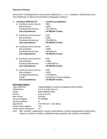 Szanowni Państwo, Komunalne Przedsiębiorstwo Komunikacji Miejskiej Sp. z o.o. z siedzibą w Białymstoku przy ulicy Składowej 11 oferuje do sprzedaży następujące autobusy: 1. Autobusy MAN NG 272 1) Autobusy numer boczny: Rok produkcji: Przebieg kilometrowy: Cena wywoławcza – autobusy przegubowe – 869; – 1991; – 761 000 km; – 45 000,00 zł netto; 2) Autobusy numer boczny: Rok produkcji: Przebieg kilometrowy: Cena wywoławcza – 870; – 1991; – 766 000 km; – 45 000,00 zł netto; 3) Autobusy numer boczny: Rok produkcji: Przebieg kilometrowy: Cena wywoławcza – 874; – 1989; – 995 000 km; – 40 000,00 zł netto; 4) Autobusy numer boczny: Rok produkcji: Przebieg kilometrowy: Cena wywoławcza – 875; – 1989; – 1 000 000 km; – 40 000,00 zł netto; 5) Autobusy numer boczny: Rok produkcji: Przebieg kilometrowy: Uwagi: Cena wywoławcza – 876; – 1991; – 978 000 km; –uszkodzona skrzynia biegów; – 25 000,00 zł netto; Informacje ogólne: Typy nadwozia: niskopodłogowy autobus przegubowy klasy MEGA; Układ drzwi: 2-2-2-0, liczba drzwi 3; Silniki: MAN D0826LUH02; Norma: Euro 0, Euro 1; Moc silnika: 250 KM; Skrzynia biegów: ZF 5HP500; Liczba przełożeń: 4; Ogumienie: 275/70/22,5 – stan dobry; Liczba miejsc ogółem: 171; Liczba miejsc siedzących: 57; Inne: ABS, retarder, nagłośnienie, poręcze podsufitowe, lusterka podgrzewane elektrycznie, miejsce na wózek inwalidzki, odkładana klapa wjazdowa dla wózków inwalidzkich. 1 Zdjęcie poglądowe MAN NG 272 2. Autobusy IKARUS 280 1) Autobusy numer boczny: Rok produkcji: Przebieg kilometrowy: Cena wywoławcza – autobusy przegubowe – 815; – 1983; – 1 160 000 km; – 6 000,00 zł brutto; 2) Autobusy numer boczny: Rok produkcji: Przebieg kilometrowy: Cena wywoławcza – 836; – 1990; – 1 100 000 km; – 6 000,00 zł brutto; 3) Autobusy numer boczny: Rok produkcji: Przebieg kilometrowy: Cena wywoławcza – 858; – 1985; – 1 100 000 km; – 6 000,00 zł brutto; 4) Autobusy numer boczny: Rok produkcji: Przebieg kilometrowy: Cena wywoławcza – 862; – 1984; – 1 200 000 km; – 6 000,00 zł brutto; 2 Informacje ogólne: Typy nadwozia: autobus miejski przegubowy; Układ drzwi: 2-2-2-2, liczba drzwi 4; Silniki: Raba-MAN D2156HM6U; Moc silnika: 192 KM; Skrzynia biegów: Csepel ASH75.2; Liczba przełożeń: 5; Ogumienie: 275/70/22,5 – stan dobry; Liczba miejsc ogółem: 160; Liczba miejsc siedzących: 35; Inne: poręcze podsufitowe, lusterka podgrzewane elektrycznie, tablice kierunkowe manualne. Zdjęcie poglądowe Ikarus 280 3. JELCZ 120MM/1 1) Autobusy numer boczny: Rok produkcji: Przebieg kilometrowy: Cena wywoławcza – autobusy pojedyńcze – 973; – 1995; – 1 000 000 km; – 20 000,00 zł brutto; 2) Autobusy numer boczny: Rok produkcji: Przebieg kilometrowy: Cena wywoławcza – 975; – 1995; – 1 100 000 km; – 20 000,00 zł brutto; 3 3) Autobusy numer boczny: Rok produkcji: Przebieg kilometrowy: Cena wywoławcza – 976; – 1995; – 1 100 000 km; – 20 000,00 zł brutto; Informacje ogólne: Typy nadwozia: autobus miejski klasy maxi; Układ drzwi: 2-2-2, liczba drzwi 3; Silniki: MAN D0826 LUH05; Norma: Euro 1; Moc silnika: 230 KM; Skrzynia biegów: VOITH – GIVA 851.2 (automatyczna) Liczba przełożeń: 4; Ogumienie: 11R22,5; Liczba miejsc ogółem: 110; Liczba miejsc siedzących: 36; Inne: poręcze sufitowe, lusterka podgrzewane elektrycznie, tablice kierunkowe manualne. Zdjęcie poglądowe Jelcz 120MM/1 4 4. JELCZ M 11 1) Autobusy numer boczny: Rok produkcji: Przebieg kilometrowy: Cena wywoławcza – autobusy pojedyńcze – 926; – 1989; – 1 400 000 km; – 10 000,00 zł brutto; 2) Autobusy numer boczny: Rok produkcji: Przebieg kilometrowy: Cena wywoławcza – 933; – 1988; – 900 000 km; – 10 000,00 zł brutto; Informacje ogólne: Typy nadwozia: autobus miejski; Układ drzwi: 2-2-2, liczba drzwi 3; Silnik: Raba-MAN D2156HM6U; Moc silników: 193 KM; Skrzynia biegów: Csepel ASH75.2; Liczba przełożeń: 5; Ogumienie: 12R22,5 – stan dobry; Liczba miejsc ogółem: 100; Liczba miejsc siedzących: 30; Inne: poręcze podsufitowe, lusterka podgrzewane elektrycznie, tablice kierunkowe manualne. Zdjęcie poglądowe Jelcz M11 5 5. JELCZ 120M 1) Autobusy numer boczny: Rok produkcji: Przebieg kilometrowy: Cena wywoławcza – autobus pojedyńczy – 963; – 1992; – 900 000 km; – 15 000,00 zł brutto; Informacje ogólne: Typy nadwozia: autobus jednoczłonowy klasy maxi; Układ drzwi: 2-2-2, liczba drzwi 3; Silnik: SWT 11/300/1; Moc silnika: 220 KM; Skrzynia biegów: S4-95 (automatyczna); Liczba przełożeń: 4; Ogumienie: 11R22,5 – stan dobry; Liczba miejsc ogółem: 110; Liczba miejsc siedzących: 34; Inne: poręcze sufitowe, lusterka podgrzewane elektrycznie, tablice kierunkowe manualne Zdjęcie poglądowe Jelcz 120M 6 6. JELCZ M121 M 1) Autobus numer boczny: Rok produkcji: Przebieg kilometrowy: Cena wywoławcza – autobus pojedyńczy – 986; – 1987; – 900 000 km; – 15 000,00 zł netto; Informacje ogólne: Typy nadwozia: niskopodwoziowy autobus miejski; Układ drzwi: 2-2-2, liczba drzwi 3; Silnik: MAN D0826 LUH12; Norma: Euro 2; Moc silnika: 230 KM; Skrzynia biegów: VOITH D851.3 (automatyczna); Liczba przełożeń 4; Ogumienie: 275/70/22,5 – stan dobry; Liczba miejsc ogółem: 100; Liczba miejsc siedzących: 32; Inne: ABS, przyklęk, retarder, nagłośnienie, poręcze podsufitowe, lusterka podgrzewane elektrycznie, miejsce na wózek inwalidzki, odkładana klapa wjazdowa dla wózków inwalidzkich Zdjęcie poglądowe Jelcz M121M 7 Wszystkie autobusy przedstawione w ofercie są autobusami sprawnymi technicznie i na bieżąco są eksploatowane przez nasze Przedsiębiorstwo. W związku z dostawą nowych autobusów planowana sprzedaż odbędzie się pod koniec I kwartału 2010 roku. W przypadku zainteresowania zakupem wymienionych powyżej autobusów prosimy o kontakt z Panem Maciejem Pawlukiewiczem tel. (085) 878 27 95, kom. 510 280 698. Przedstawione przez