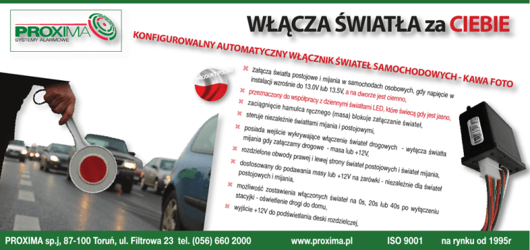 WŁĄCZA ŚWIATŁA za CIEBIE KONFIGU ROWALN Y AUTOM ATYCZNY WŁĄCZNIK ŚWIATEŁ SAMOCH t załącza św KI ODOWYC POLS ia tła T po K st U ojowe i mija H - KAWA PROD instalacji w nia w sa zrośnie do 13 mochodach osobowych, .0V lub 13.5 t przeznac V, gdy napięc a na dworze jest zony do wsp ie w ciemno, ół pr ac y z t zaciąg dz ie nn ym i światłami LE nięcie ham ulca ręczne D, które świe go (masa) cą gdy jest ja t steruje blokuje załą sno, niezależnie czanie świa światłami m teł, ija ni a i postojow t posiada ymi, wejście wyk rywające w mijania gdy łączenie św załączamy ia te ł drogowyc drogowe h - wyłącza t rozdziel masa lub +1 one obwod światła 2V, y prawej i le wej strony t dostosow św ia te ł postojowyc any do poda h i świateł m wania mas postojowyc ijania, y lub +12V h i mijania, na żarówki ni ez ależnie dla t możliw świateł ość zostaw ienia włącz stacyjki - oś onych świa wietlenie dr teł na 0s, 20s lub 40 ogi do dom t wyjście s po wyłąc u, +12V do po zeniu dświetlania deski rozdzi elczej, PROXIMA sp.j, 87-100 Toruń, ul. Filtrowa 23 tel. (056) 660 2000 www.proxima.pl ISO 9001 FOTO na rynku od 1995r Opis działania Sterownik automatycznie załącza światła postojowe i mijania w samochodach osobowych, gdy napięcie w instalacji wzrośnie do 13.0V lub 13,5V (wybierane zworą na płytce sterownika), a na zewnątrz pojazdu jest ciemno. Przeznaczony do współpracy z dziennymi światłami LED, które świecą gdy jest jasno. Jeżeli uruchomimy pojazd, a ręczny hamulec jest zaciągnięty (podaje masę) to mimo przekroczenia progu napięcia włączenia świateł (13V lub 13,5V wybierane zworą na płytce sterownika) światła nie zostaną włączone. Umożliwia to np. uruchomienie i ogrzanie pojazdu bez dodatkowego obciążania akumulatora zapalonymi światłami. Zwolnienie hamulca automatycznie włącza światła jeżeli na zewnątrz pojazdu jest ciemno. Sterownik może wyłączać światła albo natychmiast po wyłączeniu stacyjki, albo po 20s/40s (wybierane zworą na płytce sterownika). Opóźnione wyłączenie świateł umożliwia oświetlenie drogi powrotu do domu. Niektóre samochody wyłączają światła mijania gdy zostają włączone światła drogowe. Sterownik może wyłączać światła mijania (zostawia załączone światła postojowe) jeżeli wykryje włączenie świateł drogowych. Światła drogowe wykrywane są (przewód nr 11) gdy załączane są masą lub +12V (polaryzacja wybierana zworą na płytce sterownika). Sterownik zawiera dwa przekaźniki, każdy z dwoma rozdzielonymi stykami. Umożliwia to sterowanie żarówkami niezależnie lewej i prawej strony świateł mijania i świateł postojowych oraz wybór rodzaju zasilania żarówek masą lub +12V. Dodatkowo wyprowadzony jest przewód zasilający deskę rozdzielczą (niektóre auta niemieckie), gdy zapadnie zmrok deska rozdzielcza staje się widoczna. Schemat wyłącznika świateł - KAWA Sposób dołączenia 1 - pomocnicze zasilanie deski rozdzielczej +12V/3A, 2,4 - dołączyć do żarówek świateł postojowych, 3 - dołączyć napięcie zasilające światła postojowe masę lub +12V, 5,7- dołączyć do żarówek świateł mijania, 6 - dołączyć napięcie zasilające światła mijania masę lub +12V, 8 - +12V STACYJKA , 9 - dołączyć do hamulca ręcznego (masa gdy zaciągnięty), 10 - +12V ZASILANIE stałe, jeżeli światła mają gasnąć natychmiast po wyłączeniu stacyjki należy przewód +12V ZASILANIE połączyć z przewodem +12V STACYJKA i oba przewody dołączyć do +12V po stacyjce, 11- dołączyć do świateł drogowych - wybrać zworą na płytce sterownika napięcie które pojawia się gdy załączone zostają światła drogowe (masa lub +12V) 12- masa zasilania, 13 - fototranzystor - zamocować w kopicie tak, aby nie widział świateł obcego pojazdu pojazdu. 13.Fototranzystor Zworka A - wybiera polaryzację napięcia która pojawia się gdy włączymy światła drogowe. Jeżeli podczas włączania świateł drogowych, światła mijania nie wyłączają się, przewód 11 pozostawić niepodłączony, a pozycja zworki nie ma znaczenia. Fabryczna pozycja: wykrywa +12V. Zworka B - wybiera próg napięcia załączania świateł, jeżeli auto ma stary akumulator/alternator i światła włączają się niepewnie lub wcale, ustawić próg 13.0V. Fabryczna pozycja 13,5V. Zworka C - wybiera długość świecenia żarówek po wyłączeniu stacyjki 20s lub 40s. Fabryczna pozycja 40s. UWAGA. Jeżeli światła mają gasnąć natychmiast po wyłączeniu stacyjki należy przewód +12V ZASILANIE połączyć z przewodem +12V STACYJKA i oba przewody dołączyć do +12V po stacyjce, wówczas ustawienie zworki C nie ma znaczenia. Producent stanowczo zaleca zastosownie również dwóch bezpieczników w obwodzie przewodów 3 i 6.