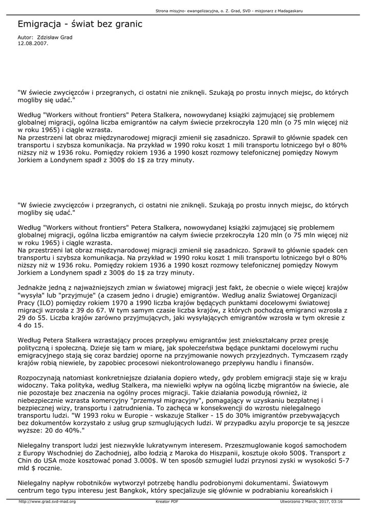 Strona misyjno- ewangelizacyjna, o. Z. Grad, SVD - misjonarz z Madagaskaru Emigracja - świat bez granic Autor: Zdzisław Grad 12.08.2007. "W świecie zwycięzców i przegranych, ci ostatni nie zniknęli. Szukają po prostu innych miejsc, do których mogliby się udać." Według "Workers without frontiers" Petera Stalkera, nowowydanej książki zajmującej się problemem globalnej migracji, ogólna liczba emigrantów na całym świecie przekroczyła 120 mln (o 75 mln więcej niż w roku 1965) i ciągle wzrasta. Na przestrzeni lat obraz międzynarodowej migracji zmienił się zasadniczo. Sprawił to głównie spadek cen transportu i szybsza komunikacja. Na przykład w 1990 roku koszt 1 mili transportu lotniczego był o 80% niższy niż w 1936 roku. Pomiędzy rokiem 1936 a 1990 koszt rozmowy telefonicznej pomiędzy Nowym Jorkiem a Londynem spadł z 300$ do 1$ za trzy minuty. "W świecie zwycięzców i przegranych, ci ostatni nie zniknęli. Szukają po prostu innych miejsc, do których mogliby się udać." Według "Workers without frontiers" Petera Stalkera, nowowydanej książki zajmującej się problemem globalnej migracji, ogólna liczba emigrantów na całym świecie przekroczyła 120 mln (o 75 mln więcej niż w roku 1965) i ciągle wzrasta. Na przestrzeni lat obraz międzynarodowej migracji zmienił się zasadniczo. Sprawił to głównie spadek cen transportu i szybsza komunikacja. Na przykład w 1990 roku koszt 1 mili transportu lotniczego był o 80% niższy niż w 1936 roku. Pomiędzy rokiem 1936 a 1990 koszt rozmowy telefonicznej pomiędzy Nowym Jorkiem a Londynem spadł z 300$ do 1$ za trzy minuty. Jednakże jedną z najważniejszych zmian w światowej migracji jest fakt, że obecnie o wiele więcej krajów "wysyła" lub "przyjmuje" (a czasem jedno i drugie) emigrantów. Według analiz Światowej Organizacji Pracy (ILO) pomiędzy rokiem 1970 a 1990 liczba krajów będących punktami docelowymi światowej migracji wzrosła z 39 do 67. W tym samym czasie liczba krajów, z których pochodzą emigranci wzrosła z 29 do 55. Liczba krajów zarówno przyjmujących, jaki wysyłających emigrantów wzrosła w tym okresie z 4 do 15. Według Petera Stalkera wzrastający proces przepływu emigrantów jest zniekształcany przez presję polityczną i społeczną. Dzieje się tam w miarę, jak społeczeństwa będące punktami docelowymi ruchu emigracyjnego stają się coraz bardziej oporne na przyjmowanie nowych przyjezdnych. Tymczasem rządy krajów robią niewiele, by zapobiec procesowi niekontrolowanego przepływu handlu i finansów. Rozpoczynają natomiast konkretniejsze działania dopiero wtedy, gdy problem emigracji staje się w kraju widoczny. Taka polityka, według Stalkera, ma niewielki wpływ na ogólną liczbę migrantów na świecie, ale nie pozostaje bez znaczenia na ogólny proces migracji. Takie działania powodują również, iż niebezpiecznie wzrasta komercyjny "przemysł migracyjny", pomagający w uzyskaniu bezpłatnej i bezpiecznej wizy, transportu i zatrudnienia. To zachęca w konsekwencji do wzrostu nielegalnego transportu ludzi. "W 1993 roku w Europie - wskazuje Stalker - 15 do 30% imigrantów przebywających bez dokumentów korzystało z usług grup szmuglujących ludzi. W przypadku azylu proporcje te są jeszcze wyższe: 20 do 40%." Nielegalny transport ludzi jest niezwykle lukratywnym interesem. Przeszmuglowanie kogoś samochodem z Europy Wschodniej do Zachodniej, albo łodzią z Maroka do Hiszpanii, kosztuje około 500$. Transport z Chin do USA może kosztować ponad 3.000$. W ten sposób szmugiel ludzi przynosi zyski w wysokości 5-7 mld $ rocznie. Nielegalny napływ robotników wytworzył potrzebę handlu podrobionymi dokumentami. Światowym centrum tego typu interesu jest Bangkok, który specjalizuje się głównie w podrabianiu koreańskich i http://www.grad.svd-mad.org Kreator PDF Utworzono 2 March, 2017, 03:16 Strona misyjno- ewangelizacyjna, o. Z. Grad, SVD - misjonarz z Madagaskaru japońskich paszportów używanych przez chińskich emigrantów. Operacja taka kosztuje około 2.000$ za sztukę. Napływ emigrantów napędzany jest także przez kompanie zapewniające finansowanie. Niektóre z nich oferują długoterminowe kredyty, które można zacząć spłacać po wielu latach. Tym niemniej krótkoterminowe finansowanie okazuje się także niezłym interesem. Boliwijscy ubodzy farmerzy, aby przekroczyć granicę argentyńską muszą zadeklarować posiadanie przynajmniej 1.500$ w gotówce. Ten przepis stworzył nową formę finansowej pomocy: oferuje się pasażerom pożyczki w wymaganej wysokości oprocentowane na 10%. Ruch migracji kształtowany jest przez różnice w standardzie życia. Jednym z najbardziej realistycznych wskaźników w tej dziedzinie jest różnica w wysokości zarobków pomiędzy poszczególnymi krajami. Co ciekawe, emigranci zawsze jednak zorganizowani są w jednej, dość wąskiej dziedzinie działalności. I tak np. w USA najwięcej emigrantów pracuje w rolnictwie; w Belgii i Holandii w przemyśle kopalnianym; w Danii, Niemczech, Australii i Kanadzie w przemyśle wytwórczym; we Francji i Luksemburgu w przemyśle konstrukcyjnym; w Wielkiej Brytanii w służbach cywilnych. W przeszłości świat stanął już w obliczu migracji na ogromną skalę. Chodzi tu o dwa wielkie ruchy: pierwszy związany z handlem niewolnikami, drugi z migracją z Europy do Nowego Świata i Australii. Szacuje się, iż przed rokiem 1850 z Afryki do Ameryki wywieziono około 15 mln niewolników. Natomiast po zniesieniu niewolnictwa przeniesionych zostało ponad 30 mln przymusowych pracowników. Pomiędzy rokiem 1846 a 1939 Europę opuściło blisko 59 mln ludzi. Większość z nich zawędrowała do obu Ameryk, Australii, Nowej Zelandii i RPA. Największy ruch migracyjny miał miejsce pomiędzy rokiem 1815 a 1915. Jego szczyt zanotowano właśnie w 1915 roku, kiedy do USA przybyło łącznie 1,2 mln emigrantów (1,2% ówczesnej populacji kraju). W 1996 roku do sam