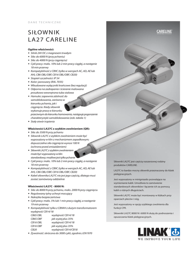DANE TECHNICZNE SIŁOWNIK LA27 CARELINE Ogólne właściwości: • Silnik 24V DC z magnesem trwałym • Siła: do 6000 N (przy pchaniu) • Siła: do 4000 N (przy ciągnięciu) • Cykl pracy: maks. 10% lub 2 min pracy ciągłej, a następnie 18 min przerwy • Kompatybilność z CB9C (tylko w wersjach AC, AD, AE lub AH), CB6 OBL/OBF, CB16 OBL/OBF, CB20) • Stopień szczelności: IP 54 • Kolor: jasnoszary (RAL 7035) • Wbudowane wyłączniki krańcowe (bez regulacji) • Odporna na zadrapania i ścieranie malowana proszkowo wewnętrzna tuba stalowa • Hamulec zapewnia zdolność do samoblokowania, zarówno w kierunku pchania, jak i ciągnięcia. Kiedy siłownik wykonuje pracę w kierunku przeciwnym do kierunku hamowania, następuje pogorszenie charakterystyki samoblokowania (zob. tabela 1) • Stały otwór trzpienia Właściwości LA27C z szybkim zwolnieniem (QR): • Siła: do 3500 N przy pchaniu • Siłownik LA27C z szybkim zwolnieniem może być wyposażony w klin z mechanizmem zapadkowym; dopuszczalna siła ciągnięcia wynosi 100 N (ochrona przed zmiażdżeniem) • Siłownik LA27C z szybkim zwolnieniem może być wyposażony w klin standardowy; możliwe jest tylko pchanie • Cykl pracy: maks. 10% lub 2 min pracy ciągłej, a następnie 18 min przerwy • Kompatybilność z CB9C (tylko w wersjach AC, AD, AE lub AH), CB6 OBL/OBF, CB16 OBL/OBF, CB20) • Kabel siłownika LA27C nie jest jego częścią, dlatego musi zostać zamówiony oddzielnie Właściwości LA27C - 8000 N: • Siła: do 8000 N przy pchaniu, maks. 2000 N przy ciągnięciu • Regulowany tylny uchwyt mocujący • Nakrętka bezpieczeństwa • Cykl pracy: maks. 5% lub 1 min pracy ciągłej, a następnie 19 min przerwy • Kompatybilność tylko z CB9AH z dużym transformatorem wydajność CB14/18 CB6S OBL wydajność CB14/18 CB6S OBF jak wyżej plus 35% CB16 OBL wydajność CB14/18 CB16 OBF jak wyżej plus 35% CB20 wydajność CB14/CB18 • Żywotność: skrócona do 3000 cykli, zgodnie z EN1970 Siłownik LA27C jest częścią rozszerzonej rodziny produktów CARELINE. LA27C to bardzo mocny siłownik przeznaczony do łóżek pielęgnacyjnych. Jest wyposażony w minigniazdo pozwalające na wymienianie kabli. Umożliwia to zamówienie standardowych siłowników i łączenie ich za pomocą kabli o różnych długościach. Siłownik LA27C może być montowany w łóżkach przy oparciach pleców i nóg. Jest wyposażony w opcję szybkiego zwolnienia dla funkcji CPR. Siłowniki LA27C 8000 N i 6000 N służą do podnoszenia i opuszczania łóżek pielęgnacyjnych. Opcje: • Nakrętka bezpieczeństwa (standard w LA27C 8000 N) • Kliny mechaniczne (możliwe tylko pchanie) (niedostępne w LA27C 8000 N) • Tylny uchwyt mocujący w położeniu 0° lub 90° • Czujnik Halla • IP66 (niezmywalne) • Regulowany tylny uchwyt mocujący (standard w LA27C 8000 N) Zasady użytkowania: • Cykl pracy: 2/18; 2 min pracy ciągłej, a następnie 18 min przerwy • Temperatura otoczenia: od +10° do +40° (siłownik musi również mieć tę temperaturę) LA27C z szybkim zwolnieniem Przykładowe zamówienie: 27 2 5 3 C + 0 1 1 0 0 0 4 1 Połączenie 1 = zob. strona 5 A = zob. strona 5 B = zob. strona 5 Klasa IP 2 = IP 66 (niezmywalne) 4 = IP 54 Typ silnika 0 = standard Długość skoku 100 = 100 mm 150 = 150 mm 200 = 200 mm 250 = 250 mm Hamulec 1 = Hamowanie podczas pchania Zabezpieczenie 0 = standard 1 = nakrętka bezpieczeństwa (pchanie) 2 = klin mechaniczny - pchanie (tylko wraz z opcją E) 3 = kliny mechaniczne i nakrętka bezpieczeństwa Kolor Opcja I = jasnoszary RAL 7035 J = jasnoszary RAL 7035 typu V0 tworzywo / specjalny C = szybkie zwolnienie wersja 2 E = szybkie zwolnienie wersja 2 czujnik Halla F = szybkie zwolnienie wersja 2 klin z mechanizmem zapadkowym Otwór trzpienia 3 = ø 10,3, stały Tylny uchwyt mocujący 5 = regulowany 6 = obrócony o 90° regulowany Typ wrzeciona 2 = skok 5 mm (gwint dwukrotny) 7 = skok 6 mm (gwint dwukrotny) Typ siłownika 27 = LA27 LA27C 8000 N Przykładowe zamówienie: 27 1 5 3 0 + 4 1 2 0 0 0 4 1 Połączenie 1 = miniwtyk dla CB9 A = miniwtyk dla CB6 OBF, CB16 OBF, CB20 B = miniwtyk dla CB6 OBL/OBF, CB16 OBL/OBF Stopień IP 4 = IP 54 Typ silnika 0 = standard Skok 150 = 150 mm 200 = 200 mm Hamulec 1 = Hamowanie podczas pchania Zabezpieczenie 4 = nakrętka bezpieczeństwa / duże obciążenie / pchanie Kolor I = jasnoszary RAL 7035 J = jasnoszary RAL 7035 typu V0 tworzywo / specjalny Opcja 0 = standard Otwór trzpienia 3 = ø 10,3, stały Tylny uchwyt mocujący 5 = regulowany 6 = obrócony o 90° regulowany Typ wrzeciona 1 = skok 3 mm (gwint pojedynczy) Typ siłownika 27 = LA27 Istnieje możliwość zamówienia siłownika LA27C o dowolnej długości skoku (skokowo co 5 mm) i dowolnych wymiarach zabudowy. Wymaga to zamówienia jednorazowo co najmniej 200 sztuk. LA27C Przykładowe zamówienie: 27 2 1 0 0 A 0 1 1 0 0 0 4 1 Połączenie 1 = miniwtyk dla CB9 A = miniwtyk dla CB6 OBF, CB16 OBF, CB20 B = miniwtyk dla CB6 OBL/OBF, CB16 OBL/OBF Stopień IP 2 = IP 66 (niezmywalne) 4 = IP 54 Typ silnika 0 = standard Skok 100 = 100 mm 150 = 150 mm 200 = 200 mm Hamulec 1 = Hamowanie podczas pchania 2 = hamowanie podczas ciągnięcia Zabezpieczenie 0 = standard 1 = nakrętka bezpieczeństwa (pchanie) 2 = kliny mechaniczne (pchanie) 3 = kliny mechaniczne z nakrętką bezpieczeństwa (pchanie) Kolor I = jasnoszary RAL 7035, blokada kabla J = jasnoszary RAL 7035, blokada kabla, V0 Opcja 0 = standard B = podwójny czujnik Halla C = QR wersja 2 E = QR wersja 2, Hall ? F = QR wersja 2, klin z mechanizmem zapadkowym Otwór trzpienia 0 = standard ø10,3 3 = ø10,3 stały z tulejami Tylny uchwyt mocujący 1 = standard ø10,2 2 = obrócony o 90° ø10,2 5 = regulowany (QR, 8000 N) 6 = obrócony o 90°, regulowany (QR, 8000 N) Typ wrzeciona 1 = skok 3 mm (gwint pojedynczy) 2 = skok 5 mm (gwint dwukrotny) 3 = skok 9 mm (gwint trzykrotny) 4 = skok 4 mm (gwint dwukrotny) 7 = skok 6 mm (gwint dwukrotny) Typ siłown