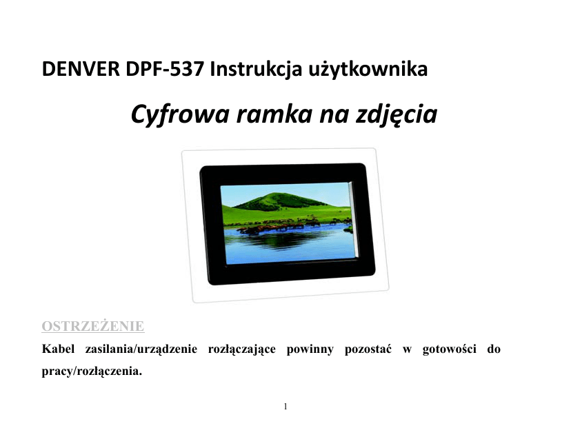 DENVER DPF‐537 Instrukcja użytkownika Cyfrowa ramka na zdjęcia OSTRZEŻENIE Kabel zasilania/urządzenie rozłączające powinny pozostać w gotowości do pracy/rozłączenia. 1 Wprowadzenie Gratulujemy zakupu cyfrowej ramki na zdjęcia Digital Photo Frame. Przed uruchomieniem urządzenia prosimy dokładnie zapoznać się z instrukcją i zachować ją na przyszłość. Dzięki instrukcji będzie można skorzystać z wszystkich atrakcyjnych funkcji urządzenia i oglądanie cyfrowej ramki na zdjęcia Digital Photo Frame będzie sprawiało większą przyjemność. Cyfrowa ramka na zdjęcia Digital Photo Frame umożliwia oglądanie cyfrowych zdjęć bezpośrednio z karty pamięci aparatu. Można także utworzyć pokaz slajdów z różnorodnymi efektami przejścia. Nie jest wymagane żadne połączenie z komputerem, aparatem cyfrowym ani Internetem. ●Odtwarza zdjęcia zapisane na urządzeniach do przechowywania danych poprzez port USB 2.0, różne czytniki kart lub z pamięci wbudowanej. 2 ●Obsługa kart SD, MMC oraz MS. ●Urządzenie kompatybilne z większością aparatów cyfrowych zapisujących zdjęcia jako pliki JPEG. ●Automatyczny pokaz slajdów z różnorodnymi efektami przejścia oraz regulowanym czasem wyświetlania. ●Kartę pamięci należy wkładać rowkami w kierunku do siebie. Nie wkładaj karty pamięci do gniazda na siłę. ●Jeśli nie można łatwo włożyć karty pamięci do końca, być może jest włożona niewłaściwą stroną. Uwaga: DPF = Cyfrowa ramka na zdjęcia Digital Photo Frame. Środki zapobiegawcze i konserwacja • Wyłącznie do użytku w pomieszczeniach. • Aby uniknąć uszkodzenia plików lub porażenia elektrycznego, nie należy narażać tego 3 urządzenia na wilgoć. • Aby uniknąć przegrzania, nigdy nie należy blokować otworów wentylacyjnych z tyłu ramki. • Multimedialną cyfrową ramkę na zdjęcia należy trzymać z dala od bezpośredniego światła słonecznego. Bezpośrednie światło słoneczne może ją uszkodzić. • Nie należy rozmontowywać multimedialnej cyfrowej ramki na zdjęcia. Istnieje zagrożenie porażeniem elektrycznym. W środku nie ma części, które użytkownik mógłby serwisować samodzielnie. Rozmontowanie multimedialnej cyfrowej ramki na zdjęcia unieważni gwarancję. • Nie należy używać multimedialnej cyfrowej ramki na zdjęcia, jeśli warunki mogłyby doprowadzić do kondensacji lub uszkodzenia. 4 Ramka DPF widok z boku ●DC (+5V): Wejście DC przewodu zasilającego odtwarzacz DPF. ●Karta SD/MMC/MS: Gniazdo w odtwarzaczu DPF na kartę SD/MMC/MS . ●Gniazdo USB: Gniazdo w odtwarzaczu DPF na pamięć USB. Przegląd odtwarzacza Przyciski kontrolne i funkcyjne: 5 DC DC Karta SD/MMC/MS Karta S USB Gniazdo Gniazdo USB 1. PRZYCISK ENTER: Zatwierdza wybór. Służy także do rozpoczęcia lub wstrzymania odtwarzania. 2. PRZYCISK ZMIANY W LEWO(e): Lewy kursor wybierający funkcję i następne zdjęcie. 3. PRZYCISK ZMIANY W PRAWO (f): Prawy kursor wybierający funkcję i poprzednie zdjęcie. 4. PRZYCISK MENU: Pokazuje menu wyboru. 5. PRZYCISK DO GÓRY (▲): Przycisk wyboru funkcji oraz kursor obracania od dołu do góry. 6. PRZYCISK W DÓŁ(▼): Przycisk wyboru funkcji oraz kursor czasu/daty od góry do dołu. 7. PRZYCISK STANU GOTOWOŚCI: WŁĄCZANIE/WYŁĄCZANIE odtwarzania. 8. Gniazdko na podpórkę. 6 Czynności wstępne Umieść podpórkę w ramce Digital Photo Frame, aby podeprzeć ramkę. Podłącz wtyczkę zasilacza DC najpierw do odtwarzacza DPF, a następnie podłącz przewód zasilający do standardowego gniazdka w ścianie. Po włożeniu do ramki karty pamięci lub pamięci flash USB, zdjęcia zapisane na karcie pamięci lub pamięci flash USB automatycznie zaczną się pojawiać na ekranie. Zasilacz sieciowy DPF Gniazdko 7 8 Funkcje DPF ●WYBÓR KARTY W modelu z pokazem slajdów naciśnij trzykrotnie przycisk Standby, aby wyświetlić menu wyboru urządzenia. Naciśnij przyciski strzałek, aby wybrać kartę, tarczę U albo pamięć wbudowaną. Naciśnij przycisk Enter, aby zatwierdzić (Rys.1). Rys.1 Rys.2 9 ●GŁÓWNE FUNKCJE Po wybraniu urządzenia, za pomocą przycisków strzałek można wybrać główne funkcje, takie jak Pokaz slajdów, Zdjęcie oraz Kalendarz (Rys.2). Naciśnij przycisk Enter wybierając określony tryb funkcji. 1. Pokaz slajdów: W tej funkcji menu naciśnięcie przycisku Enter włącza tryb pokazu slajdów, odtwarzacz wyświetli zdjęcie automatycznie. 2. Zdjęcie: Ta funkcja pozwala przeglądać zdjęcia w pojedynczym oknie albo sześciu oknach. 3. Kalendarz: Ta funkcja wyświetla użytkownikowi kalendarz oraz zegar. ●FUNKCJA ZDJĘCIA W tym trybie funkcji (Rys.3). 1. Naciśnij przyciski strzałek, aby wybrać przegląd zdjęć w sześciu oknach. 2. Naciśnij przycisk Enter, aby wyświetlić obrazki. 10 3. Naciśnij przycisk Menu, aby wyświetlić menu ustawień w pauzie pokazu slajdów. 4. Naciśnij przycisk Standby, aby wyjść do Rys.3 głównego trybu funkcji. ●FUNKCJA KALENDARZA Funkcja ta służy do wyświetlania kalendarza oraz zegara (Rys.4). 1. Za pomocą przycisków strzałek można przeglądać kalendarz pokazywany po lewej stronie Rys.4 ramki DPF. 2. Jeśli na wybranej karcie znajdują się pliki jpg, można przeglądać zdjęcia w małym oknie. 3. Naciśnięcie przycisku Standby oznacza wyjście z trybu wyświetlania kalendarza. Ustawienia ramki DPF Naciśnij przycisk Menu, aby wejść do menu 11 ustawień. W menu ustawień za pomocą przycisków strzałek można wybrać pozycję do ustawienia i obsługi. Jeśli pozycja wyświetlana jest na szaro, nie można w niej dokonać żadnych zmian (Rys. 5). 1. Rozmiar obrazu: Tryb wyświetlania pokazu slajdów. Zawiera trzy tryby: automatyczne dopasowanie, optymalizację oraz panel skanowania. 2. Efekt pokazu slajdów: Specjalne efekty przejścia z jednego zdjęcia na drugie w pokazie Rys.5 slajdów. 3. Odstęp w pokazie slajdów: Czas wyświetlania następnego zdjęcia. 4. Podział w pokazie slajdów