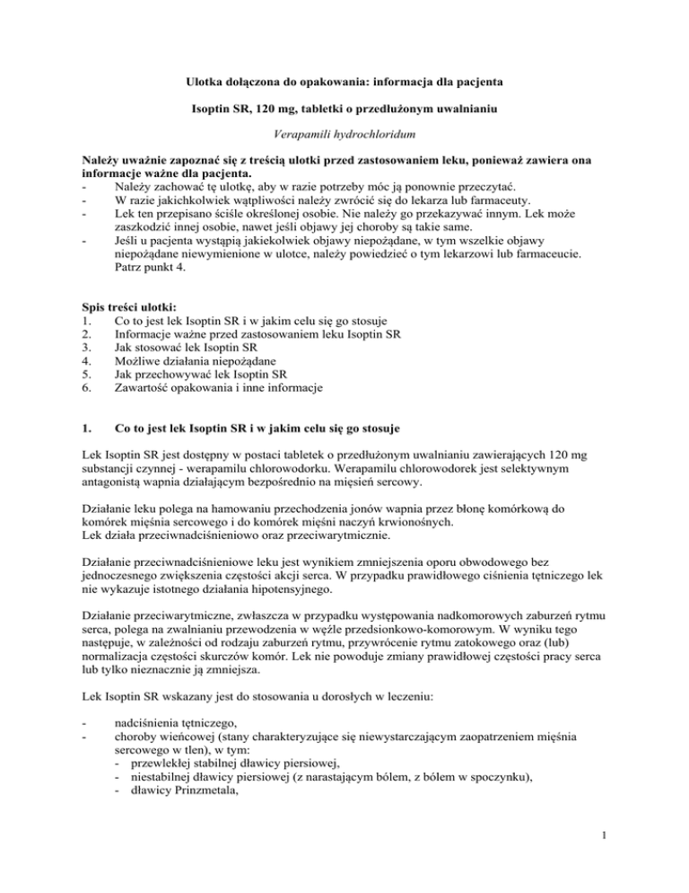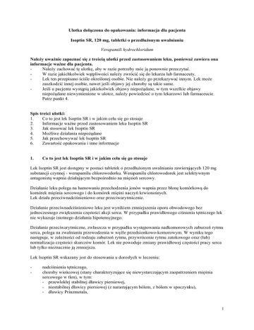 Ulotka dołączona do opakowania: informacja dla pacjenta Isoptin SR, 120 mg, tabletki o przedłużonym uwalnianiu Verapamili hydrochloridum Należy uważnie zapoznać się z treścią ulotki przed zastosowaniem leku, ponieważ zawiera ona informacje ważne dla pacjenta. Należy zachować tę ulotkę, aby w razie potrzeby móc ją ponownie przeczytać. W razie jakichkolwiek wątpliwości należy zwrócić się do lekarza lub farmaceuty. Lek ten przepisano ściśle określonej osobie. Nie należy go przekazywać innym. Lek może zaszkodzić innej osobie, nawet jeśli objawy jej choroby są takie same. Jeśli u pacjenta wystąpią jakiekolwiek objawy niepożądane, w tym wszelkie objawy niepożądane niewymienione w ulotce, należy powiedzieć o tym lekarzowi lub farmaceucie. Patrz punkt 4. Spis treści ulotki: 1. Co to jest lek Isoptin SR i w jakim celu się go stosuje 2. Informacje ważne przed zastosowaniem leku Isoptin SR 3. Jak stosować lek Isoptin SR 4. Możliwe działania niepożądane 5. Jak przechowywać lek Isoptin SR 6. Zawartość opakowania i inne informacje 1. Co to jest lek Isoptin SR i w jakim celu się go stosuje Lek Isoptin SR jest dostępny w postaci tabletek o przedłużonym uwalnianiu zawierających 120 mg substancji czynnej - werapamilu chlorowodorku. Werapamilu chlorowodorek jest selektywnym antagonistą wapnia działającym bezpośrednio na mięsień sercowy. Działanie leku polega na hamowaniu przechodzenia jonów wapnia przez błonę komórkową do komórek mięśnia sercowego i do komórek mięśni naczyń krwionośnych. Lek działa przeciwnadciśnieniowo oraz przeciwarytmicznie. Działanie przeciwnadciśnieniowe leku jest wynikiem zmniejszenia oporu obwodowego bez jednoczesnego zwiększenia częstości akcji serca. W przypadku prawidłowego ciśnienia tętniczego lek nie wykazuje istotnego działania hipotensyjnego. Działanie przeciwarytmiczne, zwłaszcza w przypadku występowania nadkomorowych zaburzeń rytmu serca, polega na zwalnianiu przewodzenia w węźle przedsionkowo-komorowym. W wyniku tego następuje, w zależności od rodzaju zaburzeń rytmu, przywrócenie rytmu zatokowego oraz (lub) normalizacja częstości skurczów komór. Lek nie powoduje zmiany prawidłowej częstości pracy serca lub tylko nieznacznie ją zmniejsza. Lek Isoptin SR wskazany jest do stosowania u dorosłych w leczeniu: - nadciśnienia tętniczego, choroby wieńcowej (stany charakteryzujące się niewystarczającym zaopatrzeniem mięśnia sercowego w tlen), w tym: - przewlekłej stabilnej dławicy piersiowej, - niestabilnej dławicy piersiowej (z narastającym bólem, z bólem w spoczynku), - dławicy Prinzmetala, 1 - 2. - dławicy po zawale mięśnia sercowego bez niewydolności serca, gdy nie jest wskazane stosowanie leków β-adrenolitycznych, zaburzeń rytmu serca takich, jak: - napadowy częstoskurcz nadkomorowy, migotanie/trzepotanie przedsionków z szybkim przewodzeniem przedsionkowo-komorowym (z wyjątkiem zespołu Wolffa-ParkinsonaWhite’a [WPW] lub zespołu Lowna-Ganonga-Levine’a [LGL]). Informacje ważne przed zastosowaniem leku Isoptin SR Kiedy nie stosować leku Isoptin SR jeśli pacjent ma uczulenie na werapamilu chlorowodorek lub którykolwiek z pozostałych składników tego leku (wymienionych w punkcie 6), we wstrząsie kardiogennym, w bloku przedsionkowo-komorowym II˚ lub III˚ (z wyjątkiem pacjentów ze sprawnym stymulatorem serca), w zespole chorego węzła zatokowego (z wyjątkiem pacjentów ze sprawnym stymulatorem serca), w niewydolności serca ze zmniejszeniem frakcji wyrzutowej poniżej 35% oraz (lub) ciśnieniem zaklinowania w tętnicy płucnej powyżej 20 mmHg (jeśli nie jest wtórne do częstoskurczu nadkomorowego ustępującego po leczeniu werapamilem), w migotaniu/trzepotaniu przedsionków z obecnością dodatkowej drogi przewodzenia (np. zespół Wolffa-Parkinsona-White’a [WPW], zespół Lowna-Ganonga-Levine’a [LGL]). W przypadku podania leku u tych pacjentów istnieje ryzyko wystąpienia tachyarytmii komorowej, w tym migotania komór. Ostrzeżenia i środki ostrożności Szczególną ostrożność należy zachować u pacjentów: z ostrym zawałem mięśnia sercowego powikłanym rzadkoskurczem, znacznym niedociśnieniem tętniczym lub zaburzeniami czynności lewej komory, z blokiem serca, blokiem przedsionkowo-komorowym I˚, rzadkoskurczem, asystolią, stosujących leki przeciwarytmiczne, leki β-adrenolityczne, stosujących digoksynę, z niewydolnością serca z frakcją wyrzutową powyżej 35%, z niedociśnieniem tętniczym, stosujących statyny, z zaburzeniami przewodzenia nerwowo-mięśniowego [miastenia (myasthenia gravis), zespół Lamberta i Eatona, późne stadia dystrofii mięśniowej Duchenne’a], z zaburzeniami czynności nerek, z ciężką niewydolnością wątroby. Lek Isoptin SR a inne leki Należy powiedzieć lekarzowi o wszystkich lekach przyjmowanych przez pacjenta obecnie lub ostatnio, także o lekach, które pacjent planuje przyjmować. Możliwe są interakcje werapamilu z następującymi lekami: leki α-adrenolityczne (np. prazosyna, terazosyna), leki przeciwarytmiczne (np. flekainid, chinidyna), leki rozszerzające oskrzela (np. teofilina), leki przeciwdrgawkowe i przeciwpadaczkowe (np. karbamazepina, fenytoina), leki przeciwdepresyjne (np. imipramina), leki przeciwcukrzycowe (np. gliburyd), leki przeciw dnie moczanowej (np. kolchicyna), leki stosowane w zakażeniach (np. klarytromycyna, erytromycyna, ryfampicyna, telitromycyna), 2 - leki przeciwnowotworowe (np. doksorubicyna), barbiturany (np. fenobarbital), benzodiazepiny i inne leki przeciwlękowe (np. buspiron, midazolam), leki β-adrenolityczne (np. metoprolol, propranolol), glikozydy nasercowe (np. digitoksyna, digoksyna), antagoniści receptora H2 (np. cymetydyna), leki immunomodulujące i immunosupresyjne (np. cyklosporyna, ewerolimus, syrolimus, takrolimus), leki zmniejszające stężenie lipidów (np. atorwastatyna, lowastatyna, symwastatyna), agoniści recept