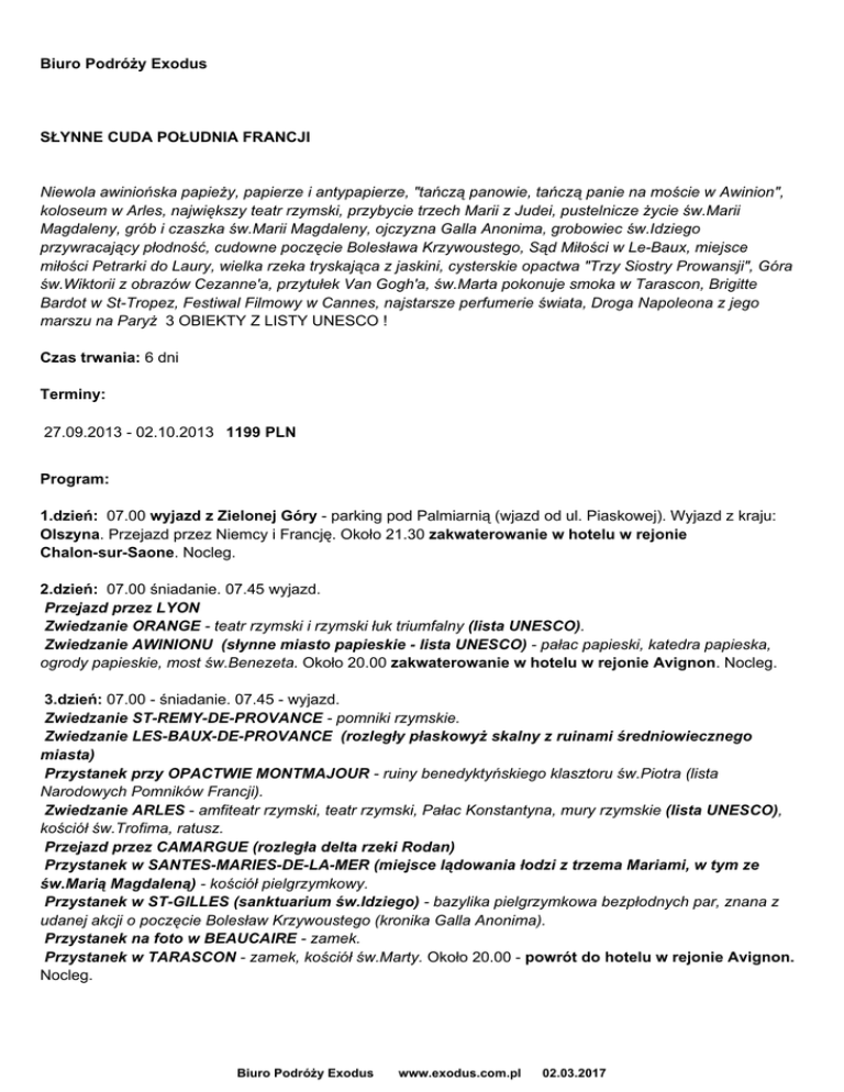 Biuro Podróży Exodus SŁYNNE CUDA POŁUDNIA FRANCJI Niewola awiniońska papieży, papierze i antypapierze, "tańczą panowie, tańczą panie na moście w Awinion", koloseum w Arles, największy teatr rzymski, przybycie trzech Marii z Judei, pustelnicze życie św.Marii Magdaleny, grób i czaszka św.Marii Magdaleny, ojczyzna Galla Anonima, grobowiec św.Idziego przywracający płodność, cudowne poczęcie Bolesława Krzywoustego, Sąd Miłości w Le-Baux, miejsce miłości Petrarki do Laury, wielka rzeka tryskająca z jaskini, cysterskie opactwa "Trzy Siostry Prowansji", Góra św.Wiktorii z obrazów Cezanne'a, przytułek Van Gogh'a, św.Marta pokonuje smoka w Tarascon, Brigitte Bardot w St-Tropez, Festiwal Filmowy w Cannes, najstarsze perfumerie świata, Droga Napoleona z jego marszu na Paryż 3 OBIEKTY Z LISTY UNESCO ! Czas trwania: 6 dni Terminy: 27.09.2013 - 02.10.2013 1199 PLN Program: 1.dzień: 07.00 wyjazd z Zielonej Góry - parking pod Palmiarnią (wjazd od ul. Piaskowej). Wyjazd z kraju: Olszyna. Przejazd przez Niemcy i Francję. Około 21.30 zakwaterowanie w hotelu w rejonie Chalon-sur-Saone. Nocleg. 2.dzień: 07.00 śniadanie. 07.45 wyjazd. Przejazd przez LYON Zwiedzanie ORANGE - teatr rzymski i rzymski łuk triumfalny (lista UNESCO). Zwiedzanie AWINIONU (słynne miasto papieskie - lista UNESCO) - pałac papieski, katedra papieska, ogrody papieskie, most św.Benezeta. Około 20.00 zakwaterowanie w hotelu w rejonie Avignon. Nocleg. 3.dzień: 07.00 - śniadanie. 07.45 - wyjazd. Zwiedzanie ST-REMY-DE-PROVANCE - pomniki rzymskie. Zwiedzanie LES-BAUX-DE-PROVANCE (rozległy płaskowyż skalny z ruinami średniowiecznego miasta) Przystanek przy OPACTWIE MONTMAJOUR - ruiny benedyktyńskiego klasztoru św.Piotra (lista Narodowych Pomników Francji). Zwiedzanie ARLES - amfiteatr rzymski, teatr rzymski, Pałac Konstantyna, mury rzymskie (lista UNESCO), kościół św.Trofima, ratusz. Przejazd przez CAMARGUE (rozległa delta rzeki Rodan) Przystanek w SANTES-MARIES-DE-LA-MER (miejsce lądowania łodzi z trzema Mariami, w tym ze św.Marią Magdaleną) - kościół pielgrzymkowy. Przystanek w ST-GILLES (sanktuarium św.Idziego) - bazylika pielgrzymkowa bezpłodnych par, znana z udanej akcji o poczęcie Bolesław Krzywoustego (kronika Galla Anonima). Przystanek na foto w BEAUCAIRE - zamek. Przystanek w TARASCON - zamek, kościół św.Marty. Około 20.00 - powrót do hotelu w rejonie Avignon. Nocleg. Biuro Podróży Exodus www.exodus.com.pl 02.03.2017 4.dzień: 07.00 śniadanie. 07.45 wyjazd. Zwiedzanie FONTAINE-DE-VAUCLUSE (miejsce miłości Petrarki do Laury) - fontannowe źródło rzeki Sorgue, najbardziej imponujące i obfite we Francji. Przystanek w SENANQUE (romańskie opactwo benedyktynów - jedna z"Trzech Sióstr Prowansji") Przejazd przez GORDES (malownicze średniowieczne miasteczko na szczycie wzgórza) Przystanek w ROUSSILLON - bajkowe formacje skalne w kolorze ochry. Przystanek w SILVACANE ( romańskie opactwo benedyktynów - jedna z"Trzech Sióstr Prowansji") Przystanek w AIX-EN-PROVENCE - aleja Cours Mirabeau, katedra św.Sewera. Przystanek w ST-MAXIMIN-LA-STE-BAUME - bazylika z grobem i relikwiarzem św.Marii Magdaleny. Przystanek w LE THORONET (romańskie opactwo benedyktynów - jedna z"Trzech Sióstr Prowansji"). Przystanek na foto w GRIMAUD - malownicza ruina średniowiecznego zamku. Spacer po ST-TROPEZ (słynny kurort gwiazd: Gerard Phillipe, Brigitte Bardot) port jachtowy, stare miasto. Około 21.00 zakwaterowanie w hotelu w rejonie Cannes. Nocleg. 5.dzień: 07.00 śniadanie. 07.45 - wyjazd. Spacer po CANNES (głowny kurort nadmorski Lazurowego Wybrzeża) Promenada Croisette, pałac festiwalowy słynnego festiwalu filmowego, aleja gwiazd, luksusowe hotele. Przejazd DROGĄ NAPOLEONA (trasa marszu cesarza na Paryż po ucieczce z wyspy Elby): - przystanek w GRASSE (światowa ojczyzna kosmetyków) - wizyta w jednej z najstarszych fabryk perfum na świecie, z możliwością zakupów. - przejazd przez CASTELLANE (malownicze miasteczko u wrót kanionu VERDON) - przejazd przez DIGNE-LES-BAINS (malownicze uzdrowisko termalne) - przejazd przez SISTERON (strategiczne miasto z wielką cytadelą) - przystanek w CORPS - jezioro zaporowe w skalistym kanionie. - przejazd przez GRENOBLE Około 21.00 - zakwaterowanie w hotelu w rejonie Genewy. Nocleg. 6.dzień: 07.00 - śniadanie. 07.45 - wyjazd. Wjazd do Szwajcarii. Spacer po GENEWIE - promenada nad jeziorem Genewskim, fontanna, stare miasto. Przejazd brzegami jezior: GENEWSKIEGO, NEUCHATEL i BIELER Przejazd przez Szwajcarię i Niemcy. Wjazd do kraju: Olszyna. Około 03.00 rozwiązanie imprezy w Zielonej Górze parking pod Palmiarnią. W cenie: autokar: wysokopokładowy, klimatyzacja, WC, video, napoje zimne i gorące (płatne) około 3800 km. noclegi: 5 x hotele kat.turystycznej - pokoje 2,3osobowe z łaz/WC. wyżywienie: 5 śniadań kontynentalnych. pilot BP EXODUS. ubezpieczenie NW, KL, bagaż. podatek VAT Dodatkowe opłaty: wstępy do obiektów turystycznych - około Uwaga: przy długich przejazdach autokar zatrzymuje się na 15-minutowe postoje każdorazowo po około 4-godzinnej jeździe. Nie bierzemy odpowiedzialności za punkty programu nie zrealizowane z przyczyn obiektywnych. Biuro Podróży Exodus www.exodus.com.pl 02.03.2017