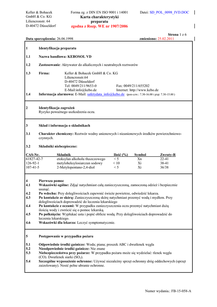 Keller & Bohacek GmbH & Co. KG Liliencronstr. 64 D-40472 Düsseldorf Forma zg. z DIN EN ISO 9001 i 14001 Datei: SD_POL_0098_IVD.DOC Karta charakterystyki preparatu zgodna z Rozp. WE nr 1907/2006 Strona 1 z 6 zmieniono: 25.02.2011 Data sporządzenia: 26.06.1998 1 Identyfikacja preparatu 1.1 Nazwa handlowa: KEBOSOL VD 1.2 Zastosowanie: Aktywator do alkalicznych i neutralnych roztworów 1.3 Firma: 1.4 Keller & Bohacek GmbH & Co. KG Liliencronstr.64 D-40472 Düsseldorf Tel: 0049/211/9653-0 Fax: 0049/211/655202 E-Mail:[email protected] Internet: http://www.kebo.de Informacja alarmowa: E-Mail: [email protected] (pon-czw.: 7.30-16.00 i piąt: 7.30-15.00 ) 2 Identyfikacja zagrożeń Ryzyko poważnego uszkodzenia oczu. 3 Skład i informacja o składnikach 3.1 Charakter chemiczny: Roztwór wodny anionowych i nieanionowych środków powierzchniowoczynnych. 3.2 Składniki niebezpieczne: CAS-Nr. 61827-42-7 126-92-1 107-41-5 4 4.1 Składnik etoksylan alkoholu tłuszczowego metyloheksylosiarczan sodowy 2-Metylopentano-2,4-diol Ilość (%) <5 < 10 <5 Symbol Xn Xi Xi Zwroty-R_ 22-41 38-41 36/38 4.6 Pierwsza pomoc Wskazówki ogólne: Zdjąć natychmiast całą zanieczyszczoną, zamoczoną odzież i bezpiecznie usunąć. Po wdechu: Przy dolegliwościach zapewnić świeże powietrze, odwiedzić lekarza. Po kontakcie ze skórą: Zanieczyszczoną skórę natychmiast przemyć wodą i mydłem. Przy dolegliwościach doprowadzić do leczenia lekarskiego Po kontakcie z oczami: W przypadku zanieczyszczenia oczu przemyć natychmiast dużą ilością wody i zwrócić się o pomoc lekarską. Po połknięciu: Wypłukać usta i popić obficie wodą. Przy dolegliwościach doprowadzić do leczenia lekarskiego. Wskazówki dla lekarza: Leczyć symptomatycznie. 5 Postępowanie w przypadku pożaru 5.1 5.2 5.3 Odpowiednie środki gaśnicze: Woda; piana; proszek ABC i dwutlenek węgla Nieodpowiednie środki gaśnicze: Nie znane Niebezpieczeństwa przy pożarze: W przypadku pożaru może się wydzielać: tlenek węgla (CO). Dwutlenek siarki (SO2). Szczególne wyposażenie ochronne: Używać niezależny sprzęt ochronny dróg oddechowych (sprzęt zaizolowany). Nosić pełne ubranie ochronne. 4.2 4.3 4.4 4.5 5.4 Numer wydania.: FB-15-058-A Keller & Bohacek GmbH & Co. KG Liliencronstr. 64 D-40472 Düsseldorf Forma zg. z DIN EN ISO 9001 i 14001 Datei: SD_POL_0098_IVD.DOC Karta charakterystyki preparatu zgodna z Rozp. WE nr 1907/2006 Strona 2 z 6 zmieniono: 25.02.2011 Data sporządzenia: 26.06.1998 KEBOSOL VD 5.5 Wskazówki dodatkowe: Spalone pozostałości i skażona woda gaśnicza muszą zostać usunięte zgodnie z przepisami miejscowych władz. Zebrać oddzielnie skażoną wodę gaśniczą, nie może przedostać się do kanalizacji 6 Postępowanie w przypadku niezamierzonego uwolnienia do środowiska 6.1 6.2 6.4 Środki ostrożności dla ludzi: Używać osobistą odzież ochronną Środki ostrożności dla środowiska: Uniemożliwić rozprzestrzenianie się powierzchniowe (np. poprzez zatamowanie) Metody oczyszczania/zassania: Wchłonąć przy pomocy materiału wiążącego ciecz (np. piasek). Pozostałości spłukać wodą Uwagi dodatkowe: 7 Postępowanie z preparatem i jego magazynowanie 7.1 7.1.1 Instrukcja postępowania Wskazówki bezpieczeństwa: Przy właściwym użytkowaniu nie wymagane żadne szczególne przedsięwzięcia. Wskazówki przeciwpożarowe i przeciwwybuchowe: Nie wymagane żadne szczególne przedsięwzięcia 6.3 7.1.2 7.2 7.2.1 7.2.2 7.2.3 Przechowywanie Wymagania magazynowe i dla pojemników: Nie wymagane żadne szczególne przedsięwzięcia Wskazówki przy przechowywaniu z innymi materiałami: Nie przechowywać razem z karmą dla zwierząt. Nie przechowywać razem z żywnością. Dodatkowe dane do warunków przechowywania: 8 Kontrola narażenia i środki ochrony indywidualnej 8.1 Wartości-NDS/AGW Materiał 2-Metylopentano-2,4-diol 8.2 8.2.1 8.2.2 8.2.3 8.2.4 8.3 Wartość-NDS/AGW 49 mg/m3 (Rok) 2007 Ochronne wyposażenie osobiste Maska ochronna: Zapewnić wystarczające przewietrzanie, w innym wypadku krótko stosować urządzenie filtrujące (EN136/EN141/EN143/EN371). Ochrona rąk: Rękawice ochronne z kauczuku butylowego, 0,7 mm warstwa ochronna, odpowiada > 60 minut czasu przenikalności zg. z EN 374 Ochrona oczu: szczelne okulary ochronne zg. z EN 166 Inne środki ochronne: Nie jeść, nie pić, nie używać tabaki i nie palić podczas stosowania W zależności od czynności i możliwego zagrożenia jako uzupełnienie do wymienionego wyposażenia ochronnego należy wybrać: np. buty ochronne, chemiczne ubranie ochronne (zg. z EN 465). Środki ochrony higienicznej: Ogólna ochrona higieniczna zg. z TRGS 500 jako wymaganie minimalne, jeżeli nie wymagane są żadne dodatkowe przedsięwzięcia higieniczne i ochronne. Numer wydania.: FB-15-058-A Keller & Bohacek GmbH & Co. KG Liliencronstr. 64 D-40472 Düsseldorf Forma zg. z DIN EN ISO 9001 i 14001 Datei: SD_POL_0098_IVD.DOC Karta charakterystyki preparatu zgodna z Rozp. WE nr 1907/2006 Strona 3 z 6 zmieniono: 25.02.2011 Data sporządzenia: 26.06.1998 KEBOSOL VD 9 Właściwości fizykochemiczne Barwa: żółtawa Postać przy 25°C: ciekła Zmiany postaci stała-ciecz: ca. 0 °C ciecz-gaz: ok. 1000C Zapach: wyczuwalny Metoda: DIN 51556 Wartość-pH: 10,8 - 12,0 (100 g/l woda 20ºC) Metoda: DIN 19268 Punkt zapłonu: >1000C Metoda: Samozapłon: Nie znajduje zastosowania Właściwości wywołujące pożar: Nie znane Prężność par: Nie oznaczona Granice wybuchowości dolna: Nie oznaczona Gęstość g/cm3 ( 25ºC ): ok. 1 górna: Nie oznaczona Metoda: DIN 12809 Gęstość nasypowa: Nie znajduje zastosowania Lepkość: Nie oznaczona Rozpuszczalność w wodzie przy 25ºC: miesza się Rozpuszczalność tłuszczu: Nie oznaczona Współczynnik rozdziału n-oktanol/woda: Nie znajduje zastosowania Pozostałe dane: 10 Stabilność i reaktywność 10.1 Rozkład termiczny: Nie oznaczony 10.2 Niebezpieczne reakcje: Nie znane żadne niebezpieczne reakcje 10.3 Niebezpieczne 
