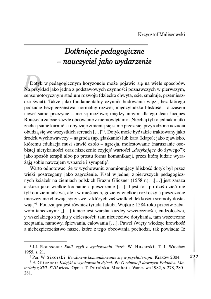 Krzysztof Maliszewski Dotknięcie pedagogiczne – nauczyciel jako wydarzenie D Dotyk w pedagogicznym horyzoncie może pojawić się na wiele sposobów. Na przykład jako jedna z podstawowych czynności poznawczych w pierwszym, sensomotorycznym stadium rozwoju (dziecko chwyta, ssie, smakuje, przemieszcza świat). Także jako fundamentalny czynnik budowania więzi, bez którego poczucie bezpieczeństwa, normalny rozwój, międzyludzka bliskość – a czasem nawet samo przeżycie – nie są możliwe; między innymi dlatego Jean Jacques Rousseau zalecał zażyłe obcowanie z niemowlętami: „Niechaj tylko jednak matki zechcą same karmić, a obyczaje zmienią się same przez się, przyrodzone uczucia obudzą się we wszystkich sercach […]”. Dotyk może być także traktowany jako środek wychowawczy – nagroda (np. głaskanie) lub kara (klaps); jako zjawisko, któremu edukacja musi stawić czoło – agresja, molestowanie (naruszanie osobistej nietykalności oraz niszczenie czyjejś wartości „dotykające do żywego”); jako sposób terapii albo po prostu forma komunikacji, przez którą ludzie wyrażają sobie nawzajem wsparcie i sympatię. Warto odnotować, że w wychowaniu znamionujący bliskość dotyk był przez wieki postrzegany jako zagrożenie. Pisał w jednej z pierwszych pedagogicznych książek na ziemiach polskich Erazm Gliczner (1558 r.): „[…] jest zaraza a skaza jako wielkie kochanie a pieszczenie […]. I jest to i po dziś dzień nie tylko u ziemiaństwa, ale i w mieściech, gdzie w wielkiej rozkoszy a pieszczocie mieszczanie chowają syny swe, z których zaś wielkich lekkości i sromoty dostawają”. Pouczająca jest również tyrada Jakuba Wujka z 1584 roku przeciw zabawom tanecznym: „[…] taniec iest warstat każdey wszeteczności, cudzołostwa, y wszelakiego zbytku y cielesności: tam nieuczciwe dotykania, tam wszeteczne szeptania, namowy, śpiewania, całowania […]. Paweł święty wiedząc krewkość a niebezpieczeństwo nasze, które z tego obcowania pochodzi, tak powiada: Iż J.J. R o u s s e a u : Emil, czyli o wychowaniu. Przeł. W. Husarski. T. 1. Wrocław 1955, s. 21. Por. W. S i k o r s k i : Bezsłowne komunikowanie się w psychoterapii. Kraków 2004. E. G l i c z n e r : Książki o wychowaniu dzieci. W: O edukacji dawnych Polaków. Materiały z XVI–XVII wieku. Oprac. T. D u r a l s k a - M a c h e t a. Warszawa 1982, s. 278, 280– 281. 211 dobra iest rzecz człowiekowi nie dotykać się niewiasty”. Hierarchiczne i militarne tradycje społeczne odzwierciedlone w poglądach edukacyjnych w dotyku (pieszczocie, łagodności) widziały czynnik zniewieścienia, czyli takiego zmiękczenia życia, które może okazać się zabójcze dla dyscypliny i storpedować posłuszeństwo – najistotniejszą wojskową i feudalną (oraz – dodajmy – technokratyczną) cnotę. Chodziło również o głęboko zakorzeniony w myśli europejskiej motyw antropologiczny. Jeśli ciało jest czymś pośledniejszym – więzieniem duszy (Platon), synonimem życia w grzechu (św. Paweł) – jeśli Jeckyll (rozum) musi nieustannie walczyć z Hydem (zmysłami, emocjami, popędami, impulsami podświadomości), dotyk – jako język ciała – musi znajdować się w stanie podejrzenia. Nie tylko zresztą asocjacja z seksualnością/utratą kontroli marginalizowała go w praktyce edukacyjnej. Prawdopodobnie istnieje dodatkowa przyczyna. „Akt dotyku – pisała Jolanta Brach-Czaina – zdaje się wyczerpywać we wzajemnym kontakcie i nie wymaga przedłużenia kulturowego. Doświadczenie dotyku niezbyt dobrze przekłada się na słowa, niezręcznie wyraża. Jest doraźne i jakby takim chciało pozostać, wyślizguje się spod zastępczych znaków i umyka wtórnym przywołaniom”. Ulokowane w przestrzeni symbolicznej kształcenie ma kłopot z fenomenem dotyku, jako że ten wyprowadza człowieka ze sfery refleksji w obszar bezpośredniego, pojęciowo nieuchwytnego doświadczenia. Aliści właśnie o osobiste doświadczenie, o transformujące przeżycie w wychowaniu chodzi – nawet jeśli nie potrafimy później dobrze tego opowiedzieć. Najgłębsze zdarzenia pedagogiczne mają charakter wstrząsu, przypominają religijną konwersję. Werner Jaeger tak opisywał Platońską paideię: „[…] kształcenie człowieka to nic innego jak właśnie ustawienie jego duszy w stosunku do źródła światła […]. Istota filozoficznego wychowania polega zatem na »odwróceniu się«, czyli na nawróceniu w pierwotnym, konkretnym znaczeniu tego wyrazu”. To, co przytrafiło się Szawłowi w drodze do Damaszku („olśniło go nagle światło z nieba” – por. Dz 9, 3), mogłoby stanowić alegorię wychowania. Często najwartościowsze przeżycia edukacyjne to spotkania, które porażają, obalają z nóg, olśniewają, oświecają, frapują, dają do myślenia, zakłócają spokój, zmieniają perspektywę. Bogdan Suchodolski w latach trzydziestych XX wieku ostrzegał, że przeceniamy w wychowaniu znaczenie techniki, i przypominał, że kształcenie dokonuje się nie na powierzchni zachowań, ale głęboko we wnętrzu człowieka, który odkrywa nieznane mu dotąd możliwości, „nawraca się”, doznaje wstrząsu. „Nie jest to – tłumaczył Suchodolski – zjawisko codzienne – ale to tylko, 212 J. Wu j e k : Wykład Pisma Świętego. Postilla catholica. Cz. 1. Komorów 1997, s. 241 (reprint: Kraków 1868–1870). J. B r a c h - C z a i n a : Błony umysłu. Warszawa 2003, s. 59–60. W. J a e g e r : Paideia. Formowanie człowieka greckiego. Przeł. M. Plezia, H. Bed nar e k . Warszawa 2001, s. 876. co sięga aż do korzeni naszej osobowości, jest trwałe. Tam zaś wewnątrz nie przenika technika, nie znaczy tam nic zręczność podejścia, chytrość wybrania chwili, chwyt wyuczony psychologią. Jakaś wielka idea widziana w płonącej duszy innego człowieka, czyjś entuzjazm i poświęcenie – oto, co wdziera się w głąb i […] dociera do jądra naszej oso