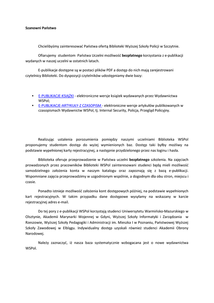 Szanowni Państwo Chcielibyśmy zainteresować Państwa ofertą Biblioteki Wyższej Szkoły Policji w Szczytnie. Ofiarujemy studentom Państwa Uczelni możliwość bezpłatnego korzystania z e-publikacji wydanych w naszej uczelni w ostatnich latach. E-publikacje dostępne są w postaci plików PDF a dostęp do nich mają zarejestrowani czytelnicy Biblioteki. Do dyspozycji czytelników udostępniamy dwie bazy: E-PUBLIKACJE-KSIĄŻKI - elektroniczne wersje książek wydawanych przez Wydawnictwa WSPol; E-PUBLIKACJE-ARTYKUŁY-Z CZASOPISM - elektroniczne wersje artykułów publikowanych w czasopismach Wydawnictw WSPol, tj. Internal Security, Policja, Przegląd Policyjny. Realizując ustalenia porozumienia pomiędzy naszymi uczelniami Biblioteka WSPol proponujemy studentom dostęp do wyżej wymienionych baz. Dostęp taki byłby możliwy na podstawie wypełnionej karty rejestracyjnej, a następnie przydzielonego przez nas loginu i hasła. Biblioteka oferuje przeprowadzenie w Państwa uczelni bezpłatnego szkolenia. Na zajęciach prowadzonych przez pracowników Biblioteki WSPol zainteresowani studenci będą mieli możliwość samodzielnego założenia konta w naszym katalogu oraz zapoznają się z bazą e-publikacji. Wspomniane zajęcia przeprowadzimy w uzgodnionym wspólnie, a dogodnym dla obu stron, miejscu i czasie. Ponadto istnieje możliwość założenia kont dostępowych później, na podstawie wypełnionych kart rejestracyjnych. W takim przypadku dane dostępowe wysyłamy na wskazany w karcie rejestracyjnej adres e-mail. Do tej pory z e-publikacji WSPol korzystają studenci Uniwersytetu Warmińsko-Mazurskiego w Olsztynie, Akademii Marynarki Wojennej w Gdyni, Wyższej Szkoły Informatyki i Zarządzania w Rzeszowie, Wyższej Szkoły Pedagogiki i Administracji im. Mieszka I w Poznaniu, Państwowej Wyższej Szkoły Zawodowej w Elblągu. Indywidualny dostęp uzyskali również studenci Akademii Obrony Narodowej. Należy zaznaczyć, iż nasza baza systematycznie wzbogacana jest o nowe wydawnictwa WSPol. WYKAZ E-PUBLIKACJI WYŻSZEJ SZKOŁY POLICJI W SZCZYTNIE (stan na 08.10.2015 r.) 1. Babiński A. (oprac.), Wybór aktów normatywnych z zakresu prawa policyjnego, Szczytno 2014. 2. Babiński A. (red.), 60 lat szkolnictwa policyjnego w Szczytnie (1954-2014), Szczytno 2014. 3. Bogdalski P., Cymerski J., Jałoszyński K. (red.), Bezpieczeństwo osób podlegających ustawowo ochronie wobec zagrożeń XXI wieku, Szczytno 2014. 4. Bogdalski P., Nepelski M. (red.), Nauki społeczne na rzecz bezpieczeństwa wewnętrznego, Szczytno 2014. 5. Bryk J. [et al.], Wybrane zagadnienia prawa karnego skarbowego, Szczytno 2014. 6. Bryk J., Handel ludźmi - wykorzystanie narzędzi analitycznych w procesie wykrywania sprawców, Szczytno 2014. 7. Dąbrowski M., Gudzbeler G., Urban A., Praktyczne aspekty wykorzystania symulatora działań policji w sytuacjach kryzysowych, Szczytno 2014. 8. Gałązka M., Kupiński R., Nowicka I., Kazusy do nauki prawa wykroczeń, Szczytno 2014. 9. Hryszkiewicz D., Suchanek P., Zarządzanie strategiczne w Policji. Teoria i praktyka, Szczytno 2014. 10. Jałoszyński K., Biuro Operacji Antyterrorystycznych Komendy Głównej Policji 1976-2014, Szczytno 2014. 11. Kalisz A., Prawo prasowe. Teoria i praktyka, Szczytno 2014. 12. Kobylas M., Analiza kryminalna dla studentów bezpieczeństwa wewnętrznego, Szczytno 2014. 13. Nepelski M., Gwarancje zarządzania kryzysowego. Wybrane zagadnienia, Szczytno 2014. 14. Sadło-Nowak A., Czynności wyjaśniające w sprawach o wykroczenia, Szczytno 2014. 15. Sokołowska E., Organizacje społeczne i kościelne na Warmii i Mazurach w latach 1848-1914, Szczytno 2014. 16. Struniawski J., Dowodzenie w trakcie operacji policyjnych w zakresie imprez masowych i zgromadzeń publicznych, Szczytno 2014. 17. Ścibiorek Z., Motywowanie w organizacjach publicznych, Szczytno 2014. 18. Truchan J., Jednostki specjalne Policji i Straży Granicznej w ochronie wschodniej granicy Polski, Szczytno 2014. 19. Tyburska A. (red.), Przygotowania obronne w policji. Wybrane zagadnienia i akty prawne, Szczytno 2014. 20. Zdrodowski B. (red.), Teoria zarządzania kryzysowego. Zarys, Szczytno 2014. 21. Zubrzycki W., Antyterrorystyczne formacje policji w przypadku zbrojnej agresji na RP, Szczytno 2014. 22. Bobińska H., Ojcewicz G., Kryminalistyka w Rosji i Polsce. Wybór tekstów z kryminalistyki do tłumaczenia z języka rosyjskiego i na język rosyjski, Szczytno 2013. 23. Chełchowski J. S., Systemy zarządzania jakością w instytucjach odpowiedzialnych za bezpieczeństwo publiczne na przykładzie służby zdrowia resortu spraw wewnętrznych, Szczytno 2013. 24. Czyżyk P., Zatrzymanie rzeczy, przeszukanie, sprawdzenie osoby, kontrola osobista - taktyka realizacji. Wybrane zagadnienia, Szczytno 2013. 25. Gałązka M., Kalisz A., Prawo karne materialne. Część ogólna. Tablice poglądowe, Szczytno 2013. 26. Gałązka M., Kupiński R., Nowicka I., Tablice do procesowego prawa wykroczeń, Szczytno 2013. 27. Gałązka M., Sadło-Nowak A., Pisma procesowe w postępowaniu w sprawach o wykroczenia. Wzory pism, Szczytno 2013. 28. Jałoszyński K. (red.), Współczesne zagrożenia terroryzmem, Szczytno 2013. 29. Janoszka K., Dzieci jako ofiary handlu ludźmi, Szczytno 2013. 30. Kasprzak J., Nielegalne wytwarzanie broni palnej i amunicji. Problematyka prawnokryminalistyczna, Szczytno 2013. 31. Łuka P. [et al.], Poradnik prewencyjny, Szczytno 2013. 32. Majer P., Ustawy polskiej policji (1791-2011). Źródła z komentarzem, Szczytno 2013. 33. Mocarska D., Przestępne nadużycie władzy przez funkcjonariuszy Policji w ujęciu prawnokarnym i kryminologicznym, Szczytno 2013. 34. Mocarska D., Wybrane zagadnienia prawa karnego materialnego, Szczytno 2013. 35. Nowicka I, Sadło-Nowak A. (red.), Współczesne problemy wykroczeń, Szczytno 2013. 36. Pływaczewski W., Płocki R. (red.), Nielegalny rynek żywności. Skala zjawiska i możliwości przeciwdziałania, Szczytno 2013. 37. Sadło-Nowak A., Ga