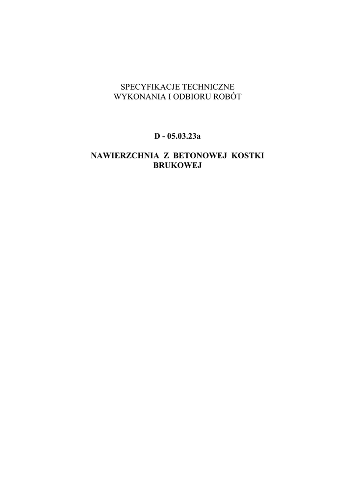 SPECYFIKACJE TECHNICZNE WYKONANIA I ODBIORU ROBÓT D - 05.03.23a NAWIERZCHNIA Z BETONOWEJ KOSTKI BRUKOWEJ D-05.03.23a Nawierzchnia z betonowej kostki brukowej dla dróg i ulic lokalnych oraz placów i chodników 2 SPIS TREŚCI 1. WSTĘP............................................................................................................................ 3 2. MATERIAŁY ................................................................................................................. 3 3. SPRZĘT .......................................................................................................................... 6 4. TRANSPORT ................................................................................................................. 6 5. WYKONANIE ROBÓT ................................................................................................ 7 6. KONTROLA JAKOŚCI ROBÓT .............................................................................. 10 7. OBMIAR ROBÓT ....................................................................................................... 12 8. ODBIÓR ROBÓT ........................................................................................................ 12 9. PODSTAWA PŁATNOŚCI ........................................................................................ 12 10. PRZEPISY ZWIĄZANE ............................................................................................. 19 11. ZAŁĄCZNIKI .........................................................................................................20 NAJWAŻNIEJSZE OZNACZENIA I SKRÓTY OST ST - ogólna specyfikacja techniczna - specyfikacja techniczna wykonania i odbioru robót D-05.03.23a Nawierzchnia z betonowej kostki brukowej dla dróg i ulic lokalnych oraz placów i chodników 3 1. WSTĘP 1.1. Przedmiot ST Przedmiotem niniejszej specyfikacji technicznej (ST) są wymagania dotyczące wykonania i odbioru robót drogowych związanych z modernizacją dróg wewnętrznych w kampusie PWSZ w Kaliszu. 1.2. Zakres stosowania ST Specyfikacja techniczna wykonania i odbioru robót stosowana jest jako dokument przetargowy i kontraktowy przy zlecaniu i realizacji robót wymienionych w punkcie 1.1. 1.3. Zakres robót objętych ST Ustalenia zawarte w niniejszej specyfikacji dotyczą zasad prowadzenia robót związanych z wykonaniem i odbiorem nawierzchni z betonowej kostki brukowej i obejmują: − wykonanie nawierzchni dróg manewrowych i parkingów − wykonanie nawierzchni chodników i ciągów pieszych 1.4. Określenia podstawowe 1.4.1. Betonowa kostka brukowa - prefabrykowany element budowlany, przeznaczony do budowy warstwy ścieralnej nawierzchni, wykonany metodą wibroprasowania z betonu niezbrojonego niebarwionego lub barwionego, jedno- lub dwuwarstwowego, charakteryzujący się kształtem, który umożliwia wzajemne przystawanie elementów. 1.4.2. Krawężnik - prosty lub łukowy element budowlany oddzielający jezdnię od chodnika, charakteryzujący się stałym lub zmiennym przekrojem poprzecznym i długością nie większą niż 1,0 m. 1.4.3. Ściek - umocnione zagłębienie, poniżej krawędzi jezdni, zbierające i odprowadzające wodę. 1.4.4. Obrzeże - element budowlany, oddzielający nawierzchnie chodników i ciągów pieszych od terenów nie przeznaczonych do komunikacji. 1.4.5. Spoina - odstęp pomiędzy przylegającymi elementami (kostkami) wypełniony określonymi materiałami wypełniającymi. 1.4.6. Szczelina dylatacyjna - odstęp dzielący duży fragment nawierzchni na sekcje w celu umożliwienia odkształceń temperaturowych, wypełniony określonymi materiałami wypełniającymi. 1.4.7. Pozostałe określenia podstawowe są zgodne z obowiązującymi, odpowiednimi polskimi normami i z definicjami podanymi w ST D-M-00.00.00 „Wymagania ogólne” [10] pkt 1.4. 1.5. Ogólne wymagania dotyczące robót Ogólne wymagania dotyczące robót podano w ST D-M-00.00.00 „Wymagania ogólne” [10] pkt 1.5. 2. MATERIAŁY 2.1. Ogólne wymagania dotyczące materiałów Ogólne wymagania dotyczące materiałów, ich pozyskiwania i składowania, podano w ST D-M-00.00.00 „Wymagania ogólne” [10] pkt 2. 2.2. Betonowa kostka brukowa 2.2.1. Klasyfikacja betonowych kostek brukowych Betonowa kostka brukowa może mieć następujące cechy charakterystyczne, określone w katalogu producenta: 1. odmiana: a) kostka jednowarstwowa (z jednego rodzaju betonu), b) kostka dwuwarstwowa (z betonu warstwy spodniej konstrukcyjnej i warstwy fakturowej (górnej) zwykle barwionej grubości min. 4mm, 2. gatunek, w zależności od wyglądu zewnętrznego, tj. od rodzaju, liczby i wielkości wad powierzchni, krawędzi i naroży: a) gatunek 1, b) gatunek 2, 3. klasa: a) klasa „50”, o wytrzymałości na ściskanie nie mniejszej niż 50 MPa, D-05.03.23a Nawierzchnia z betonowej kostki brukowej dla dróg i ulic lokalnych oraz placów i chodników 4 b) klasa „35”, o wytrzymałości na ściskanie nie mniejszej niż 35 MPa, 4. barwa: a) kostka szara, z betonu niebarwionego, b) kostka kolorowa, z betonu barwionego (zwykle pigmentami nieorganicznymi), 5. wzór (kształt) kostki: zgodny z kształtami określonymi przez producenta (przykłady podano w załączniku 1), 6. wymiary, zgodne z wymiarami określonymi przez producenta, w zasadzie: a) długość: od 140 mm do 280 mm, b) szerokość: od 0,5 do 1,0 wymiaru długości, lecz nie mniej niż 100 mm, c) grubość: od 55 mm do 140 mm, przy czym zalecanymi grubościami są: 60 mm, 80 mm i 100 mm. Pożądane jest, aby wymiary kostek były dostosowane do sposobu układania i siatki spoin oraz umożliwiały wykonanie warstwy o szerokości 1,0 m lub 1,5 m bez konieczności przecinania elementów w trakcie ich wbudowywania w nawierzchnię. 2.2.2. Wymagania techniczne stawiane betonowym kostkom brukowym Betonowa kostka brukowa powinna posiadać aprobatę techniczną, wydaną przez uprawnioną jednostkę (Instytut Badawczy Dróg i Mostów). Betonow