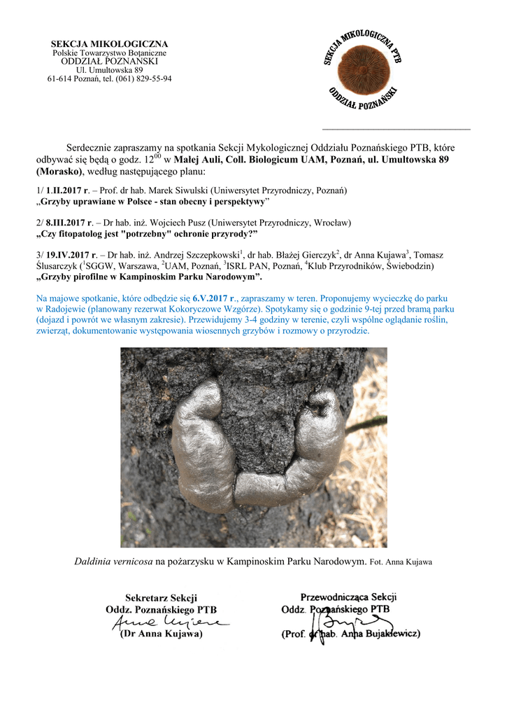 SEKCJA MIKOLOGICZNA Polskie Towarzystwo Botaniczne ODDZIAŁ POZNAŃSKI Ul. Umultowska 89 61-614 Poznań, tel. (061) 829-55-94 _____________________________ Serdecznie zapraszamy na spotkania Sekcji Mykologicznej Oddziału Poznańskiego PTB, które odbywać się będą o godz. 1200 w Małej Auli, Coll. Biologicum UAM, Poznań, ul. Umultowska 89 (Morasko), według następującego planu: 1/ 1.II.2017 r. – Prof. dr hab. Marek Siwulski (Uniwersytet Przyrodniczy, Poznań) „Grzyby uprawiane w Polsce - stan obecny i perspektywy” 2/ 8.III.2017 r. – Dr hab. inż. Wojciech Pusz (Uniwersytet Przyrodniczy, Wrocław) „Czy fitopatolog jest "potrzebny" ochronie przyrody?” 3/ 19.IV.2017 r. – Dr hab. inż. Andrzej Szczepkowski1, dr hab. Błażej Gierczyk2, dr Anna Kujawa3, Tomasz Ślusarczyk (1SGGW, Warszawa, 2UAM, Poznań, 3ISRL PAN, Poznań, 4Klub Przyrodników, Świebodzin) „Grzyby pirofilne w Kampinoskim Parku Narodowym”. Na majowe spotkanie, które odbędzie się 6.V.2017 r., zapraszamy w teren. Proponujemy wycieczkę do parku w Radojewie (planowany rezerwat Kokoryczowe Wzgórze). Spotykamy się o godzinie 9-tej przed bramą parku (dojazd i powrót we własnym zakresie). Przewidujemy 3-4 godziny w terenie, czyli wspólne oglądanie roślin, zwierząt, dokumentowanie występowania wiosennych grzybów i rozmowy o przyrodzie. Daldinia vernicosa na pożarzysku w Kampinoskim Parku Narodowym. Fot. Anna Kujawa