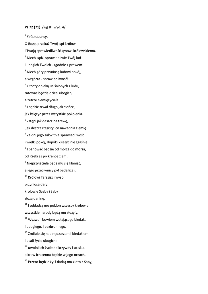 Ps 72 (71) /wg BT wyd. 4/ 1 Salomonowy. O Boże, przekaż Twój sąd królowi i Twoją sprawiedliwość synowi królewskiemu. 2 Niech sądzi sprawiedliwie Twój lud i ubogich Twoich - zgodnie z prawem! 3 Niech góry przyniosą ludowi pokój, a wzgórza - sprawiedliwość! 4 Otoczy opieką uciśnionych z ludu, ratować będzie dzieci ubogich, a zetrze ciemiężyciela. 5 I będzie trwał długo jak słońce, jak księżyc przez wszystkie pokolenia. 6 Zstąpi jak deszcz na trawę, jak deszcz rzęsisty, co nawadnia ziemię. 7 Za dni jego zakwitnie sprawiedliwość i wielki pokój, dopóki księżyc nie zgaśnie. 8 I panować będzie od morza do morza, od Rzeki aż po krańce ziemi. 9 Nieprzyjaciele będą mu się kłaniać, a jego przeciwnicy pył będą lizali. 10 Królowi Tarszisz i wysp przyniosą dary, królowie Szeby i Saby złożą daninę. 11 I oddadzą mu pokłon wszyscy królowie, wszystkie narody będą mu służyły. 12 Wyzwoli bowiem wołającego biedaka i ubogiego, i bezbronnego. 13 Zmiłuje się nad nędzarzem i biedakiem i ocali życie ubogich: 14 uwolni ich życie od krzywdy i ucisku, a krew ich cenna będzie w jego oczach. 15 Przeto będzie żył i dadzą mu złoto z Saby, zawsze będą się modlić za niego, nieustannie mu błogosławić. 16 Obfitość zboża niech będzie na ziemi, szczyty gór niech zaszumią lasami! Jak Liban [niech wzrasta] plon jego, niech zakwitną jego łodygi jak polna trawa! 17 Imię jego niech trwa na wieki; jak długo świeci słońce, niech wzrasta jego imię! Niech się wzajemnie nim błogosławią! Niech wszystkie narody ziemi życzą mu szczęścia! 18 Błogosławiony Pan, Bóg Izraela, który sam jeden czyni cuda! 19 Błogosławione na wieki chwalebne Jego imię; niech się cała ziemia napełni Jego chwałą! Niech się tak stanie - niech się stanie! 20 (Skończyły się modlitwy Dawida, syna Jessego). O Boże, przekaż swój sąd królowi. W historycznym kontekście Izraela Psalm 72 mógłby powstać jako modlitwa za króla z okazji jego intronizacji, ale tradycja, zarówno żydowska, jak i Kościoła, uważa go za psalm poświęcony mesjańskiemu królowi i jego królestwu. Ono ma rozciągać się „aż po krańce świata” i trwać „długo jak słońce”. Mesjańskie rządy zapewnią ludowi sprawiedliwość i pokój, ochronę uciemiężonych i ubogich, bezpieczeństwo od nieprzyjaciół wewnętrznych i zewnętrznych. Zstąpi jak deszcz na trawę. Deszcz przynosi obfitość wody, a ta oznacza życie dla wszystkiego, co żyje. Deszcz jest błogosławieństwem Boga. Przynosi wzrost roślinom i zapewnia pokarm ludziom i zwierzętom. I takim też błogosławieństwem życia będzie przyjście Mesjasza. Jezus powiedział do Samarytanki przy źródle: „Kto zaś będzie pił wodę, którą Ja mu dam, nie będzie pragnął na wieki” (J 4,14). Panować będzie od morza do morza. Powszechne panowanie mesjańskiego króla obejmie wszystkie narody. Ich królowie oddadzą mu pokłon, czyli zwyczajem wschodnim uznają Jego władzę i będą mu służyć. Nieprzyjaciele zostaną pokonani. Podobnie Apokalipsa św. Jana zapowiada ostateczne zwycięstwo Boga i trwały pokój Jego królestwa (zob. Ap 20). Niech się wzajemnie nim błogosławią! Przywołując imię Mesjasza w życzeniach, prosi się o nadejście Jego królestwa, a zatem też wszystkich dobrodziejstw, w które ono będzie obfitować. „Przyjdź, Panie Jezu” (Ap 22,20c). Uwielbienie Boga, które znajduje się w Ps 72,18-19, jak też informacja w w.20, stanowi zakończenie drugiej części Psałterza (Ps 42-72). Panie Jezu, oczekujemy Twego przyjścia w chwale, niech nastanie Twoje królestwo pokoju, sprawiedliwosci, dobra i miłości bez końca. Który żyjesz i królujesz na wieki wieków. Amen. o. Michał Baranowski OFMConv