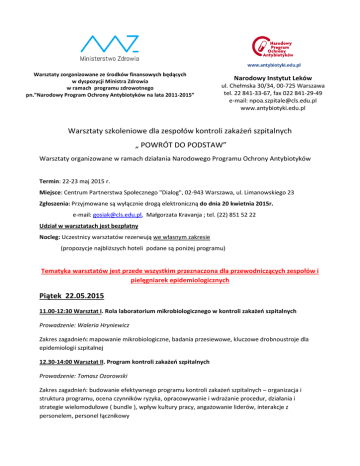 Warsztaty zorganizowane ze środków finansowych będących w dyspozycji Ministra Zdrowia w ramach programu zdrowotnego pn.”Narodowy Program Ochrony Antybiotyków na lata 2011-2015” Narodowy Instytut Leków ul. Chełmska 30/34, 00-725 Warszawa tel. 22 841-33-67, fax 022 841-29-49 e-mail: [email protected] www.antybiotyki.edu.pl Warsztaty szkoleniowe dla zespołów kontroli zakażeń szpitalnych „ POWRÓT DO PODSTAW” Warsztaty organizowane w ramach działania Narodowego Programu Ochrony Antybiotyków Termin: 22-23 maj 2015 r. Miejsce: Centrum Partnerstwa Społecznego "Dialog", 02-943 Warszawa, ul. Limanowskiego 23 Zgłoszenia: Przyjmowane są wyłącznie drogą elektroniczną do dnia 20 kwietnia 2015r. e-mail: [email protected], Małgorzata Kravanja ; tel. (22) 851 52 22 Udział w warsztatach jest bezpłatny Nocleg: Uczestnicy warsztatów rezerwują we własnym zakresie (propozycje najbliższych hoteli podane są poniżej programu) Tematyka warsztatów jest przede wszystkim przeznaczona dla przewodniczących zespołów i pielęgniarek epidemiologicznych Piątek 22.05.2015 11.00-12:30 Warsztat I. Rola laboratorium mikrobiologicznego w kontroli zakażeń szpitalnych Prowadzenie: Waleria Hryniewicz Zakres zagadnień: mapowanie mikrobiologiczne, badania przesiewowe, kluczowe drobnoustroje dla epidemiologii szpitalnej 12.30-14:00 Warsztat II. Program kontroli zakażeń szpitalnych Prowadzenie: Tomasz Ozorowski Zakres zagadnień: budowanie efektywnego programu kontroli zakażeń szpitalnych – organizacja i struktura programu, ocena czynników ryzyka, opracowywanie i wdrażanie procedur, działania i strategie wielomodułowe ( bundle ), wpływ kultury pracy, angażowanie liderów, interakcje z personelem, personel łącznikowy 14.00-15:00 Przerwa obiadowa 15.00-16.30 Warsztat III. Monitorowanie zakażeń szpitalnych Prowadzenie: Aleksander Deptuła Zakres zagadnień: ustalanie priorytetów monitorowania zakażeń w szpitalu, monitorowanie zakażeń w OAiIT, monitorowanie zakażeń chirurgicznych, badania punktowe PPS 16.30-16:45 Przerwa kawowa 16:45-18:15 Warsztat IV. Zakażenia w wybranych obszarach szpitala Prowadzenie: Agnieszka Misiewska- Kaczur, Marleta Zienkiewicz Zakres zagadnień: Oddział Intensywnej Terapii, blok operacyjny 18.15-19.15. Warsztat V. Kluczowe zagadnienia dla kontroli zakażeń szpitalnych: pytania, odpowiedzi Prowadzenie: Wszyscy prelegenci Można sugerować poruszenie dodatkowych tematów a także nadsyłać pytania przed warsztatami na adres e-mail: [email protected] Sobota 23.05.2015 8.30-10:00 Warsztat VI. Rola środowiska szpitalnego w kontroli zakażeń szpitalnych Prowadzenie: Małgorzata Fleischer Zakres zagadnień: dezynfekcja czy mycie – kryteria wyboru, dekontaminacja powierzchni dotykowych, zintensyfikowana dekontaminacja pomieszczeń po pacjencie poddanym izolacji, techniki specjalne (rola nadtlenku wodoru, powierzchnie z dodatkiem substancji anty-bakteryjnych, metody kontroli sprzątania) 10:15-11.45 Warsztat VII. Izolacja chorych Prowadzenie: Marta Wróblewska Zakres zagadnień: aspekty techniczne izolacji kontaktowej, oddechowej, izolacja ochronna, analiza wskazań do izolacji: priorytety w szpitalach z ograniczoną liczbą sal izolacyjnych, używanie i nadużywanie środków ochrony osobistej 12:00-13:30 Warsztat VIII. Zakażenia związanie z liniami naczyniowymi Prowadzenie: Małgorzata Giemza, Tomasz Ozorowski Zakres zagadnień: profilaktyka zakażeń związanych z linią naczyniową centralną, linią naczyniową obwodową oraz liniami długoterminowymi , diagnostyka i monitorowanie zakażeń odcewnikowych. Warsztaty poprowadzą następujący specjaliści: Prof. dr hab. med. Waleria Hryniewicz Zakład Epidemiologii i Mikrobiologii Klinicznej Narodowy Instytut Leków Centralny Ośrodek Badań Jakości w Diagnostyce Mikrobiologicznej Dr n. med. Małgorzata Fleischer Katedra Mikrobiologii Wydział Lekarski, Uniwersytet Medyczny we Wrocławiu Mgr Małgorzata Giemza Zespół kontroli zakażeń szpitalnych Instytut Hematologii i Transfuzjologii w Warszawie Dr n. med. Agnieszka Misiewska-Kaczur Zespół Zakładów Opieki Zdrowotnej Szpital Śląski w Cieszynie Oddział Anestezjologii I Intensywnej Terapii Dr hab. n. med. Marta Wróblewska Zakład Mikrobiologii Stomatologicznej, Warszawski Uniwersytet Medyczny Zakład Mikrobiologii, Samodzielny Publiczny Centralny Szpital Kliniczny w Warszawie Instytut Hematologii i Transfuzjologii w Warszawie Samodzielny Publiczny Kliniczny Szpital Okulistyczny w Warszawie Dr n. med. Marleta Zienkiewicz Zachodniopomorskie Centrum Onkologii w Szczecinie SP ZOZ Szpital MSW w Szczecinie Dr n. med. Aleksander Deptuła Katedra i Zakład Mikrobiologii Collegium Medicum im. Ludwika Rydygiera w Bydgoszczy, Uniwersytet Mikołaja Kopernika Szpital Uniwersytecki nr 1 im. dr Antoniego Jurasza w Bydgoszczy Dr n. med. Tomasz Ozorowski Przewodniczący zespołu kontroli zakażeń szpitalnych Szpital Kliniczny Przemienia Pańskiego Uniwersytetu Karola Marcinkowskiego w Poznaniu Szpital Wojewódzki w Poznaniu LISTA HOTELI: Aramis, ul. Mangalia, 22 207 81 00, 22 207 80 50, http://www.hotelaramis.pl/ Atos, ul. Mangalia 22 207 70 00, 22 207 71 00, http://www.hotelatos.pl/ Portos, ul. Mangalia 22 207 60 00, 22 207 61 00, http://www.bwportos.pl/ Centrum Konferencyjno-Szkoleniowe Fundacji Nowe Horyzonty, ul. Bobrowiecka 9, 22 559 22 01, http://centrumkonferencyjne.com.pl/ Centrum Dialog, ul. Limanowskiego 23, 22 380 50 50, 22 380 50 00, http://www.cpsdialog.pl/ Karat, ul. Słoneczna 37, 22 60 144 11, 22 60 106 21, http://www.hotelkarat.pl/ Reytan, ul. Rejtana 6, 22 201 64 00, http://www.reytan.pl/ Sokrates, ul. Smyczkowa 9, 22 553 35 00, http://www.hotelsokrates.uw.edu.pl/