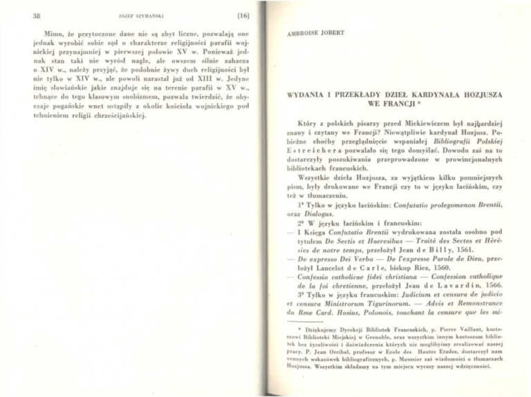 38 JÓ ZEF SZYM AŃ SK I 116] Mimo, że przytoczone dane nie są zbyt liczne, pozwalają one jednak wyrobić sobie sąd o charakterze religijności parafii w oj nickiej przynajmniej w pierwszej połowie X V w. Ponieważ jed nak stan taki nie wyrósł nagle, ale owszem silnie zahacza o X IV w., należy przyjąć, że podobnie żywy duch religijności był nie tylko w X IV w., ale pow oli narastał już od X III w. Jedyne imię słowiańskie jakie znajduje się na terenie parafii w X V w., tchnące do tego klasowym snobizmem, pozwala twierdzić, że oby czaje pogańskie wnet ustąpiły z okolic kościoła wojnickiego pod tchnieniem religii chrześcijańskiej. AMBROISE JOBERT W YDAN IA I PRZEKŁADY DZIEŁ K A RD Y N AŁA HOZJUSZA. WE FR AN CJI* Który z polskich pisarzy przed Mickiewiczem był najbardziej znany i czytany we Francji? Niewątpliwie kardynał Hozjusz. P o bieżne choćby przeglądnięcie wspaniałej Bibliografii Polskiej E s t r e i c h e r a pozwalało się tego domyślać. Dowodu zaś na to dostarczyły poszukiwania przeprowadzone w prowincjonalnych bibliotekach francuskich. Wszystkie dzieła Hozjusza, za wyjątkiem kilku pomniejszych pism, były drukowane we Francji czy to w języku łacińskim, czy też w tłumaczeniu. 1° Tylko w języku łacińskim: Confutatio prolegomenon Brentii, oraz Dialogus. 2° W języku łacińskim i francuskim: — I Księga Confutatio Brentii wydrukowana została osobno pod tytułem De Sectis et Haeresibus — Traite des Sectes et Heresies de notre temps, przełożył Jean d e B i 11 y, 1561. — De expresso Dei Verbo — De Vexpresse Parole de Dieu, prze łożył Lancelot d e C a r 1 e, biskup Riez, 1560. — Confessio catholicae fidei christiana — Confession catholiąue de la foi chretienne, przełożył Jean d e L a v a r d i n, 1566. 3° Tylko w języku francuskim: Judicium et censura de judicio et censura Ministrorum Tigurinorum. — Advis et Remonstrance du Rme Card. Hosius, Polonois, touchant la censure que les mi* Dziękujem y D yrekcji B ib liotek Francuskich, p. P ierre Y aillant, kusto szowi B iblioteki M iejskiej w G renoble, oraz wszystkim innym kustoszom b ib lio tek bez życzliw ości i dośw iadczenia których nie m oglibyśm y zrealizow ać naszej pracy. P. Jean O rcibal, p rofesor w E cole des Hautes Etudes, dostarczył nam cennych wskazówek b ib liograficzn ych , p. Maussier zaś w iadom ości o tłum aczach Hozjusza. W szystkim składamy na tym m iejscu wyrazy naszej w dzięczności. 40 AM BKOISE JO BERT [21 nistres de Zurich et de Heildebergue ont donnee sur la doctrine nagueres publiee en Poloigne contrę la Trinite, przełożył Nicolas C h e s n e a u, 1573 (?). Krakowskie wydanie Confessio z r. 1553 nie znalazło jak się zdaje rozpowszechnienia we Francji. Nie napotkaliśmy bowiem na żaden egzemplarz. Ale począwszy od r. 1557 zaczynają docierae wydania niemieckie: wydanie z r. 1557 w Dillingen, oraz rozsze rzone wydanie mogunckie z tego samego roku, a także pierwsze wydanie De expresso Dei verbo, Dillingen 1558 *. Paryski zaś wydawca, Foucher, zamawia w r. 1559 u Cholina, w Kolonii, część wydania Confutatio Brentii, sam natomiast dru kuje osobno księgę I De Sectis, która stoi na czele listy dzieł Hozjusza, jakie wyszły spod francuskich pras. W nawiasach po dajemy bibliotekę, z której egzemplarza korzystaliśmy. Wydawcy., jeśli nie zaznaczono inaczej, są paryscy. 1559 Foucher, De Sectis (Grenoble) 1560 Foucher, De Sectis, wyd. 2 (id.) Desboys i Nivelle, Confutatio (Yersailles) 2 Petit, Confessio (Lyon) Fremy, Puteanus, Confessio * Buon, De expresso Dei verbo (Troyes) Foucher, De expresso Dei verbo 4 Vascosan, De Vexpresse Parole de Dieu, tłum. Carle (Amiens) 5 1561 Vascosan, Chesneau, Sectes et heresies, tłum. Billy 6 Fremy, Confessio (Bibl. Nationale) Foucher, De expresso + Dialogus (Lyon) 1562 To samo, wydawcy Buon, Fremy (Bibl. Nation.) 7 Vascosan, Expresse parole, wyd. 2 (Troyes) 8 Cavellat, Desboys, Gorbin, Nivelle: Opera: Confessio + De 1 Te trzy wydania znajdują się w G renoble. 2 N iew ym ienione w B ibliografii P olskiej E s t r e i c h e r a . 3 Zob. E s t r e i c h e r , Bibliografia Polska. 4 Por. przypisek 3. 5 Por. przypisek 2. 6 P or. przypisek 3. 7 P or. przypisek 2. 8 P or. przypisek 2. [31 W Y D A N IA I PR ZE K ŁA D Y D ZIE Ł H OZJUSZA WE FRAN CJI 41 Sectis + De expresso + Dialogus 9 Puteanus, Confessio 10 Rouillie w Lyonie, Confessio (Avignon) 11 1564 Desboys, Sectes et h eresies12 Rouillie w Lyonie, Opera t. I Confessio, przedruk, t. II Confutatio Brentii + De expresso + Dialogus (Avignon)13 1566 Fremy, Confession, tłum. Lavardin (Grenoble) 14 1567 Rouillie w Lyonie: Confutatio + De expresso + Dialogus 15 Tronaesius w Anvers, Sectes et heresies 16 1568 Nivelle, Sectes et heresies 17 1573 Jean de Foigny, w Reims, Advis touchant la Censure, tłum. Chesneau (Reims) 1579 Chesneau, Confession + Sectes + Expresse Parole 1666 kol. (Lyon) 1583 id., Defense de la fo y et religion chrestienne, przedruk zbioru poprzedniego (id.) 18 Liczba wydań w języku łacińskim i francuskim jest następu jąca: Confessio razem 10 7 3 Confutatio 3 3 De Sectis 10 3 7 De expresso 6 4 10 Dialogus 4 4 Judicium 1 1 23 15 W całości więc 38 wydań dzieł Hozjusza we Francji w ciągu 24 lat! Tak wielkie powodzenie tłumaczy się tym, że Kościół we Francji od śmierci Clichtove’ a do czasu wystąpienia Du Perrona 9 Cavelat (L yon ), Desboys (Bibl. N ation.), Gorbin 10 P or. przypisek 3. 11 Por. przypisek 2. 12 Por. przypisek 3. 13 Por. przypisek 2. 14 Egzemplarz z Grandę Chartreuse. • 15 Por. przypisek 2. 16 Por. przypisek 3. 17 Por. przypisek 3. Por. przypisek 2. (P au ), N ivelle (P au). 42 AM BRO ISE JO BERT [4 ] [5 ] „T oi qui, mai asseure vas par le bon chemin Craignant de t’ esgarer de la foy chrestienne; Toy qui t’ es devoye de la reigle ancienne Goustant des seducteurs le mieleux venin Z wydań łacińskich zaczerpnąć możemy tylko jedną intere sującą wiadomość: wydanie w 