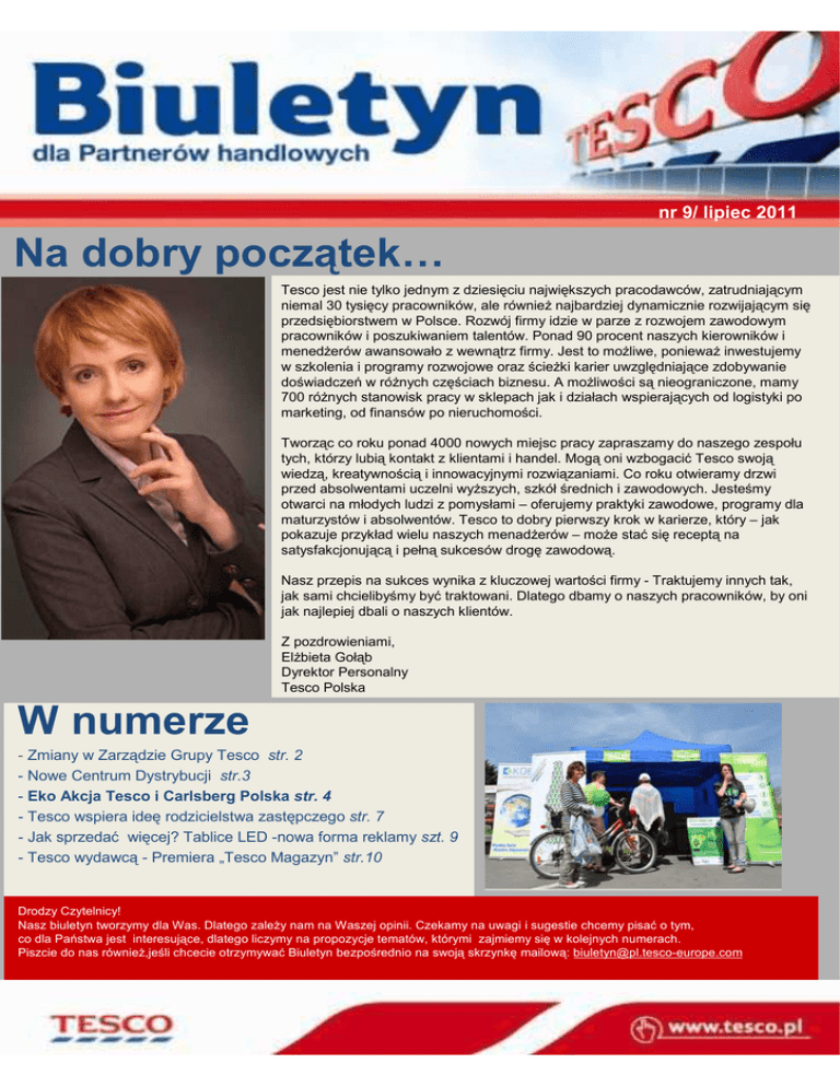 nr 9/ lipiec 2011 Na dobry początek… Tesco jest nie tylko jednym z dziesięciu największych pracodawców, zatrudniającym niemal 30 tysięcy pracowników, ale równieŜ najbardziej dynamicznie rozwijającym się przedsiębiorstwem w Polsce. Rozwój firmy idzie w parze z rozwojem zawodowym pracowników i poszukiwaniem talentów. Ponad 90 procent naszych kierowników i menedŜerów awansowało z wewnątrz firmy. Jest to moŜliwe, poniewaŜ inwestujemy w szkolenia i programy rozwojowe oraz ścieŜki karier uwzględniające zdobywanie doświadczeń w róŜnych częściach biznesu. A moŜliwości są nieograniczone, mamy 700 róŜnych stanowisk pracy w sklepach jak i działach wspierających od logistyki po marketing, od finansów po nieruchomości. Tworząc co roku ponad 4000 nowych miejsc pracy zapraszamy do naszego zespołu tych, którzy lubią kontakt z klientami i handel. Mogą oni wzbogacić Tesco swoją wiedzą, kreatywnością i innowacyjnymi rozwiązaniami. Co roku otwieramy drzwi przed absolwentami uczelni wyŜszych, szkół średnich i zawodowych. Jesteśmy otwarci na młodych ludzi z pomysłami – oferujemy praktyki zawodowe, programy dla maturzystów i absolwentów. Tesco to dobry pierwszy krok w karierze, który – jak pokazuje przykład wielu naszych menadŜerów – moŜe stać się receptą na satysfakcjonującą i pełną sukcesów drogę zawodową. Nasz przepis na sukces wynika z kluczowej wartości firmy - Traktujemy innych tak, jak sami chcielibyśmy być traktowani. Dlatego dbamy o naszych pracowników, by oni jak najlepiej dbali o naszych klientów. Z pozdrowieniami, ElŜbieta Gołąb Dyrektor Personalny Tesco Polska W numerze - Zmiany w Zarządzie Grupy Tesco str. 2 - Nowe Centrum Dystrybucji str.3 - Eko Akcja Tesco i Carlsberg Polska str. 4 - Tesco wspiera ideę rodzicielstwa zastępczego str. 7 - Jak sprzedać więcej? Tablice LED -nowa forma reklamy szt. 9 - Tesco wydawcą - Premiera „Tesco Magazyn” str.10 Drodzy Czytelnicy! Nasz biuletyn tworzymy dla Was. Dlatego zaleŜy nam na Waszej opinii. Czekamy na uwagi i sugestie chcemy pisać o tym, co dla Państwa jest interesujące, dlatego liczymy na propozycje tematów, którymi zajmiemy się w kolejnych numerach. Piszcie do nas równieŜ,jeśli chcecie otrzymywać Biuletyn bezpośrednio na swoją skrzynkę mailową: [email protected] Wiadomości z Firmy Nowy Prezes Grupy Tesco Z początkiem marca nastąpiły zmiany w zarządzie Grupy Tesco. Philip Clarke objął stanowisko Prezesa Zarządu Grupy Tesco. Zastąpił Terrego Leahy, który piastował to tę funkcję przez 14 lat. Przez ten czas firma znacznie się rozwinęła, odnosząc wiele sukcesów. Philip Clarke jest związany z Tesco od 36 lat. Jego doświadczenie i energia gwarantują dalszy rozwój i umacnianie pozycji Tesco na świecie. Podsumowanie roku finansowego Ubiegłoroczne wyniki Tesco Polska podsumowane. Za najwaŜniejsze osiągnięcia 2010 uznano wprowadzenie marki Tesco Extra, zwiększenie udziałów we wszystkich formatach sklepów i ponad 3 miliony uczestników programu Clubcard. Obroty Tesco za rok finansowy 2010/11 wyniosły 11,5 mld zł (10,1 mld zł bez VAT), co oznacza wzrost w porównaniu z ubiegłym rokiem o 9,1%. Liczba klientów odwiedzających sklepy Tesco wzrosła do 5 milionów tygodniowo. „Jesteśmy najbardziej wszechstronną siecią handlową w Polsce” – powiedział Ryszard Tomaszewski, prezes Tesco Polska. „Wiemy, Ŝe oczekiwania klientów i moŜliwości prowadzenia działalności handlowej są róŜne w róŜnych miejscach. Dlatego otwieramy zarówno małe,• osiedlowe w sklepy, jak i tradycyjne hipermarkety. Stale widzimy teŜ miejsce na innowacje. Dlatego w 2010 pojawił się format Tesco Extra, a w 2011 ruszamy ze sprzedaŜą przez internet” – dodał. Tesco jako jedyna sieć na polskim rynku otwierała w 2010 roku placówki handlowe róŜnych formatów – od supermarketów o powierzchni 400 mkw. po hipermarkety z galeriami handlowymi o powierzchni 16000 mkw. Debiutujący w ubiegłym roku na polskim rynku koncept Tesco Extra oferuje wyjątkowo szeroki wybór produktów – 45 tys. linii - oraz serwisy dodatkowe, takie jak optyk, punkt foto, telefonia i drogeria. Poszerzyła się gama produktów marki własnej. W 2010 roku pojawiło się 450 nowych linii, w tym wyroby pod marką Tesco Finest. Z 5200 do 9700 powiększyła się oferta produktów regionalnych, pochodzących od lokalnych dostawców i dostępnych tylko w wybranych sklepach regionu. Nagrodzeni za ekologię Tesco po raz kolejny docenione za podejście do troski o środowisko. Czytelnicy Reader’s Digest biorący udział w badaniu European Trusted Brand uznali Tesco za najbardziej przyjazną środowisku sieć handlową. Firma wygrała nie tylko w Polsce, ale takŜe w Czechach i na Węgrzech. European Trusted Brands jest największym europejskim badaniem konsumenckim, mającym na celu określenie stopnia zaufania Europejczyków do wartości, instytucji i marek produktów. W tym roku w badaniu wzięła udział rekordowa jak dotąd grupa 586 593 respondentów. SondaŜ przeprowadzono w październiku ubiegłego roku, juŜ po raz jedenasty w 16 krajach Europy. Wiadomości z Dystrybucji Nowe centrum dystrybucji tuŜ przed otwarciem Szybsze i sprawne dostawy Trwają ostatnie przygotowania do uruchomienia nowego centrum dystrybucyjnego Tesco w Gliwicach. Centrum Dystrybucji w pierwszej fazie swoją działalność rozpocznie od uruchomienia części magazynu ŚwieŜej śywności oraz sekcji wspomagających tj. myjni opakowań czy warsztatu dla floty transportowej. Otwarcie magazynu jest duŜym wydarzeniem nie tylko w Ŝyciu firmy, ale i całego regionu. Obiekt został wybudowany obok autostrady A4 i waŜnego węzła komunikacyjnego Gliwice-Sośnica. Powierzchnia działki, na której wzniesiony został magazyn, wynosi ponad 130 000 m² i znajduje się na terenie Specjalnej Strefy Ekonomicznej, natomiast sama hala zajmuje 57.000 m² .Pracę w Centrum znajdzie pona